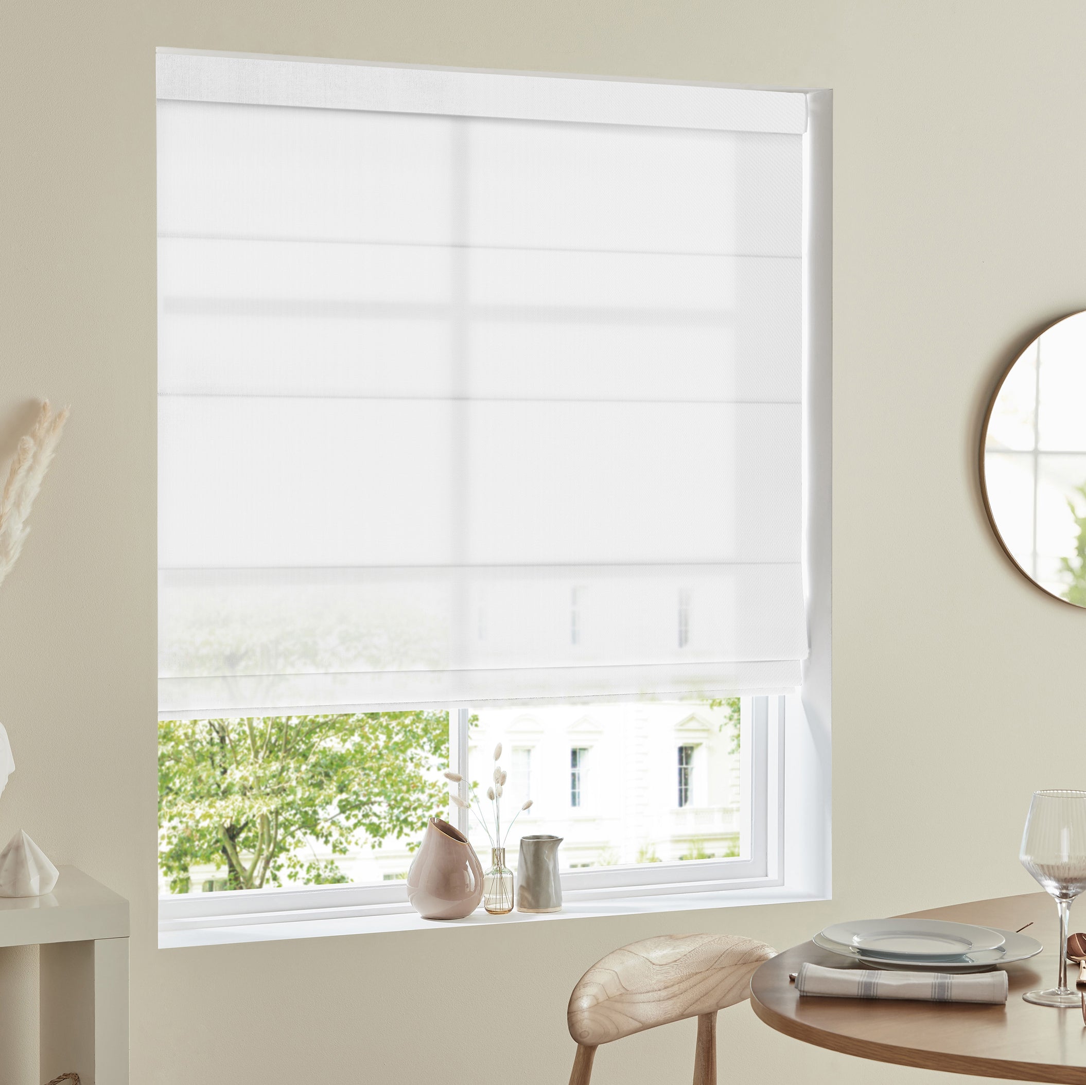 The Felicity made to measure voile roman blind can be ordered in a selection of calming neutral tones, the sheer 100% polyester fabric is the perfect choice to create a stylish look which maximises light in the spring and summer months whilst adding privacy to the space.