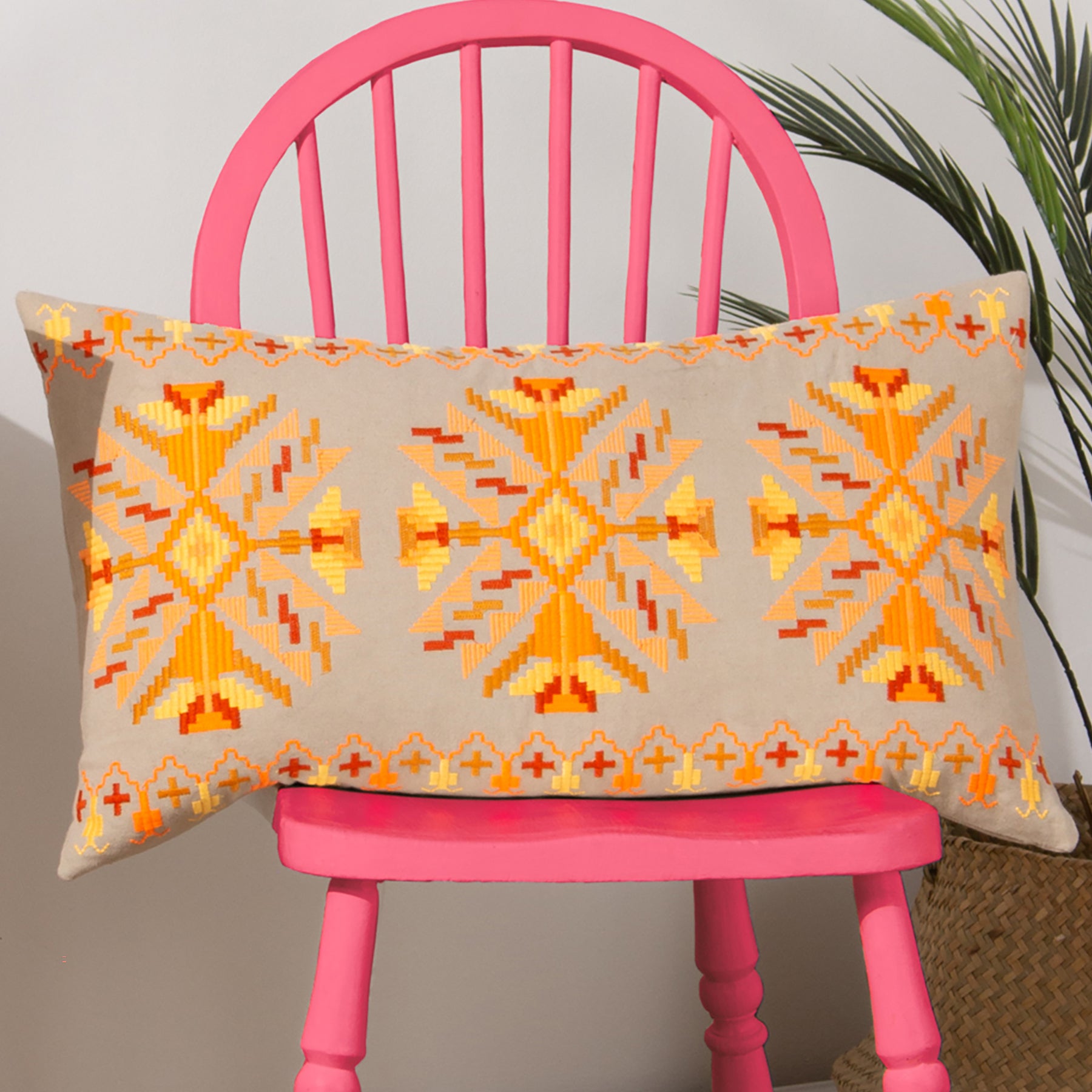 The Kalina cushion boasts a mesmerising display of neon geometric embroidery, expertly crafted by hand and enhanced by a striking patterned border. A vibrant addition to any home, this stunning piece brings colour and liveliness to any space.