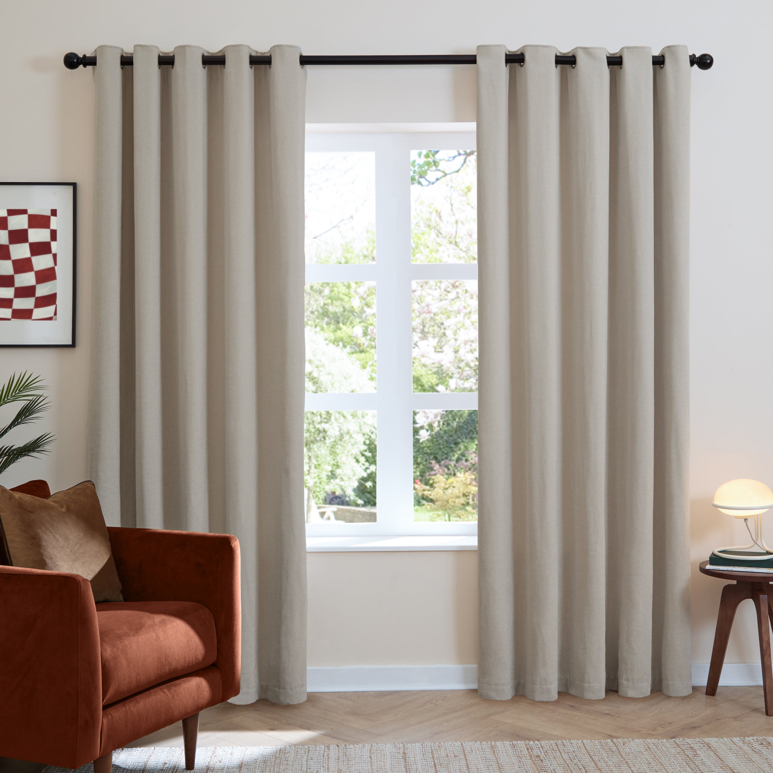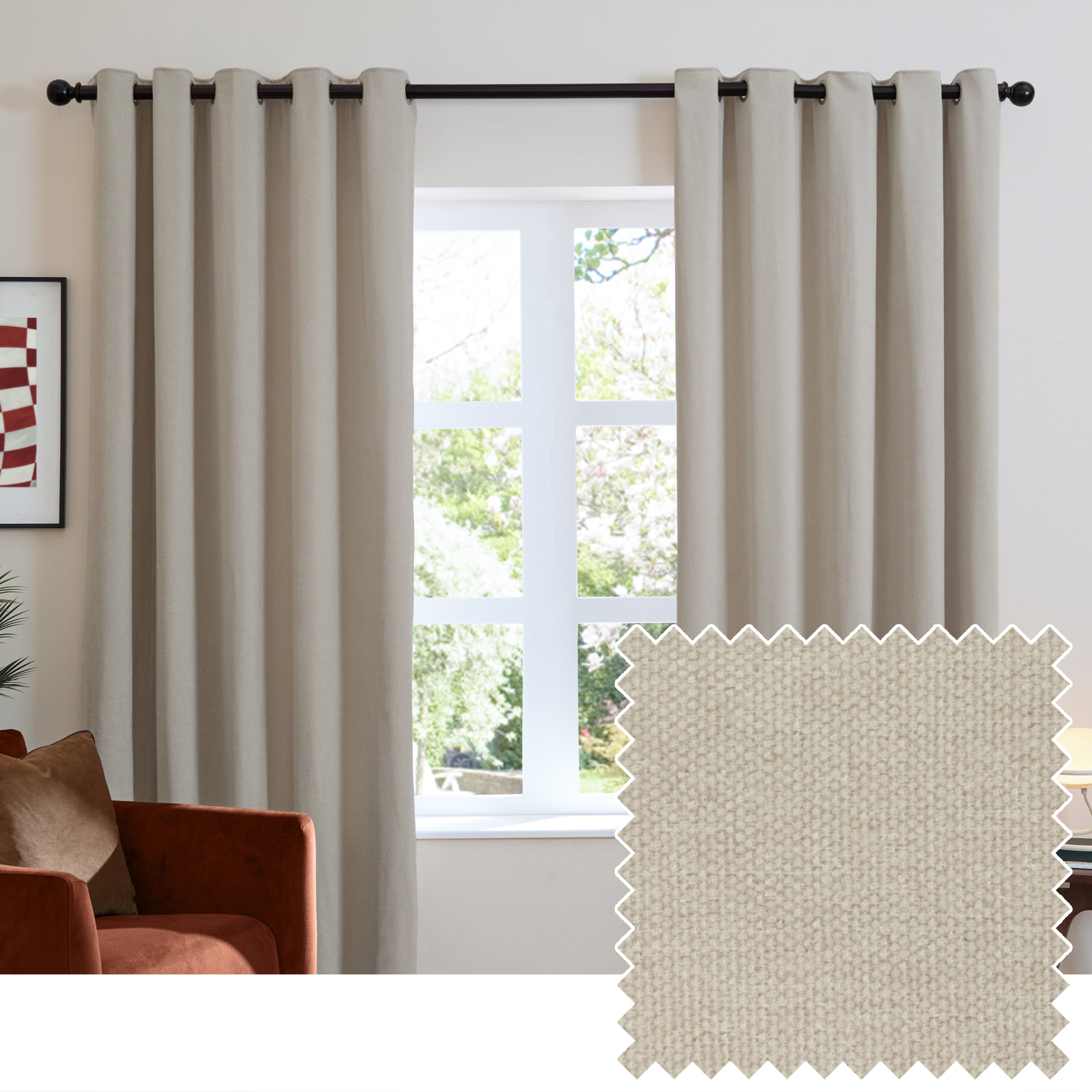 Transform your space with these Soft Chenille Ready Made Eyelet Blackout Curtains in Natural. Constructed from luxuriously tactile matte chenille, they deliver sophisticated comfort whilst maintaining an effortlessly elegant aesthetic. The blackout fabric provides effective light control and privacy, ideal for bedrooms and living spaces requiring a serene environment. Their generous drape creates a refined silhouette, whilst the durable construction guarantees lasting performance. Pre-fitted eyelets ensure straightforward installation and styling versatility across contemporary and traditional interiors alike.