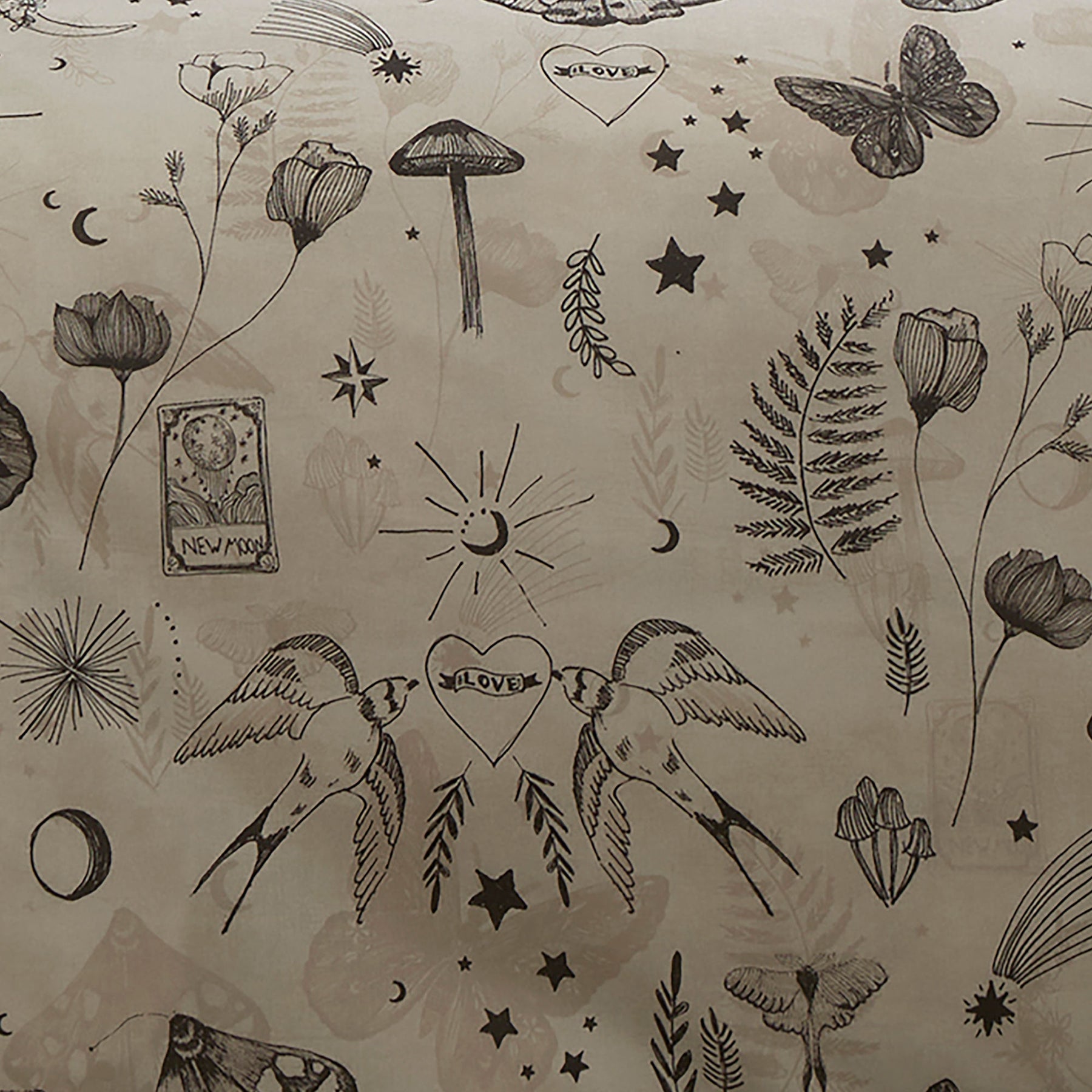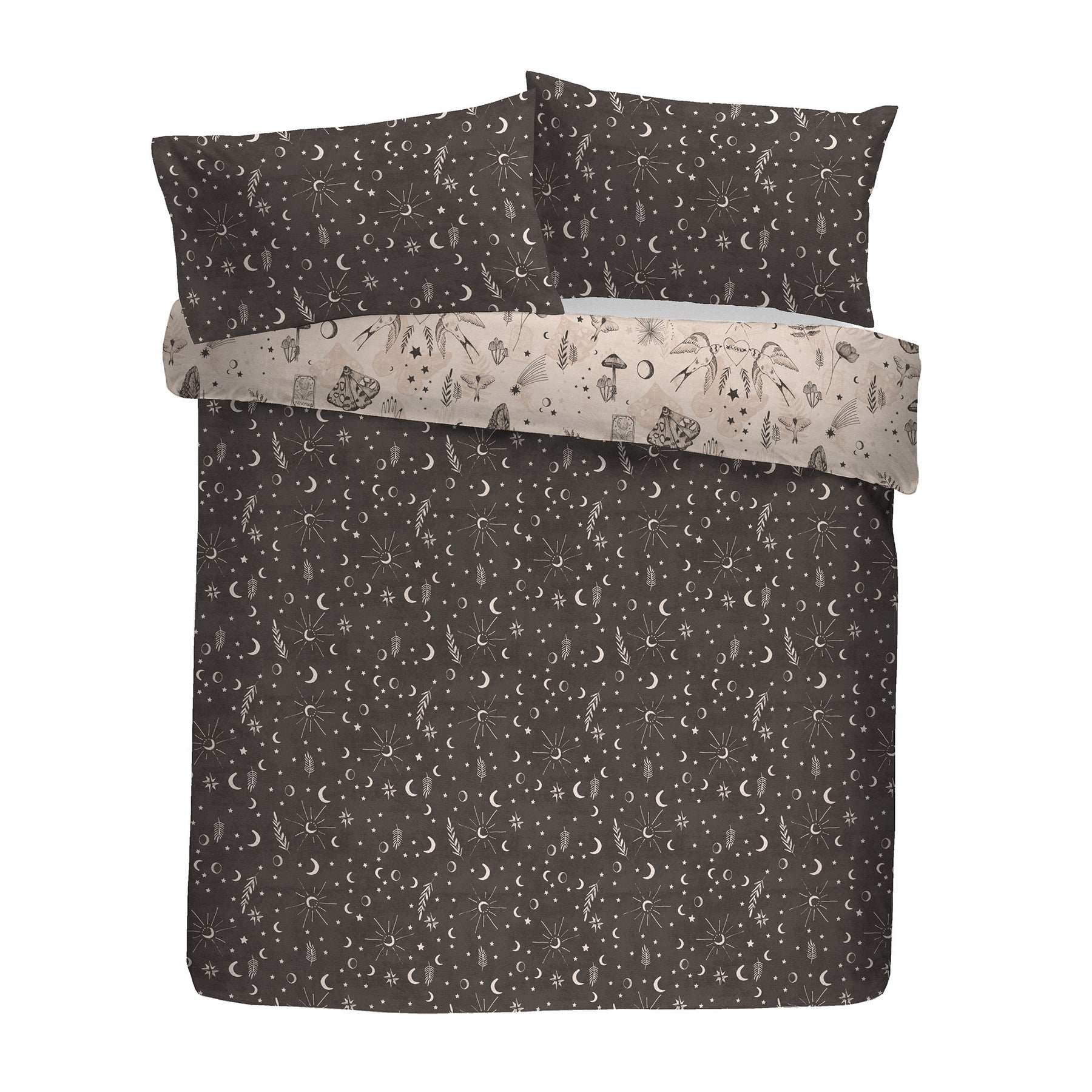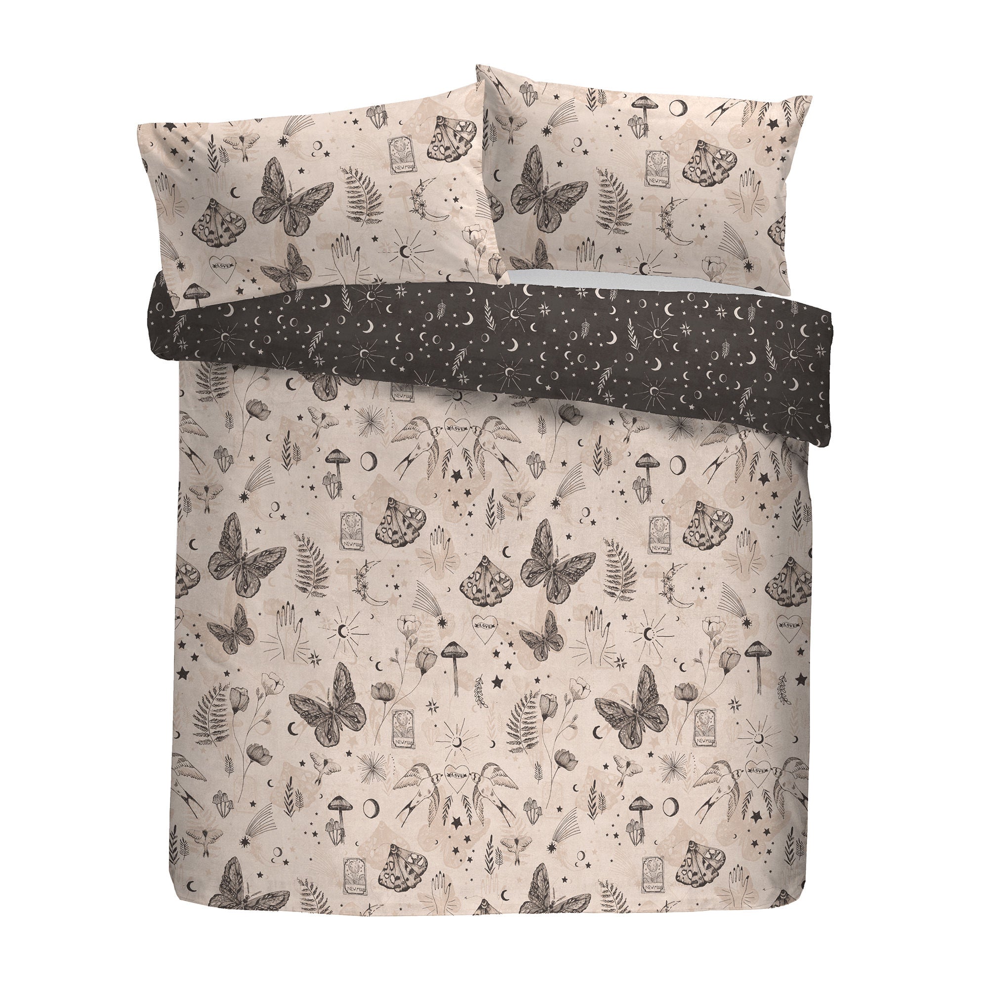 Experience the celestial elegance of the Fusion Evelyn Duvet Cover Set. Featuring hand-drawn designs of butterflies, birds, tarot cards, mushrooms, moons, and stars on the front and a moon and star pattern on the reverse, this reversible bedding combines artistry and versatility. Crafted from soft polycotton, it offers comfort and style at an accessible price point.