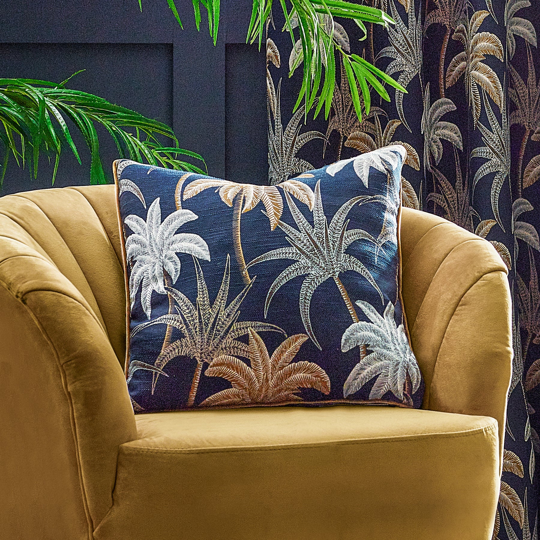 With bold, vibrant hues, Wylder Tropics captures the allure and opulence of far-off, exotic destinations. The reversible Galapagos cushion boasts an abundance of tropical palm trees, intricately woven on a dry-handled jacquard fabric. Available in a variety of modern shades, this design is ideal for making a striking, high-end statement.