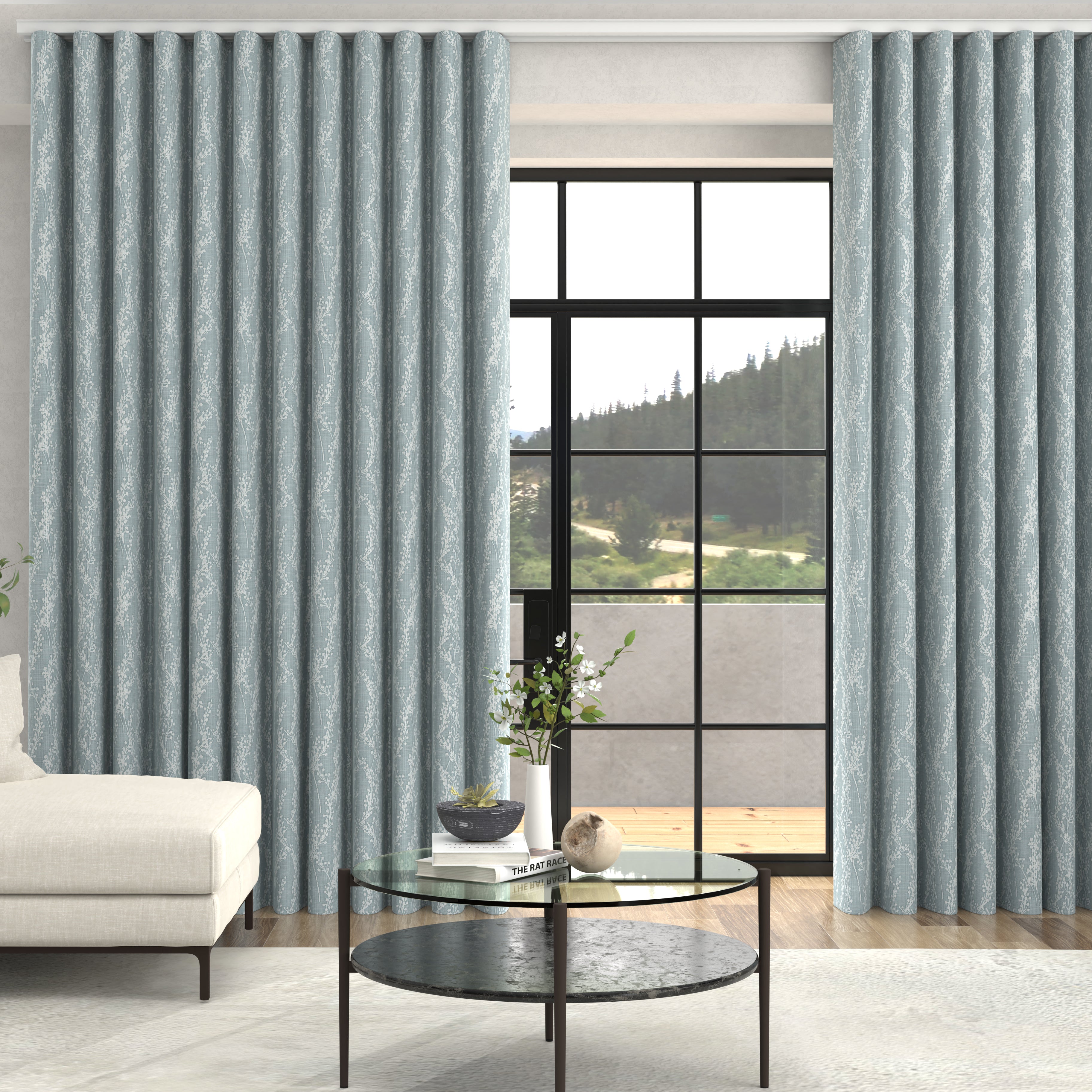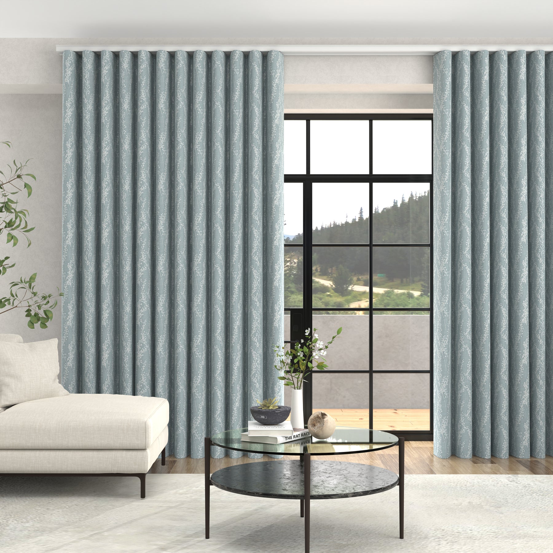 Expertly crafted with an intricate floral jacquard weave, these Grace curtains bring sophisticated elegance to any interior. The modern Wave heading creates a streamlined aesthetic with reduced fabric volume, offering the clean lines of eyelet curtains while allowing for effortless stacking when open. The Smoky Blue colourway provides a refined finishing touch to your custom window treatment.