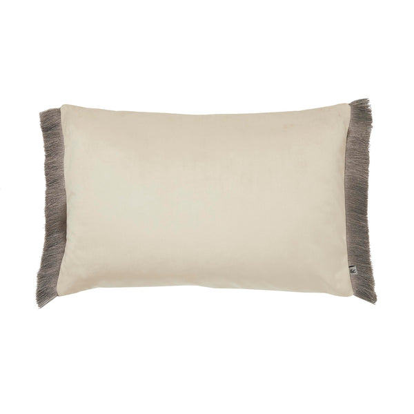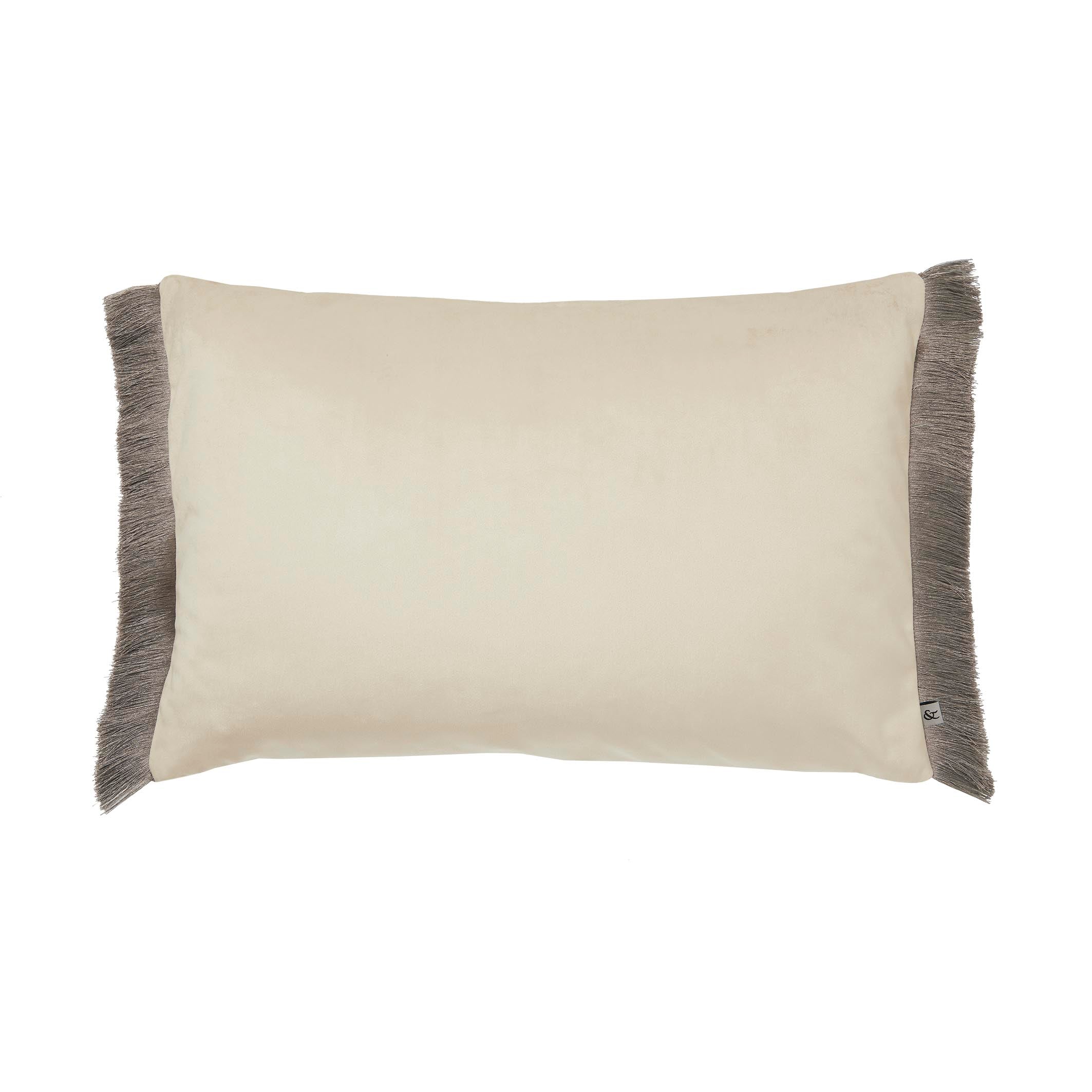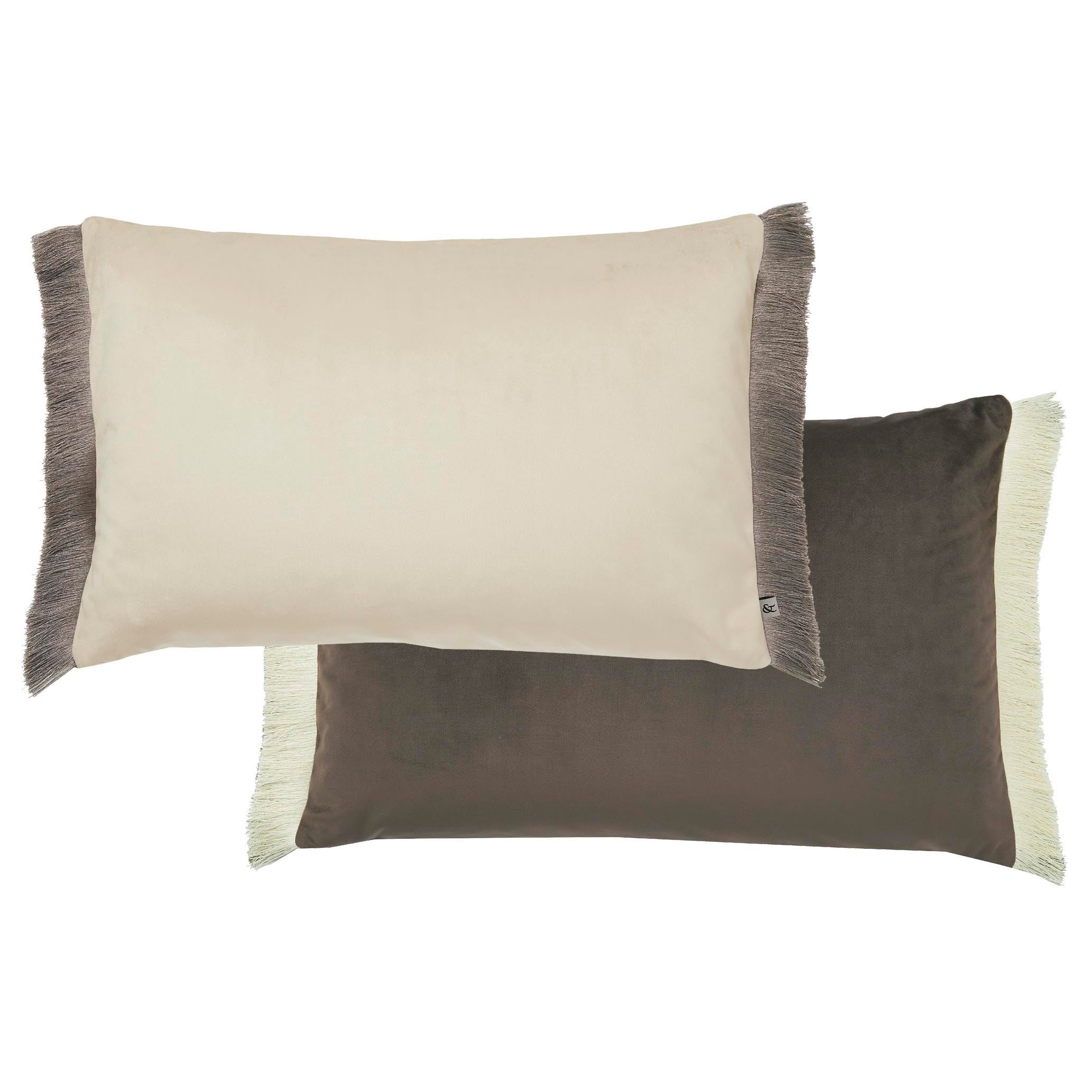 Elevate your living space with the Graham And Brown Fringe Opulence Chocolate cushion, a refined blend of texture and colour designed to complement sophisticated interiors. This 40cm x 60cm cushion features a plush cream velvet front adorned with rich chocolate fringe, adding depth and tactile interest. The reverse side contrasts beautifully with a deep brown fabric trimmed in cream fringe, offering versatility in styling. Filled with soft feathers, it provides both comfort and elegance, making it an ideal accent piece to enhance the warmth and luxury of your home décor.
