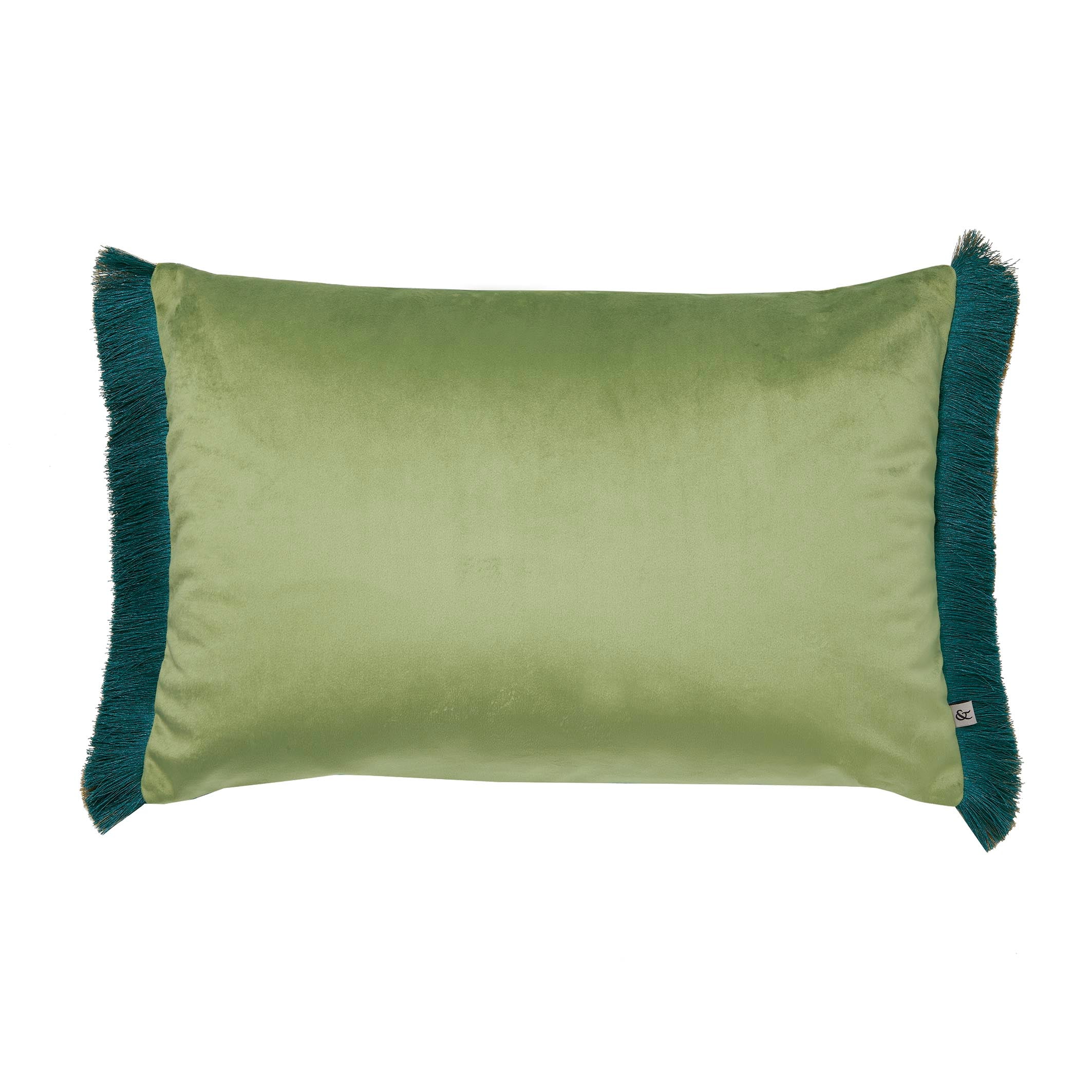 The Graham And Brown Fringe Opulence 40cm x 60cm Feather Filled Cushion in Lush Jewel combines deep green and vibrant teal velvet with refined fringe detailing, creating a sophisticated accessory for any interior. Its feather filling ensures plush comfort and durability, while the rich jewel tones add a striking yet elegant splash of colour. Perfect for complementing jewel-toned décor, this cushion elevates the ambience of living spaces with both style and softness.