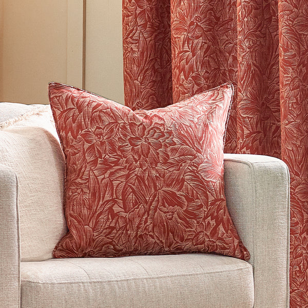 Wylder Nature's Grantley Jacquard Piped Filled Cushion Brick is a designer's dream, paying homage to the British countryside with its enchanting botanical floral design. Created with a stunning dry-handle textured weave on a textured slub jacquard fabric, this timeless piece comes in a variety of serene tones, making it perfect for adding a touch of modern-traditional flare to any home.
