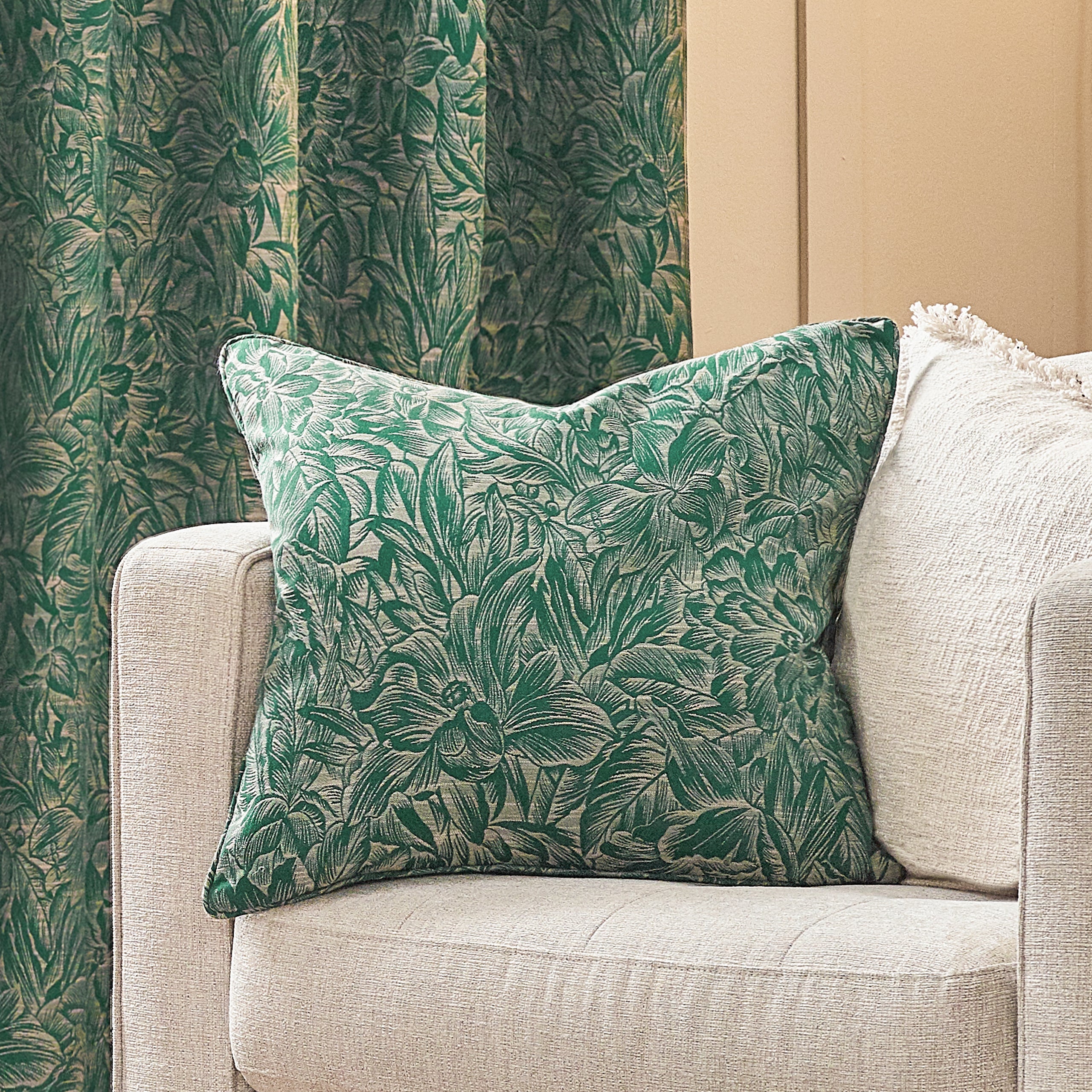Bring the beauty of the British countryside into your home with Grantley Jacquard Piped 50cm x 50cm Filled Cushion Emerald. This reversible cushion showcases a timeless botanical floral design with a textured slub jacquard fabric, available in serene tones. Perfect for adding a touch of modern-traditional style to your home decor.