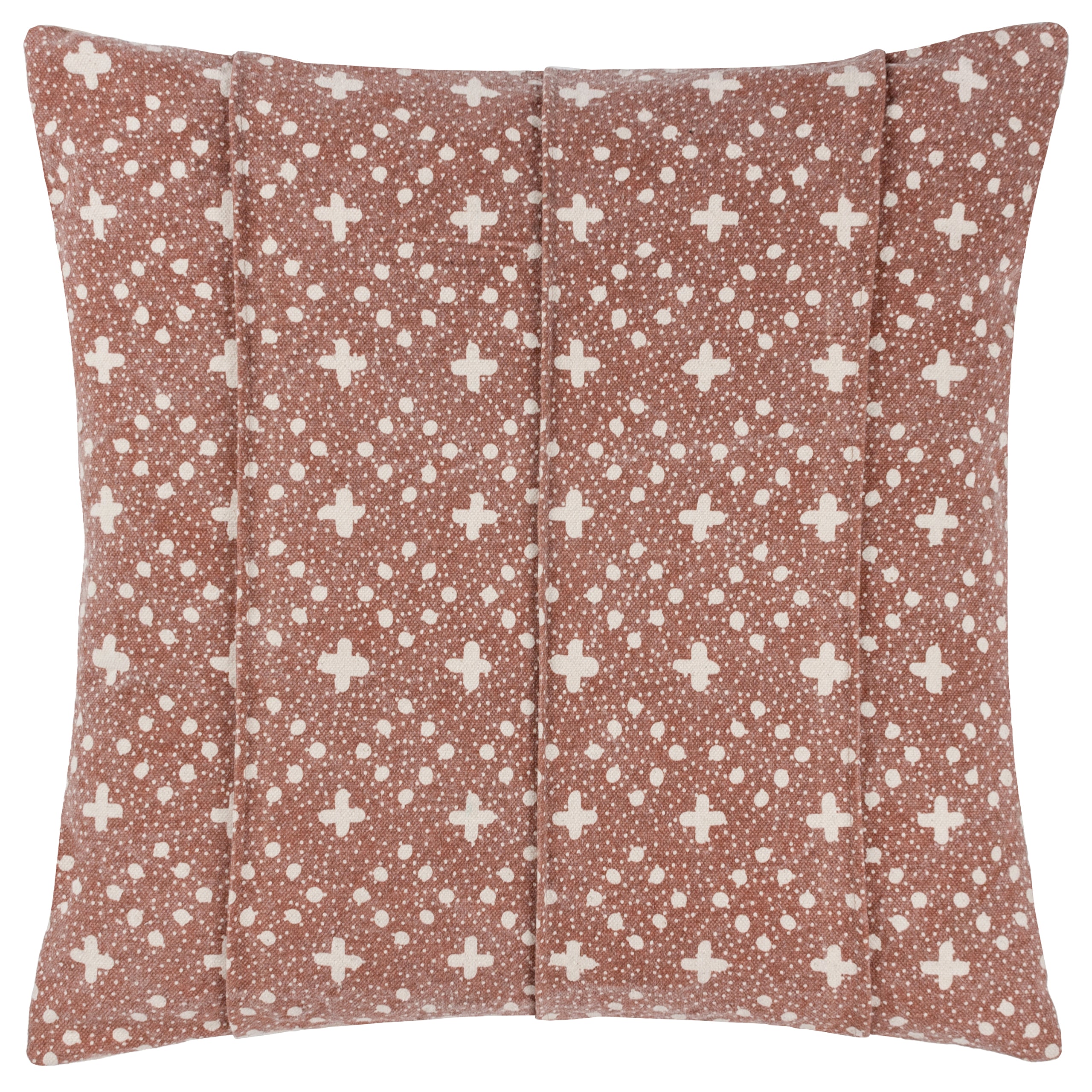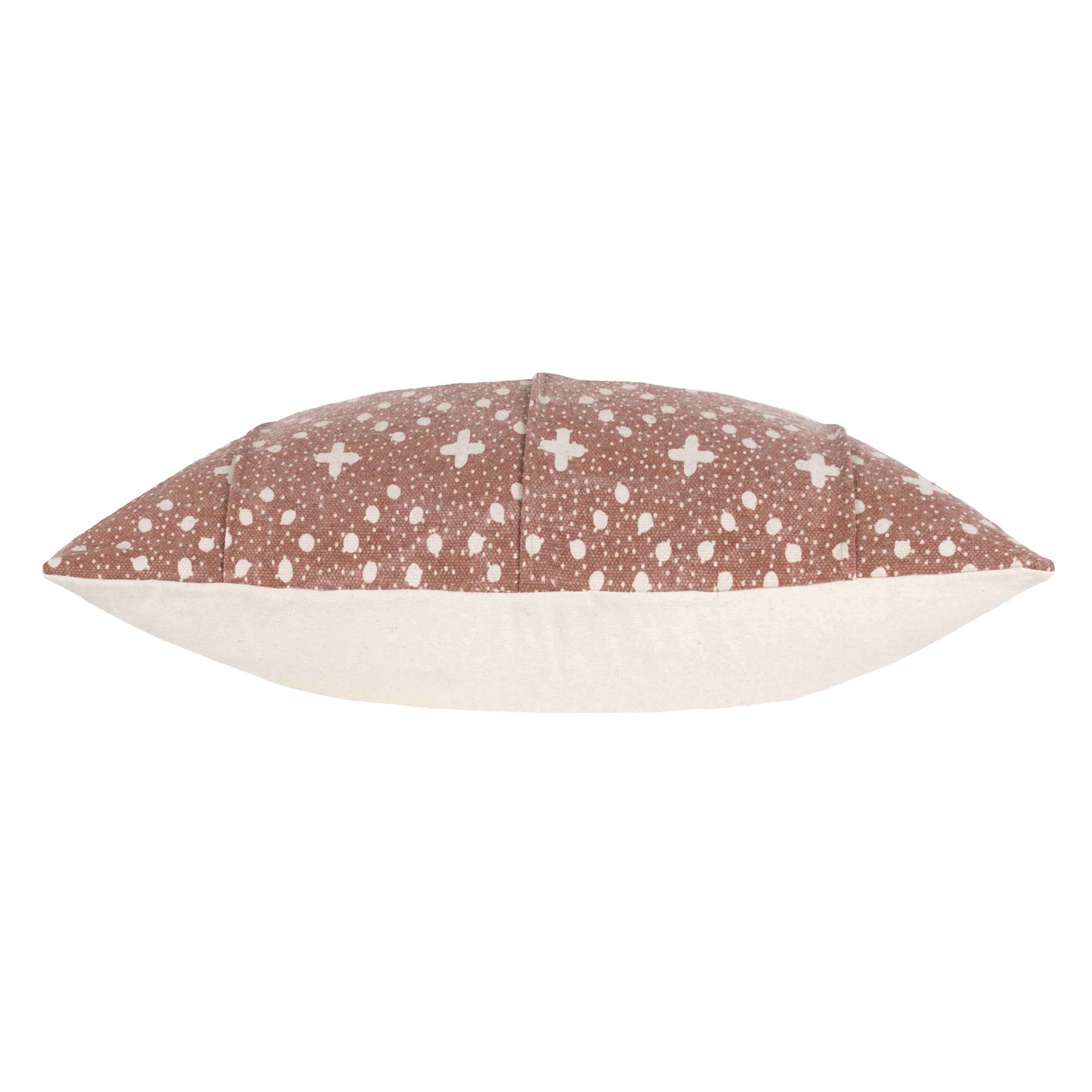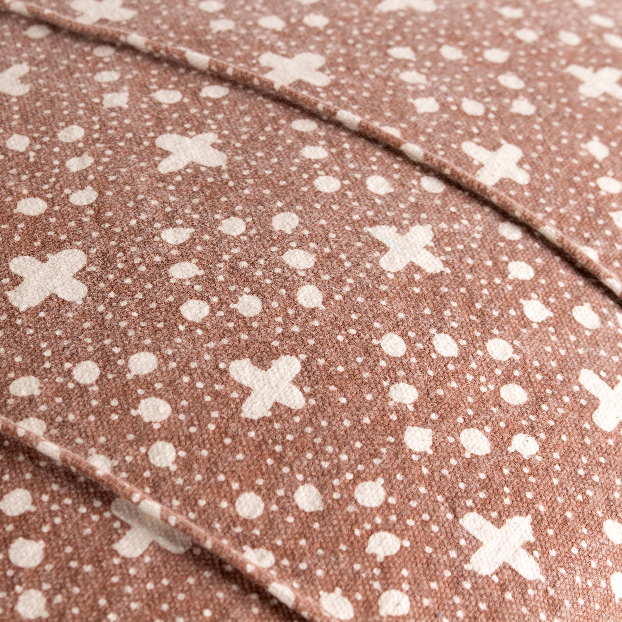 The Helm cushion creates a stylish character for itself in your living areas with its soft earth tones. It has an organic appearance and is made of natural, undyed heavyweight cotton. Three horizontal pin tuck folds enhance the cushion's presence. It is covered in contrast-printed crosses and loose diamond circular patterns encircled by stars-shaped dots, giving a striking design in a plain setting. Finished with a knife edge, a simple cotton reverse, and a zip. a calm complement to any modern house.