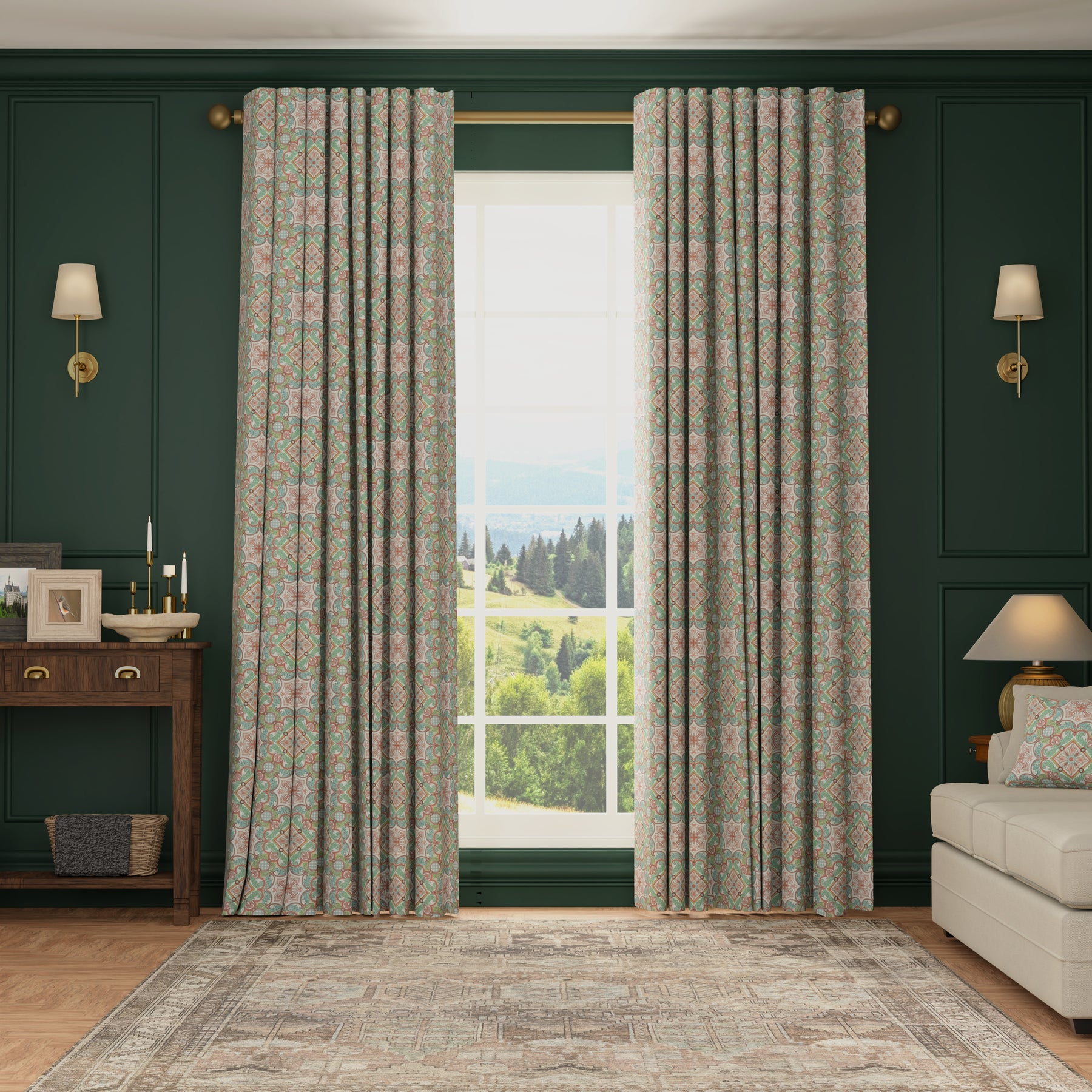 A pair of made-to-measure curtains from the HOUSE Llewelyn-Bowen Festivo collection, designed to elevate any living space with its elegant charm. Featuring a sophisticated scrolling geometric and floral printed design, these curtains are crafted from 100% cotton with a tonal print that adds subtle texture and depth. The multi-tonal palette combines soft salmon pink with calming green and blue accent tones, creating a balanced yet vibrant ambiance. Tailored to your window dimensions, these curtains offer both style and functional sophistication, perfect for enhancing the décor of modern and classic interiors alike.