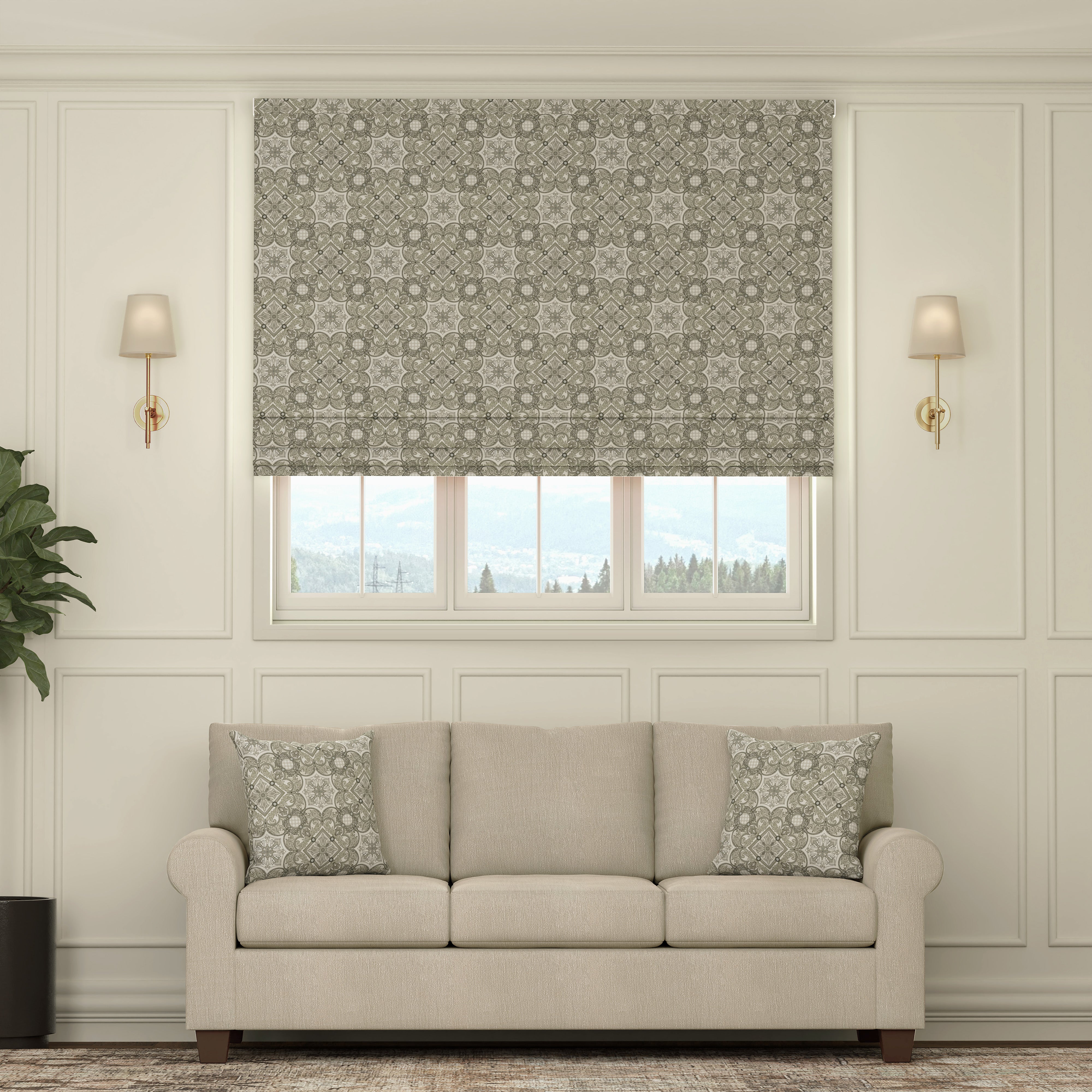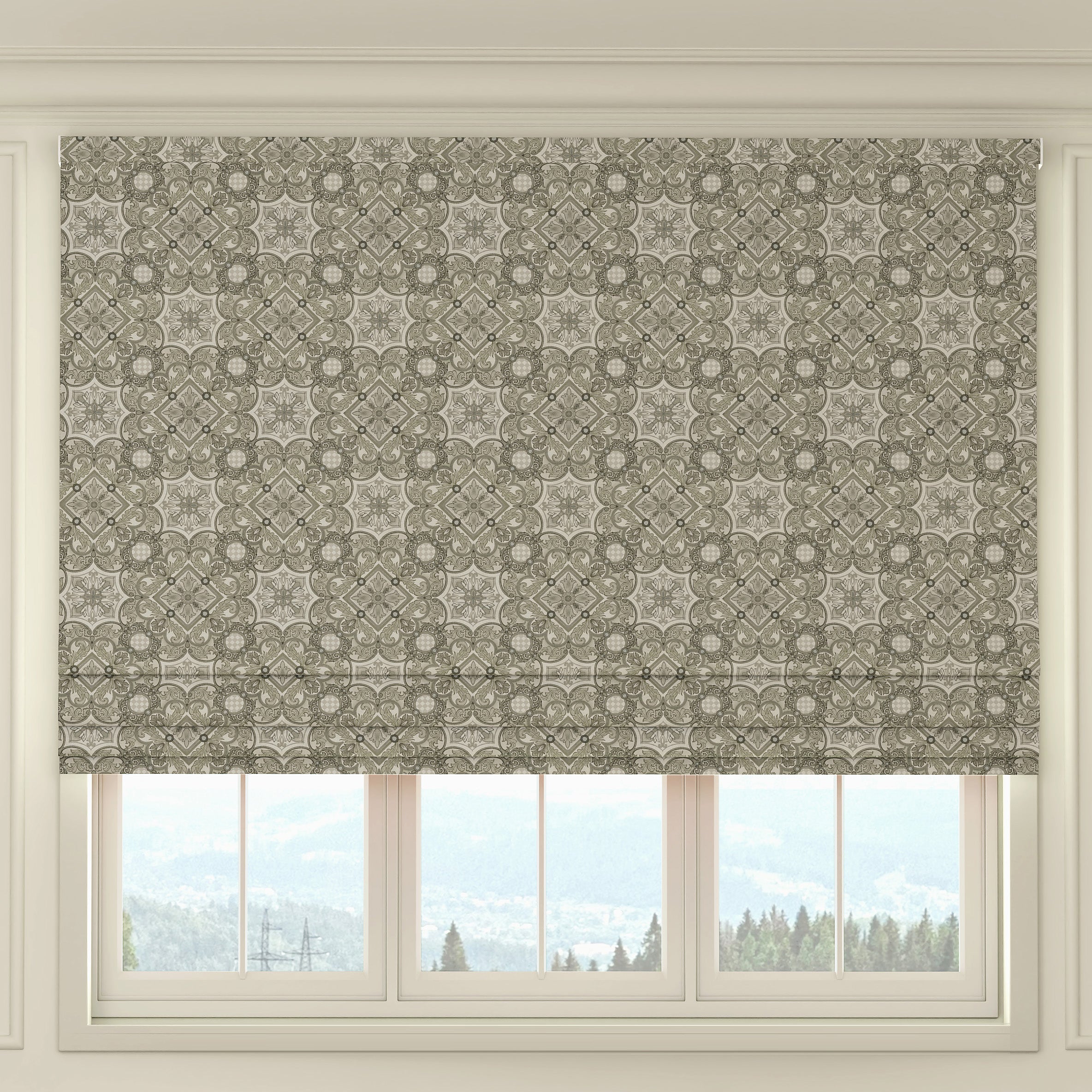 The HOUSE Llewelyn-Bowen Festivo Printed Made to Measure Roman Blind Noir combines timeless style with precise craftsmanship. Designed to fit your windows perfectly, this Roman blind features an elegant scrolling geometric and floral print that adds depth and character to any room. Made from 100% cotton, the fabric offers a subtle tonal print with multi-tonal nuances in a neutral beige palette, ensuring versatility in various interior settings. Its premium quality cotton fabric not only provides durability but also enhances the softness and texture, creating a refined and sophisticated window treatment ideal for contemporary and classic décor alike.