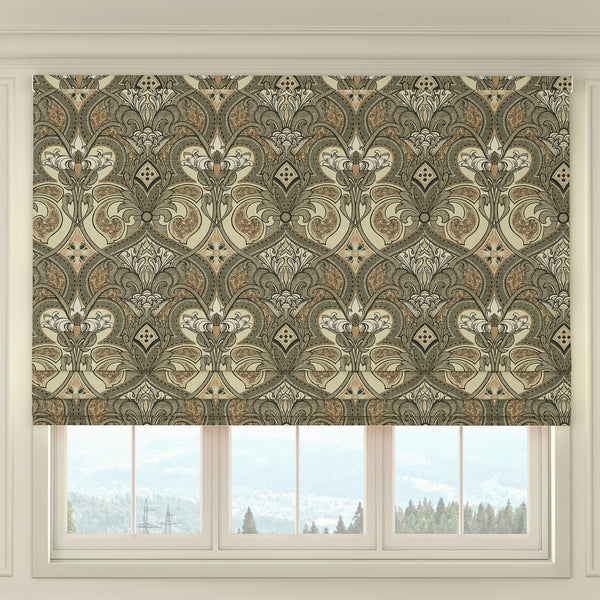 This made-to-measure Roman blind from the HOUSE Llewelyn-Bowen collection showcases a beautifully printed damask design crafted from 100% cotton fabric. The elegant scrolling pattern adds timeless charm, while neutral beige and soft brown tones offer subtle sophistication that complements a variety of interior styles. Expertly tailored to your dimensions, this blind combines classic aesthetics with practical functionality, providing a refined window treatment that enhances light control and privacy in your space. Its high-quality material ensures durability and a luxurious feel, making it an excellent choice for discerning homeowners.