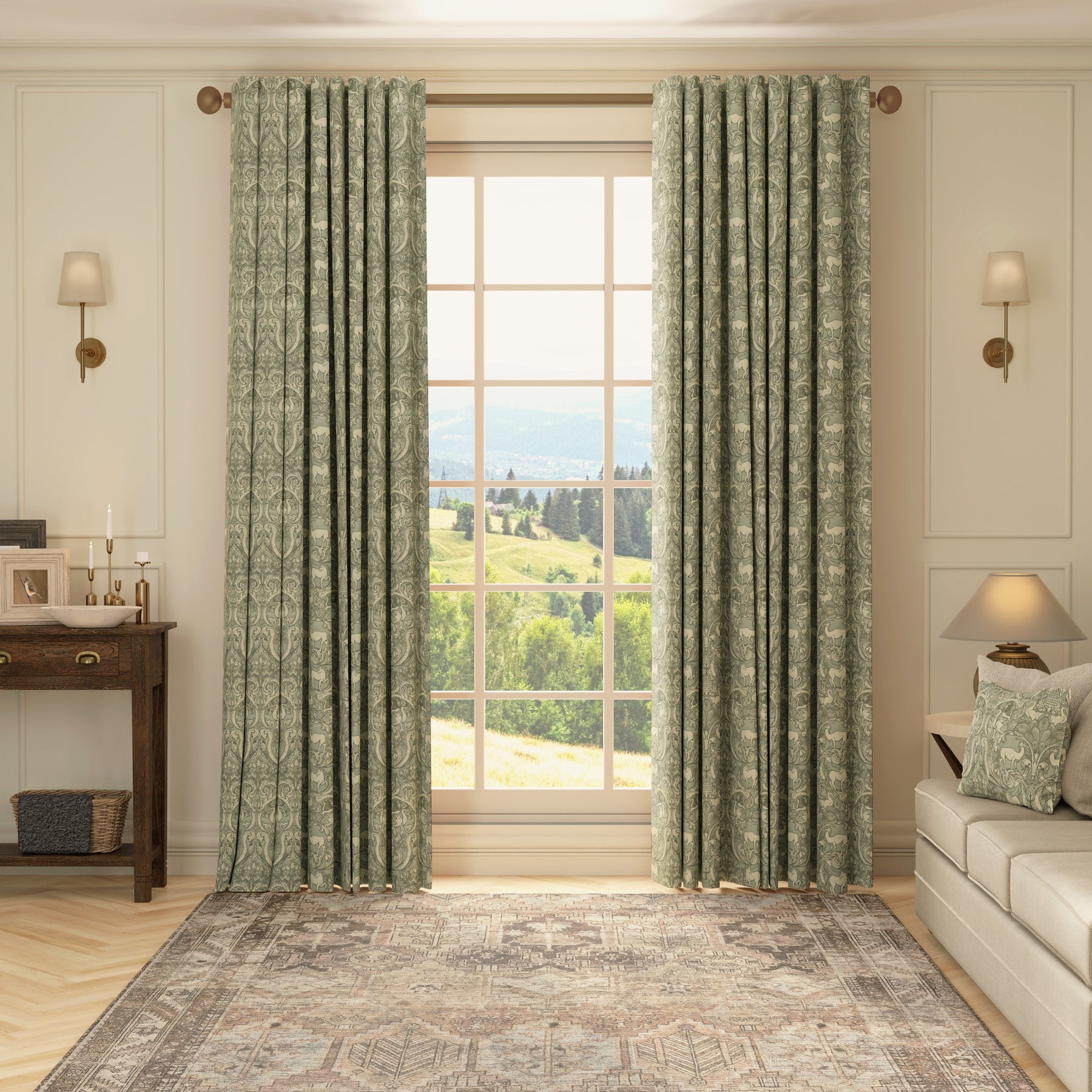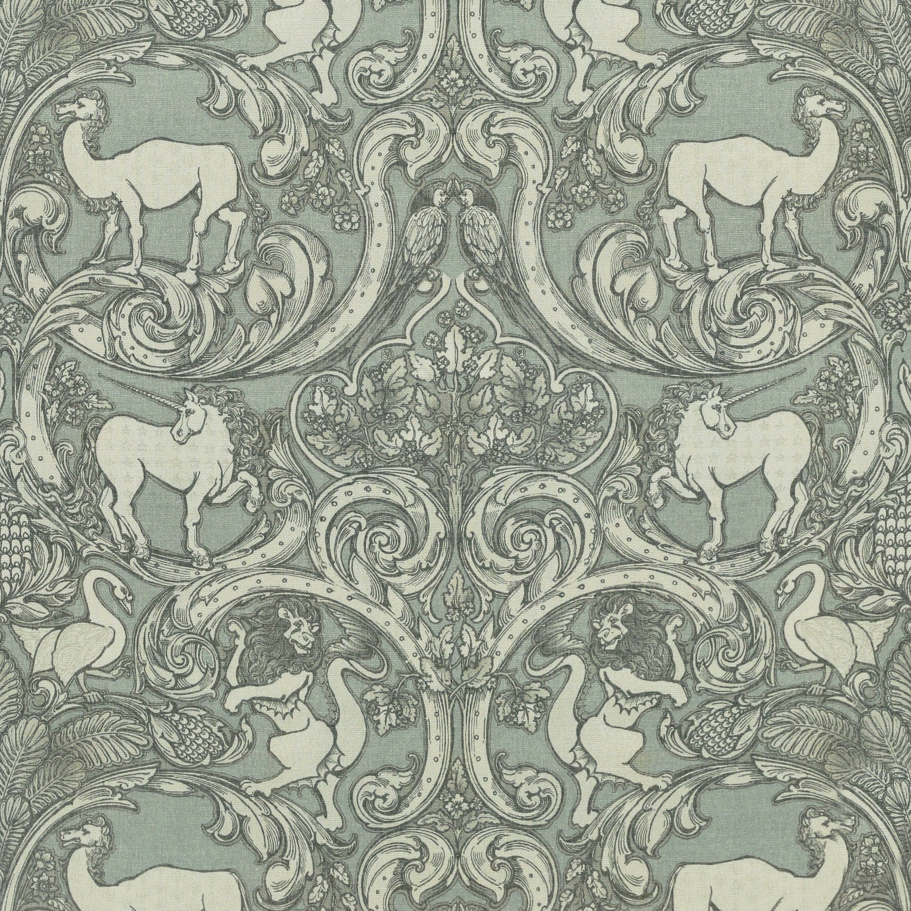 These made-to-measure curtains from the HOUSE Llewelyn-Bowen Menagerie collection showcase an intricate print of fantastical creatures, including unicorns, finned lions, geese, and camels, artfully interwoven with swirling leaves and damask motifs. Crafted from 100% cotton, the fabric offers a durable yet soft texture that suits a variety of interior styles. The powder blue background, reminiscent of cool duck egg tones, provides a serene and sophisticated backdrop, while the neutral-patterned design adds timeless elegance. Perfect for adding a subtle touch of magic and refinement to any room, these curtains combine exceptional craftsmanship with a distinctive artistic flair.