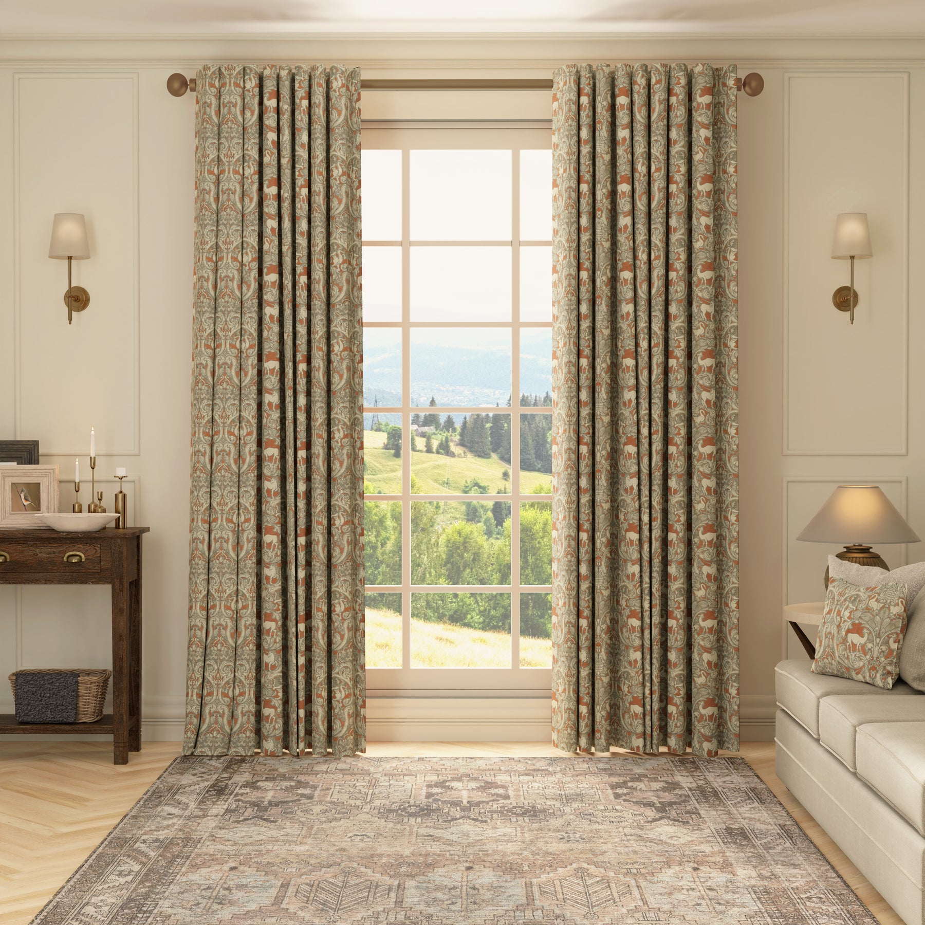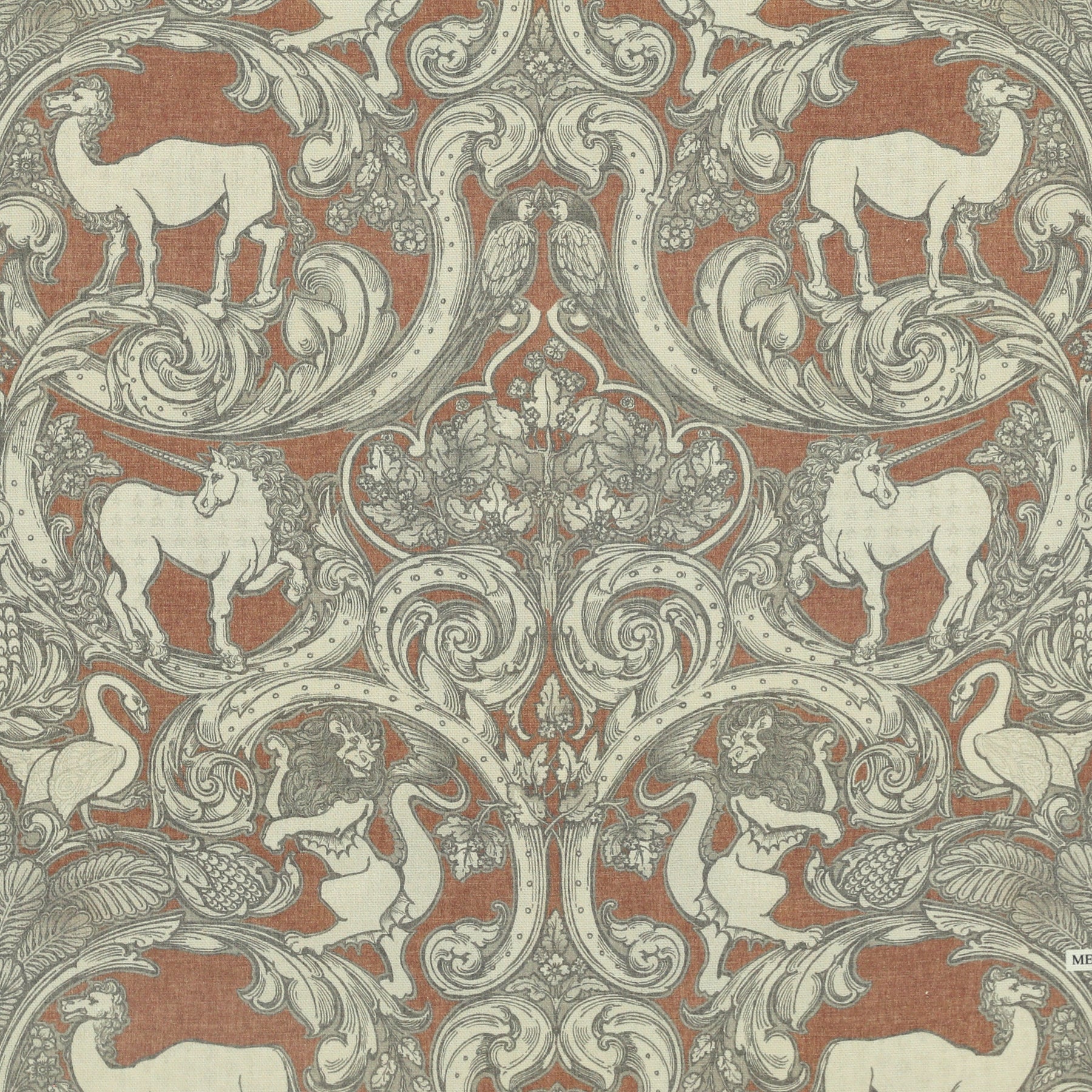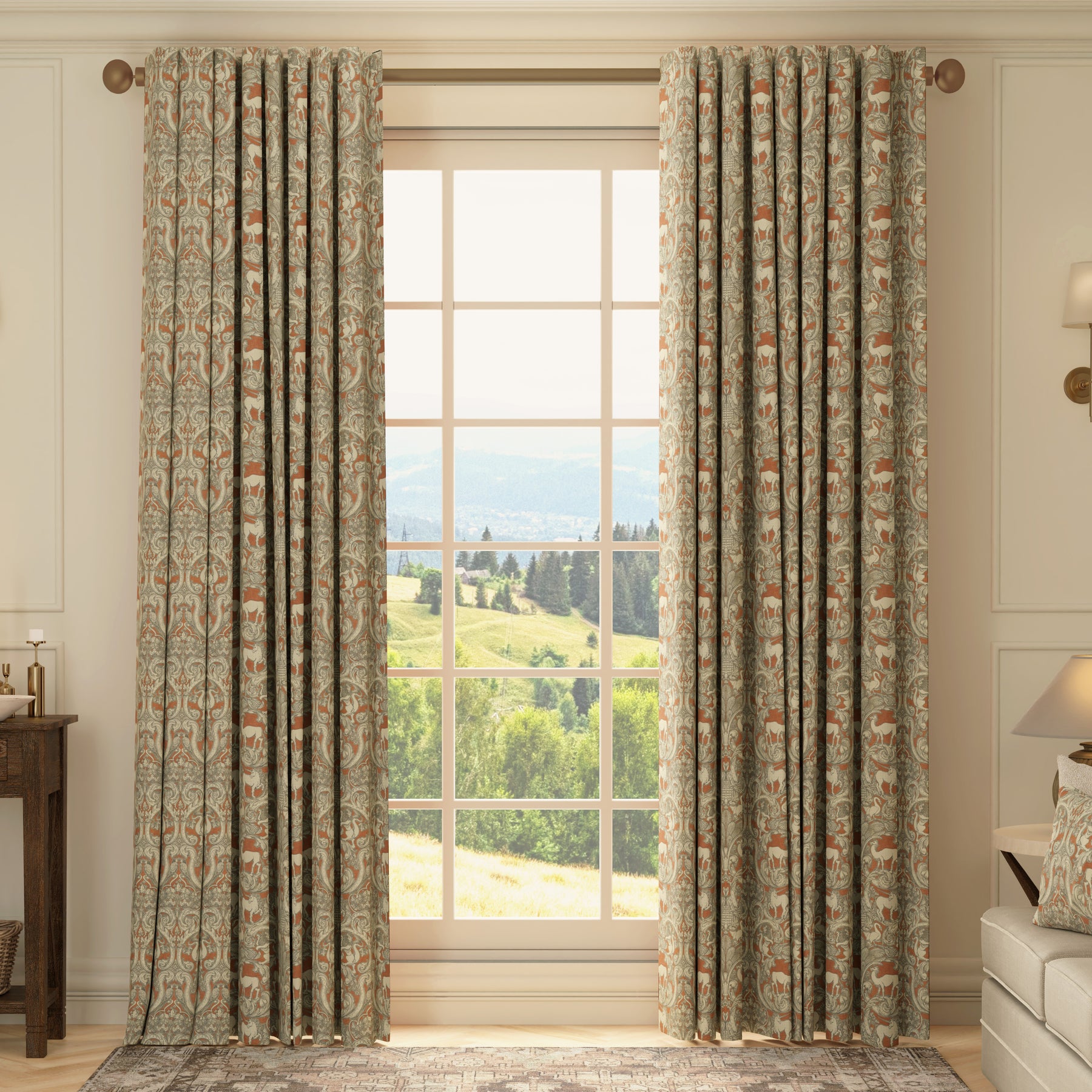 Elevate your interiors with these made-to-measure curtains from the esteemed HOUSE Llewelyn-Bowen Menagerie collection. Crafted from 100% premium cotton, this printed fabric showcases a captivating array of mythical and real creatures — unicorns, finned lions, geese, and camels — set against an intricate damask-inspired pattern interwoven with swirling leaves. The rich background contrasts elegantly with neutral tones, adding both warmth and sophistication to any room. Designed to precise measurements, these curtains promise a tailored fit that enhances window aesthetics while providing light control and privacy. Perfect for those seeking artistry and craftsmanship in their home décor.