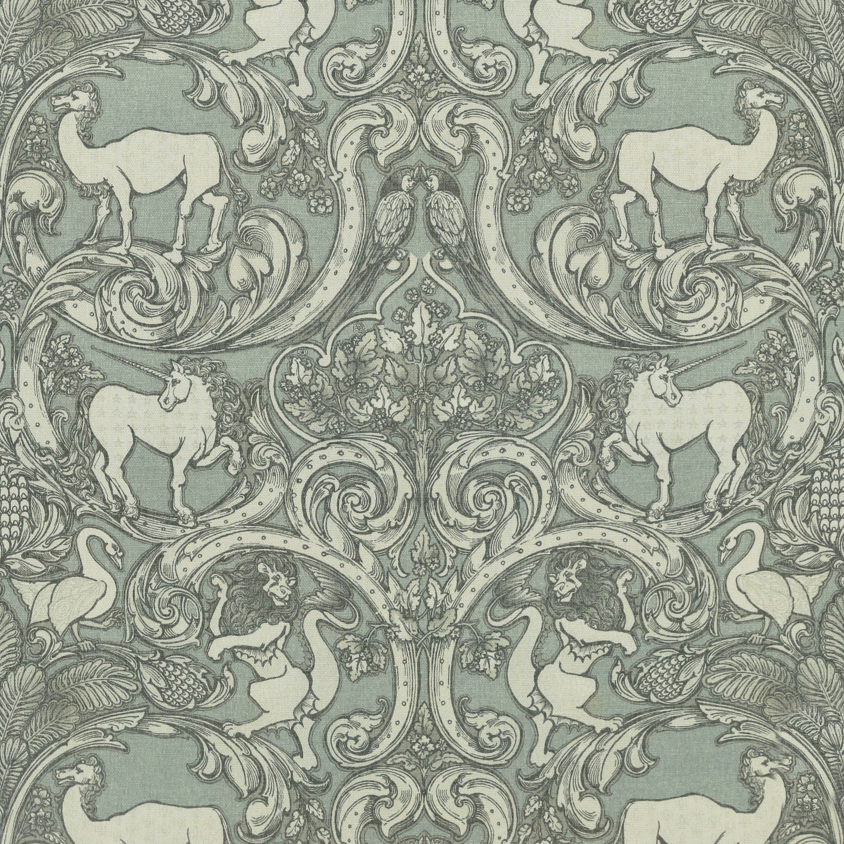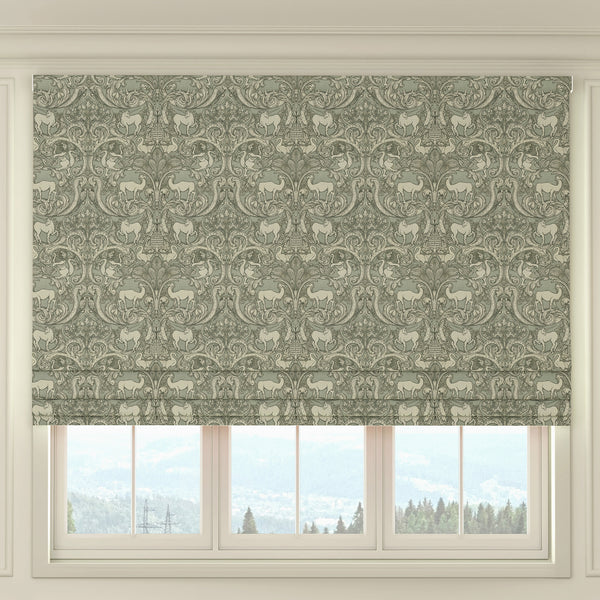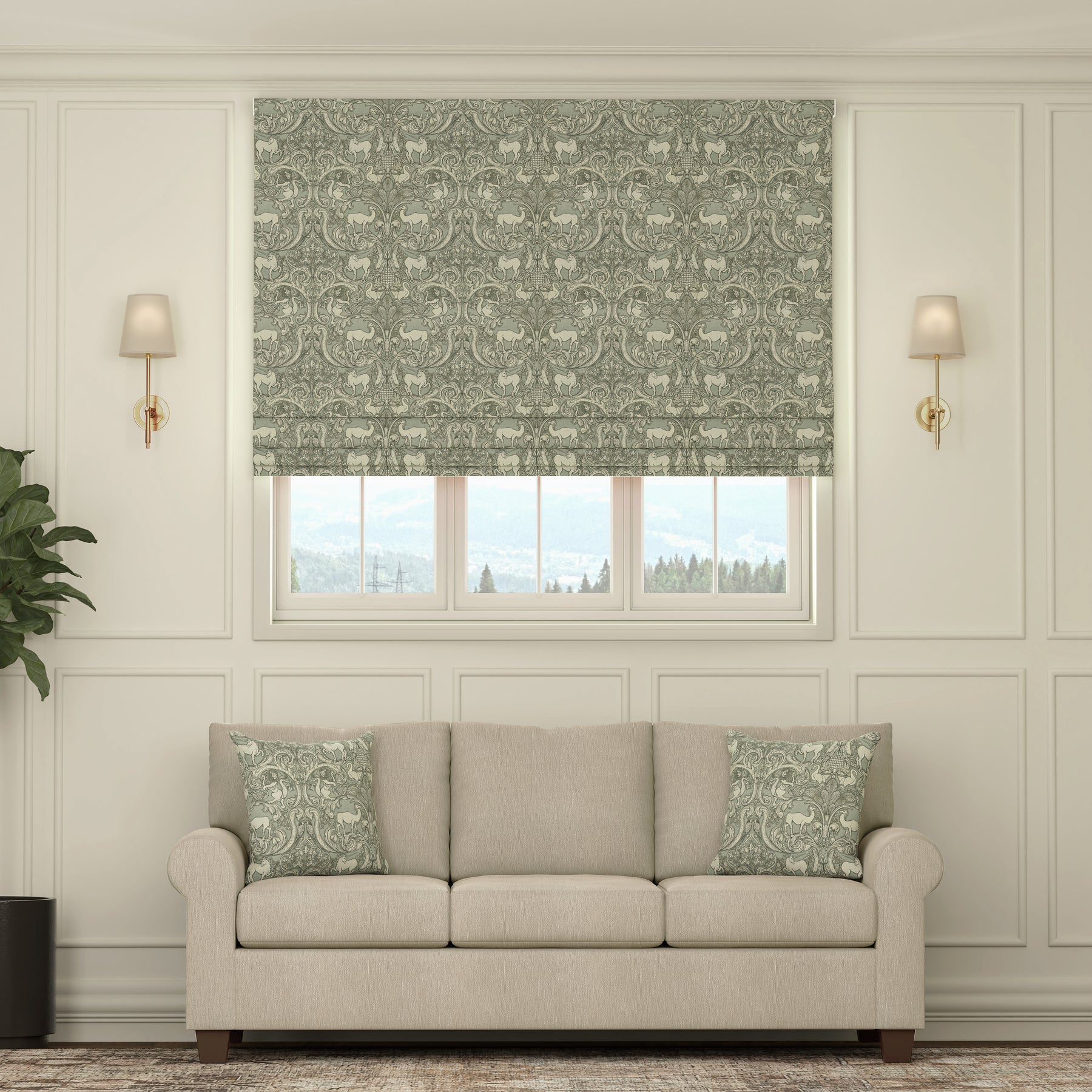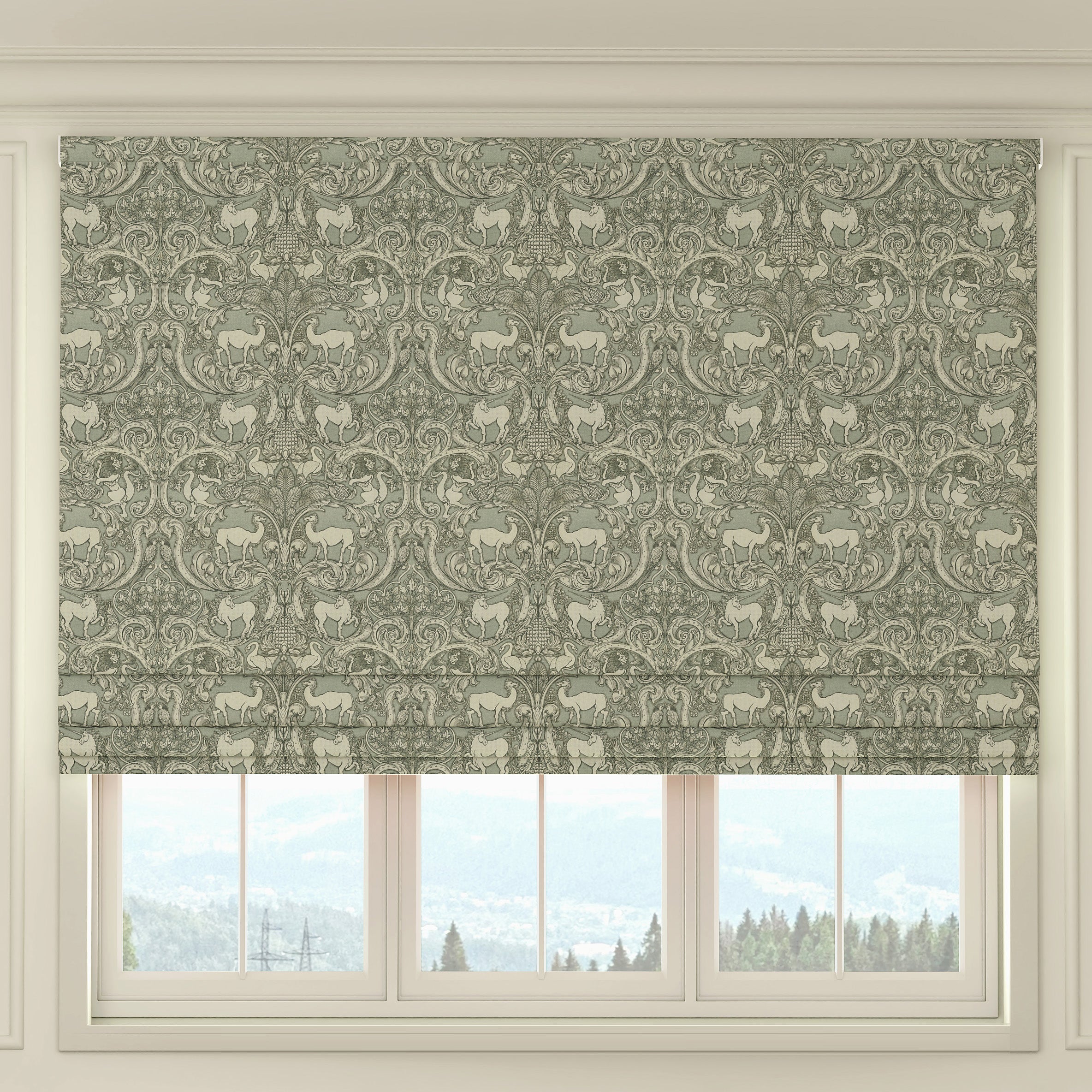 This made-to-measure Roman blind from the HOUSE Llewelyn-Bowen Menagerie collection is crafted from 100% cotton, featuring a detailed print of fantastical creatures such as unicorns, finned lions, geese, and camels. These enchanting animals are nestled among swirling leaves and damask-inspired patterns, creating a sophisticated yet whimsical design. The cool powder blue background, reminiscent of duck egg tones, contrasts subtly with the neutral motifs, making this blind an elegant addition to any room. Perfect for adding a touch of artistry and character while providing tailored window coverage with expert craftsmanship.