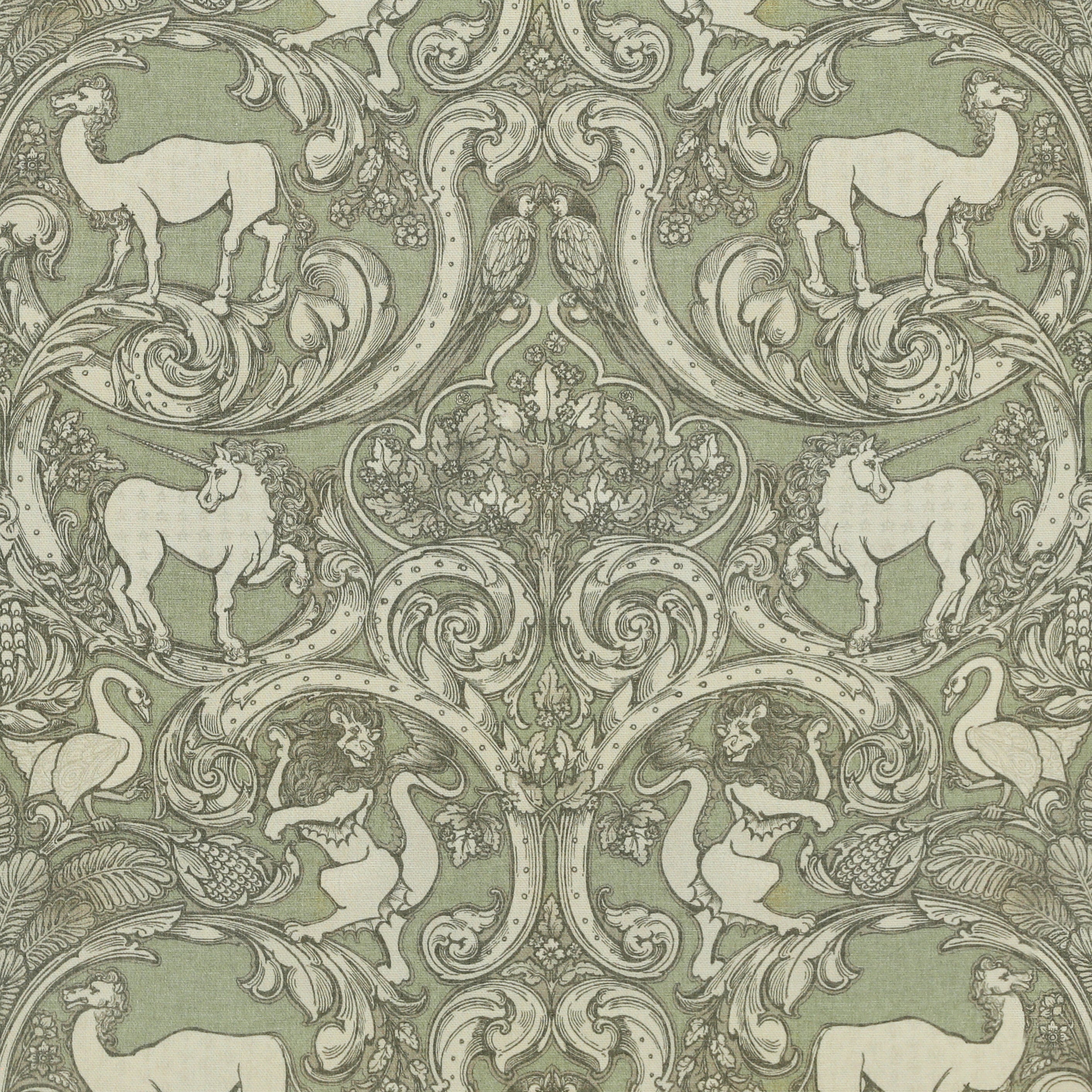 The HOUSE Llewelyn-Bowen Menagerie Printed Made To Measure Roman Blind in Sage offers a unique blend of artistry and craftsmanship. This expertly made-to-measure blind features a 100% cotton fabric patterned with an enchanting menagerie of magical creatures, including unicorns, finned lions, geese, and camels. Set against a soothing green background with an intricate damask and swirling leaf design, it adds a sophisticated yet whimsical touch to any room. Designed for both beauty and function, this blind provides privacy and light control while elevating interior décor with its distinctive and timeless style.