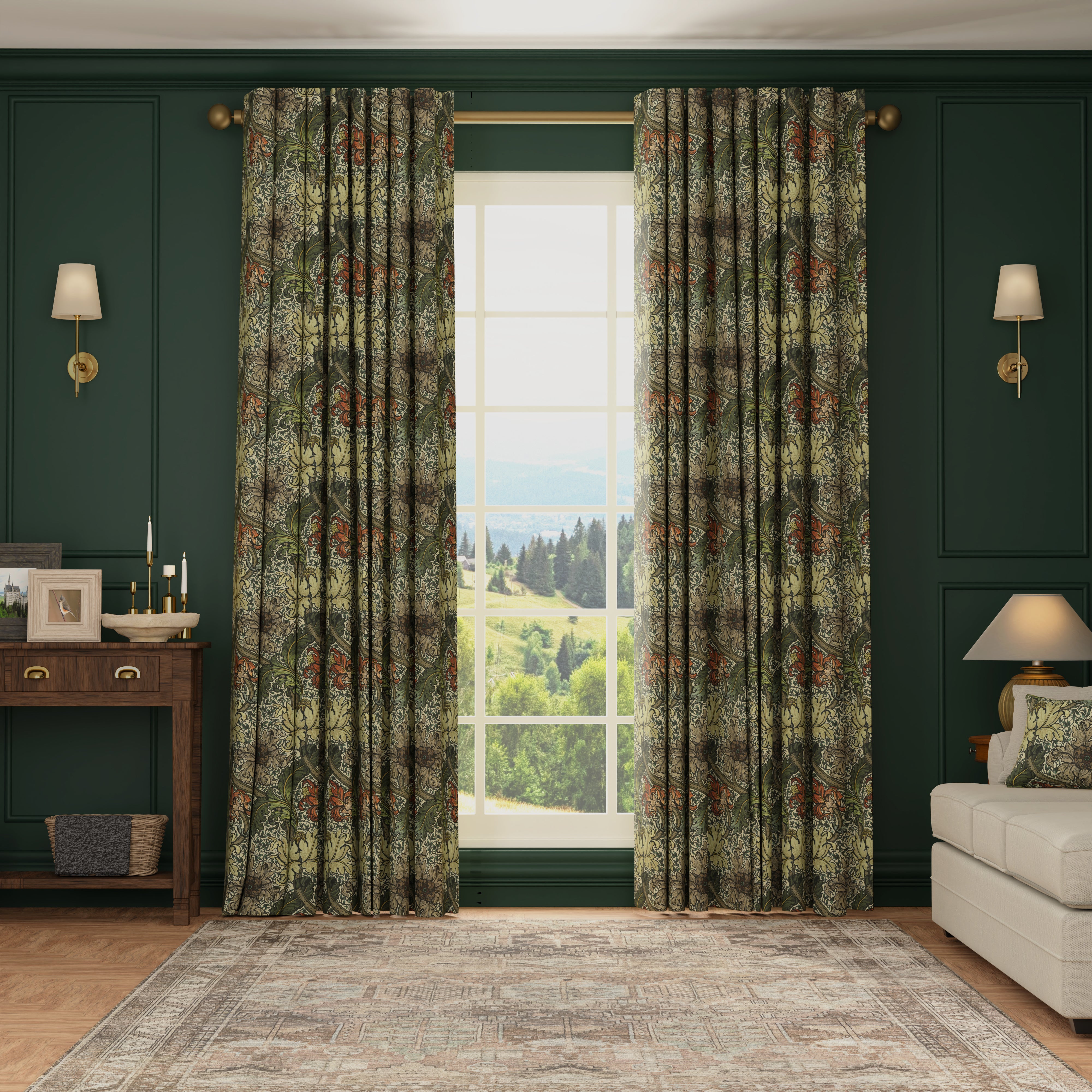 Elevate your interior with the HOUSE Llewelyn-Bowen Morris Major printed curtains, expertly crafted to your measurements. Made from 100% premium cotton, these curtains feature an elegant scrolling leaf and floral pattern, combining subtle green, rust, and beige tones on a crisp white background. The design balances classic charm with contemporary style, enhancing light filtration while providing privacy. Ideal for creating a warm, inviting atmosphere, these made-to-measure curtains offer both functional excellence and aesthetic appeal, perfectly tailored to complement your living space with timeless elegance.