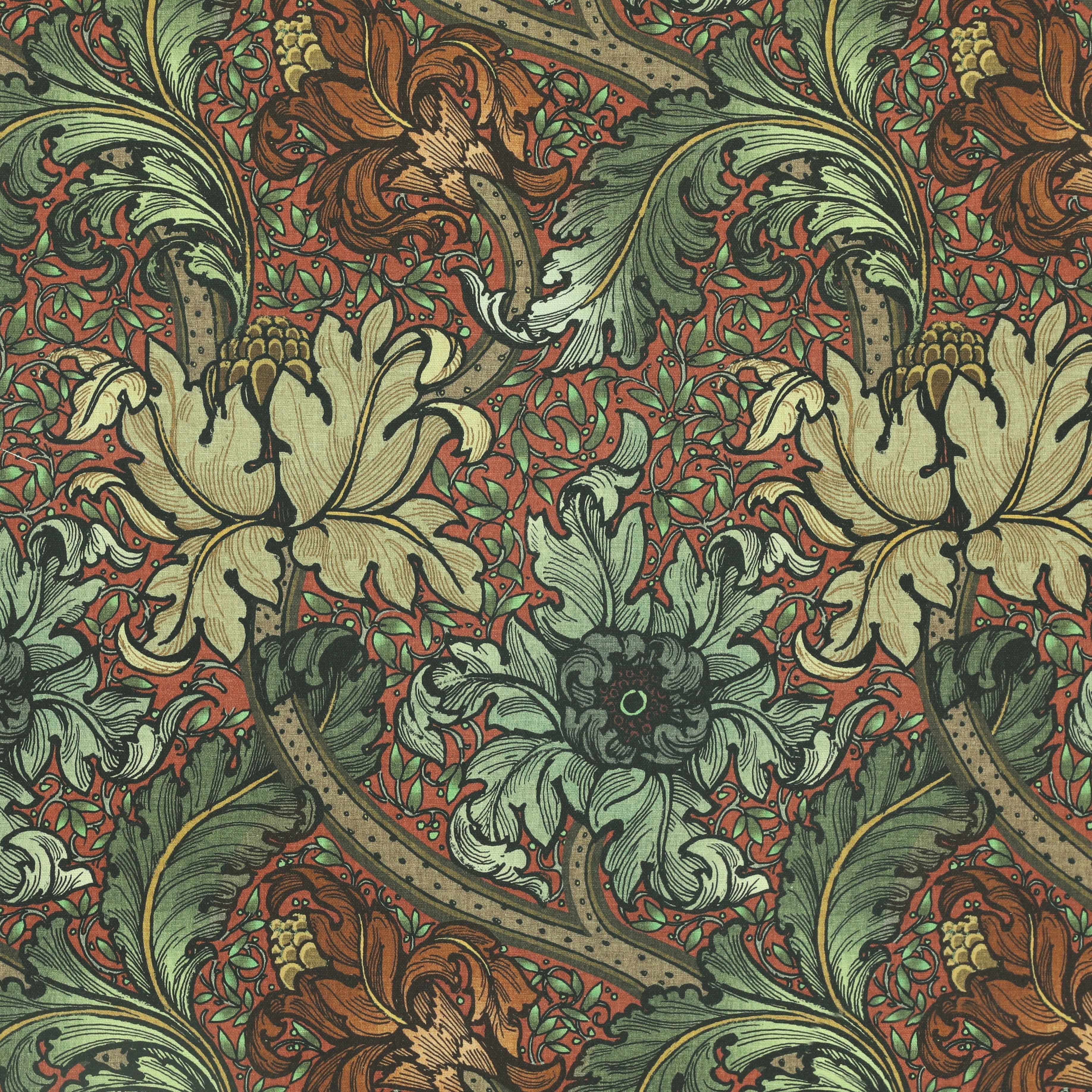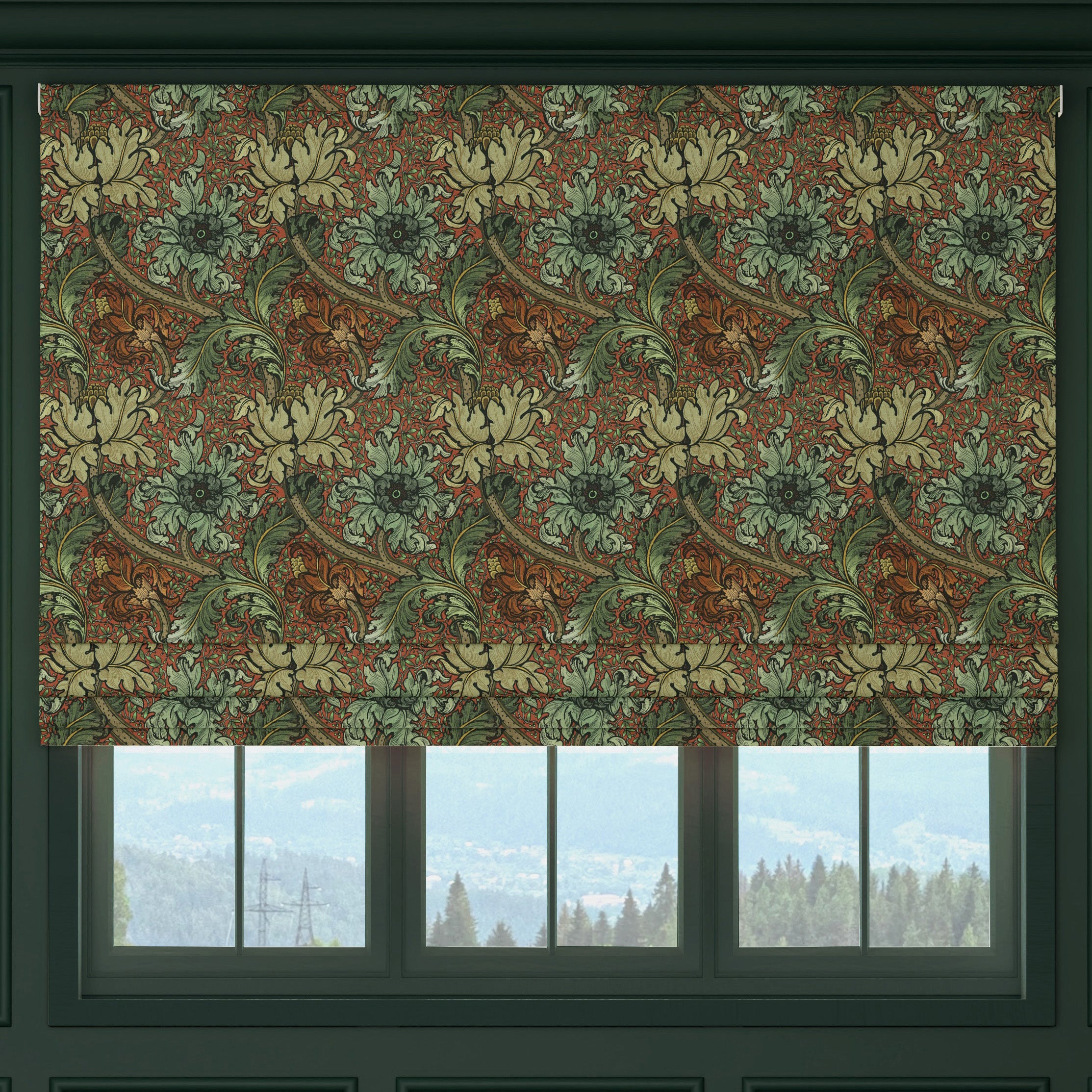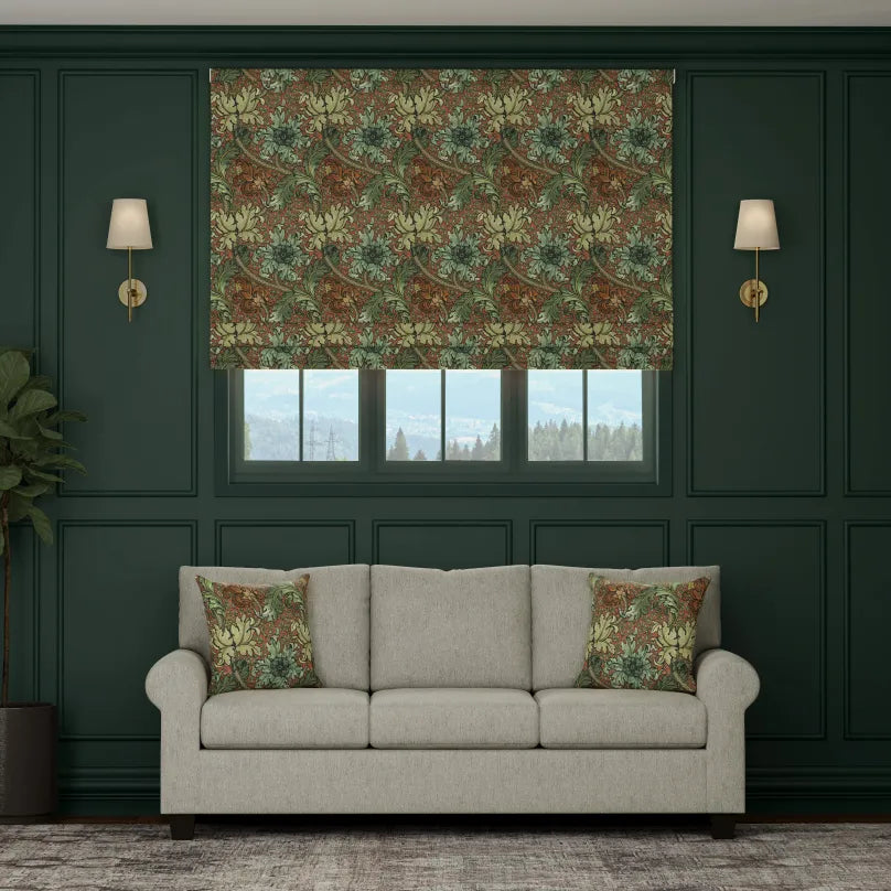 This made-to-measure Roman blind from the HOUSE Llewelyn-Bowen Morris Major collection combines classic elegance with tailored precision. Crafted from 100% cotton, it features a refined scrolling leaf and floral pattern set against a warm background with rich green foliage accents. Designed to fit your window perfectly, this blind not only enhances privacy and light control but also adds a sophisticated, timeless appeal to any room. Ideal for those seeking a blend of traditional design and expert craftsmanship, it brings both style and functionality to your living space.