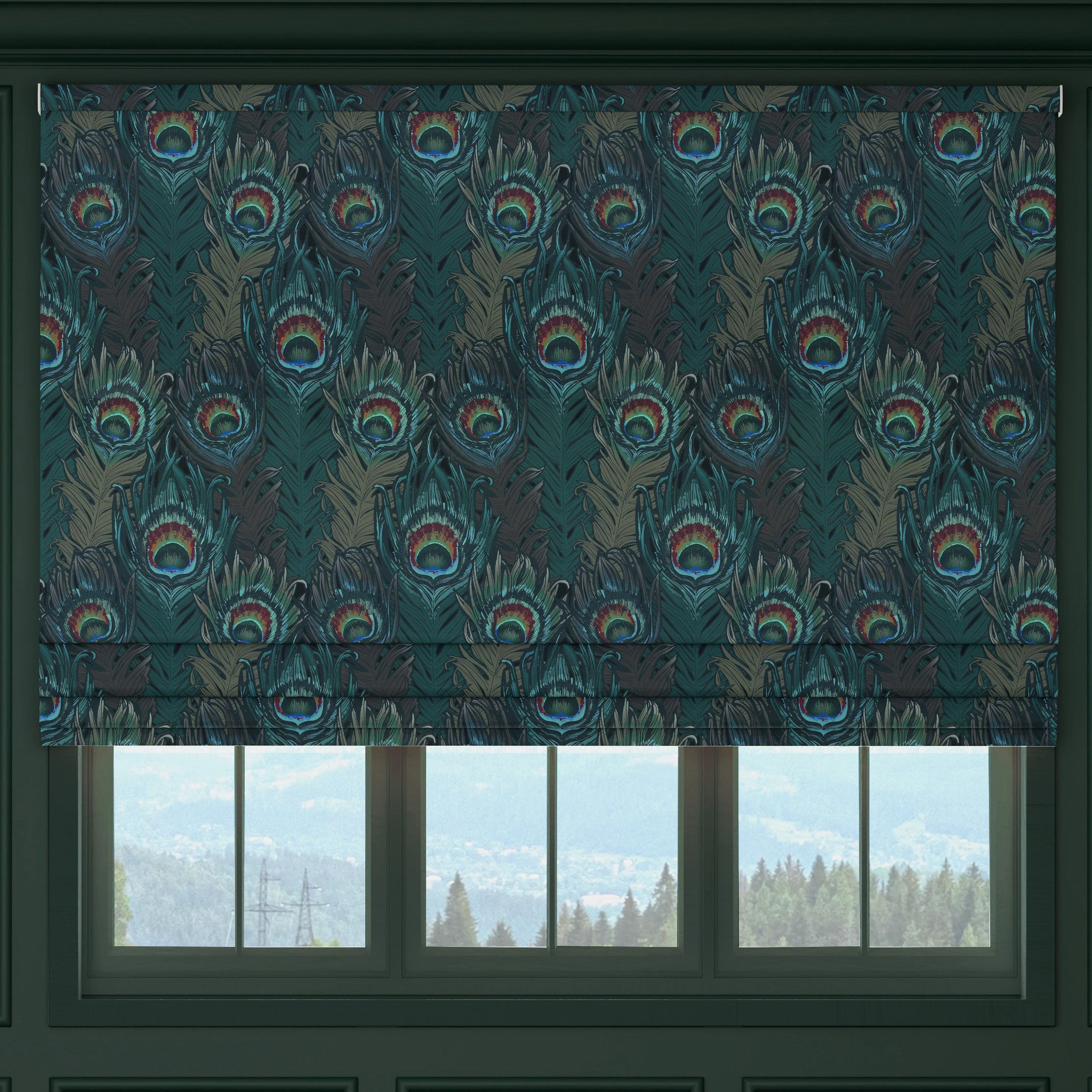 This made-to-measure Roman blind from the HOUSE Llewelyn-Bowen collection combines exquisite craftsmanship with striking design. Crafted from luxurious printed velvet, it features a detailed peacock feather pattern that adds depth and sophistication to any interior. The rich texture of the velvet not only enhances the visual appeal but also provides effective light control and insulation, helping to create a comfortable living space. Custom-sized to fit your windows perfectly, this blind brings a unique blend of style and functionality, ideal for elevating your home décor with a touch of elegance and expert design.