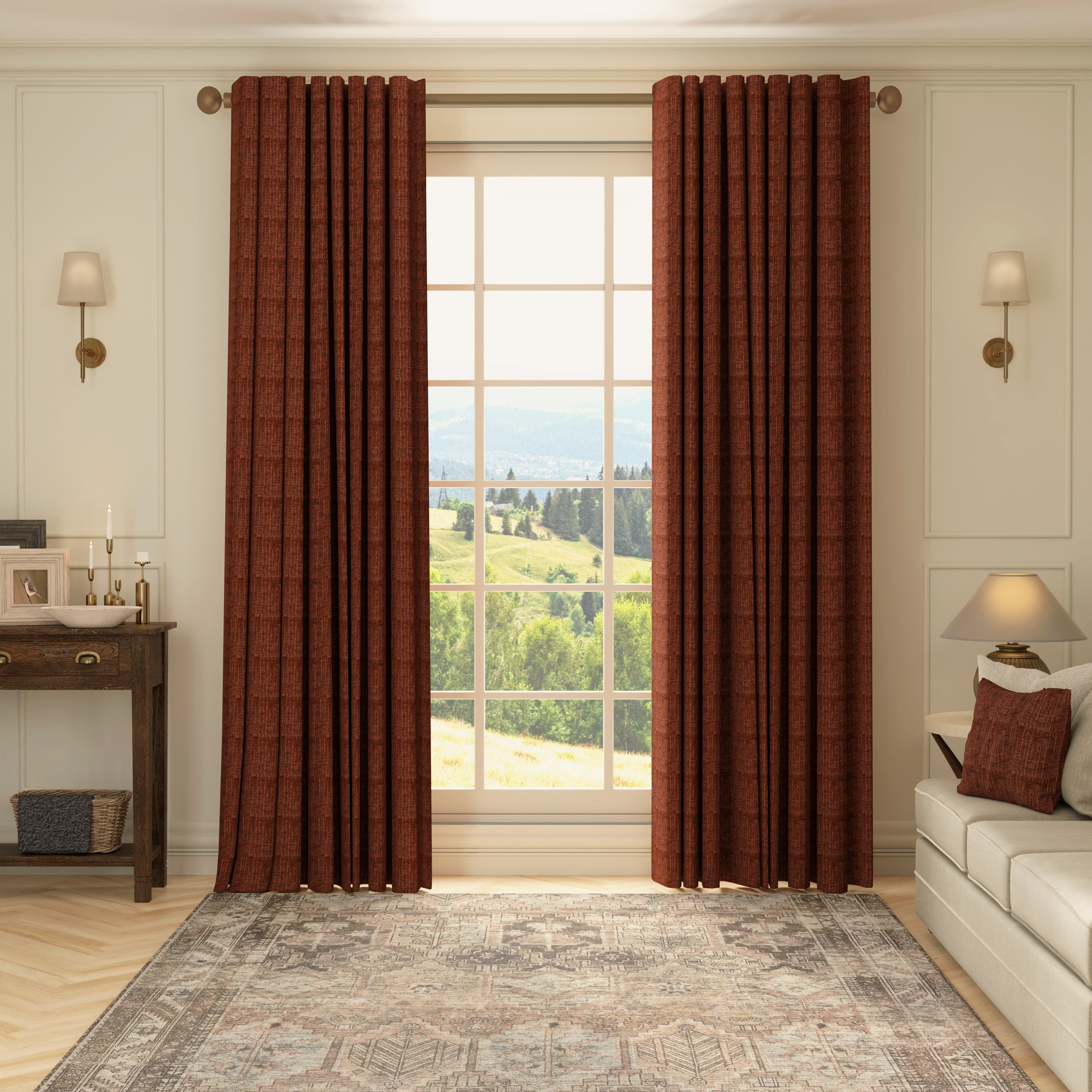 The HOUSE Llewelyn-Bowen Ottoman Made To Measure Curtains in Cinnamon bring a refined touch to your interiors with their expertly tailored design. Crafted from a subtle textured luxe chenille fabric, these curtains offer a rich, warm rusty orange tone that complements a wide range of decor styles. The made-to-measure service ensures a perfect fit for your windows, enhancing both aesthetics and function. Ideal for creating a cosy, sophisticated atmosphere, these curtains