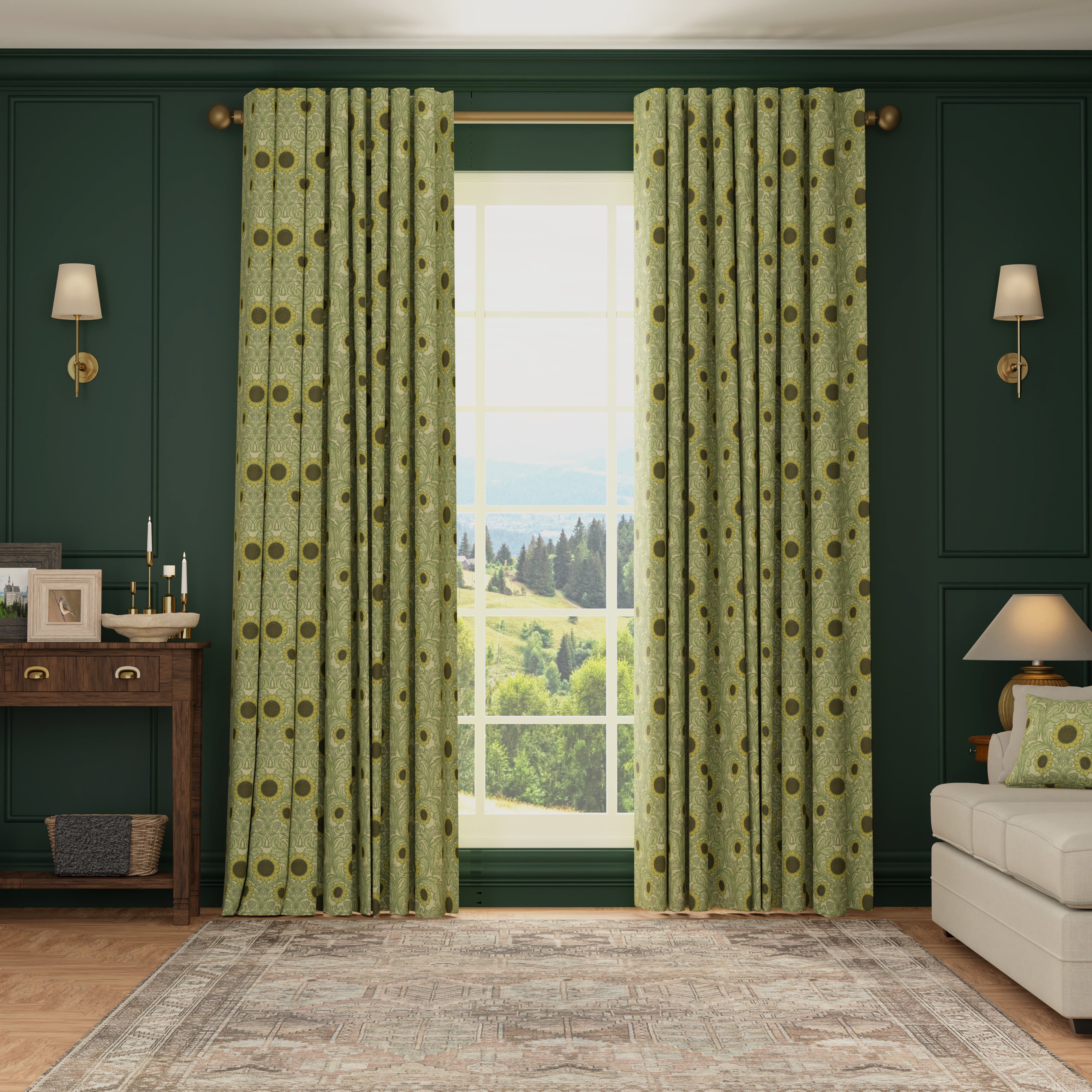 Elevate your living space with this pair of made-to-measure curtains from the HOUSE Llewelyn-Bowen collection, featuring the charming Sunny Side Up sunflower print. Crafted from 100% cotton, these curtains combine natural breathability with softness, ensuring comfort and durability. The vibrant sunflower design in fresh green and yellow tones brings a cheerful, uplifting atmosphere to any room. Tailored to your specifications, these curtains offer a perfect fit and add a sophisticated yet inviting touch to your home décor, harmonising style with practicality.
