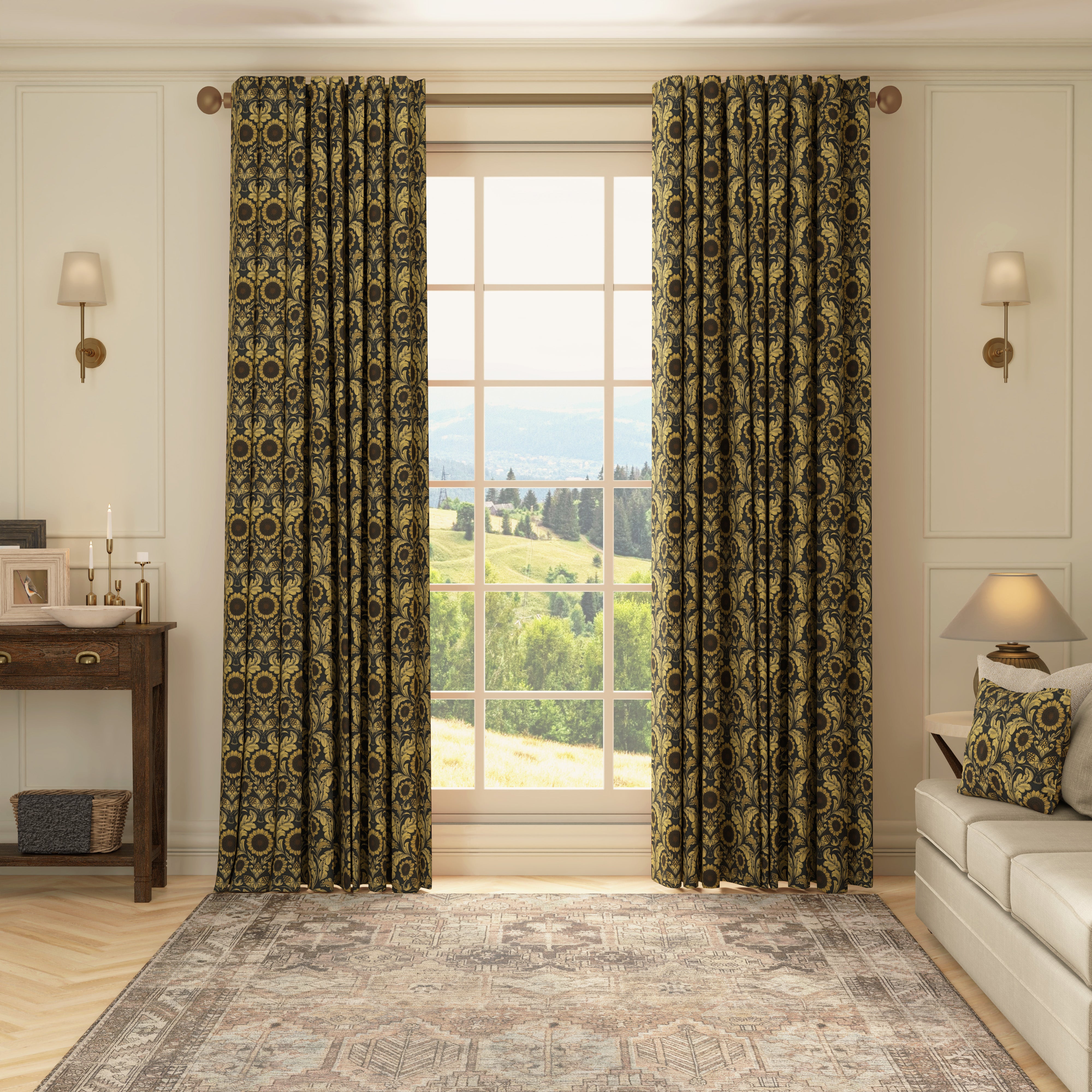 The HOUSE Llewelyn-Bowen Sunny Side Up Curtains in Midnight are expertly crafted made-to-measure window treatments tailored to fit your space perfectly. Featuring a striking sunflower print, these curtains combine rich black and golden hues to create a sophisticated, moody aesthetic that adds depth and warmth to any room. Made from 100% cotton, the fabric offers durability along with a soft texture that enhances comfort while blocking light effectively. Designed to elevate interiors, these curtains blend contemporary style with classic appeal, making them an ideal choice for those seeking both elegance and functionality in window dressings.