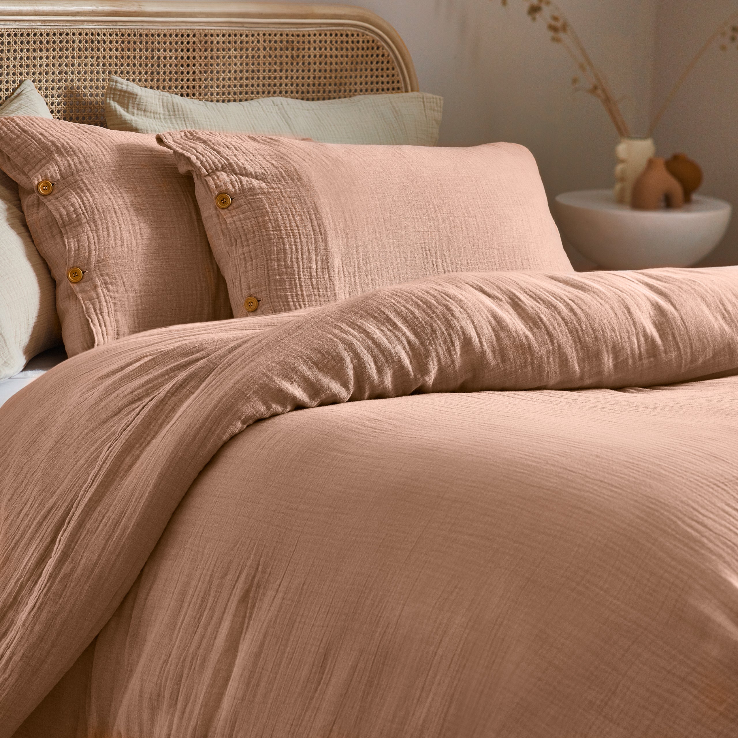 Take inspiration from timeless, traditional fabrics with the Lark Muslin Cotton Bedding Set in Pink Clay. Crafted from double-layered, soft muslin cotton, this set comes in a variety of soft pastel hues and features a charming wooden button closure. Its crinkle texture adds a cosy and stylish touch to any bedroom. Use it all year round - breathable and cool during the summer and snug and warm in the winter. Both sides feature muslin for a simple yet contemporary design. This product is also certified by OEKO-TEX®, ensuring its sustainable production.