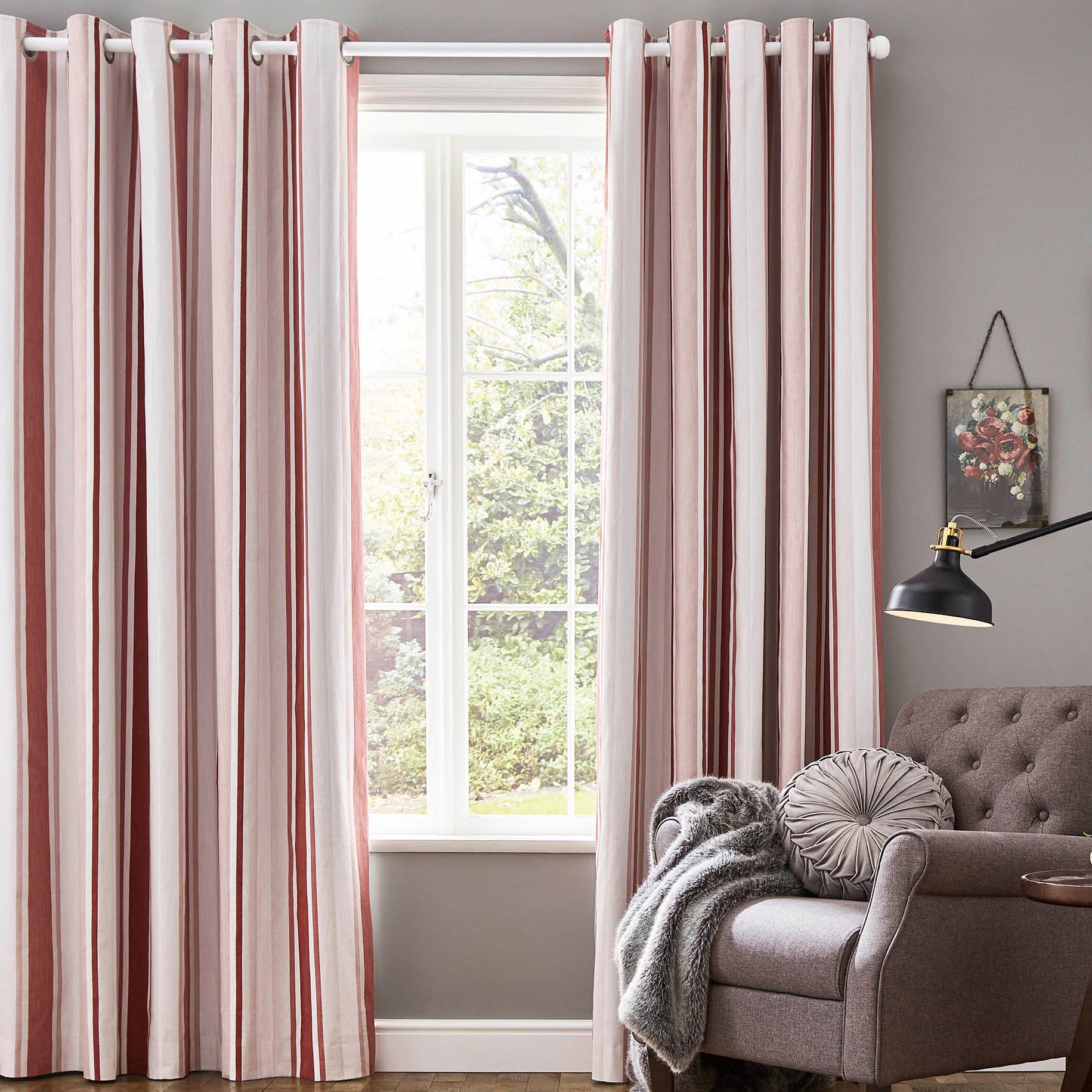 Laura Ashley Awning Stripe Blackout Ready Made Eyelet Curtains Crimson Laura Ashley Awning Stripe Blackout Ready Made Eyelet Curtains Crimson