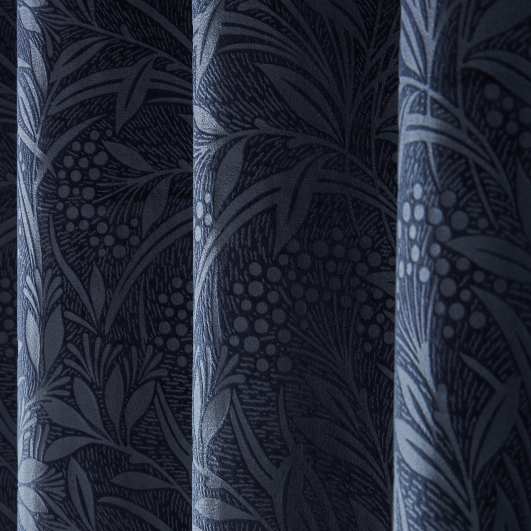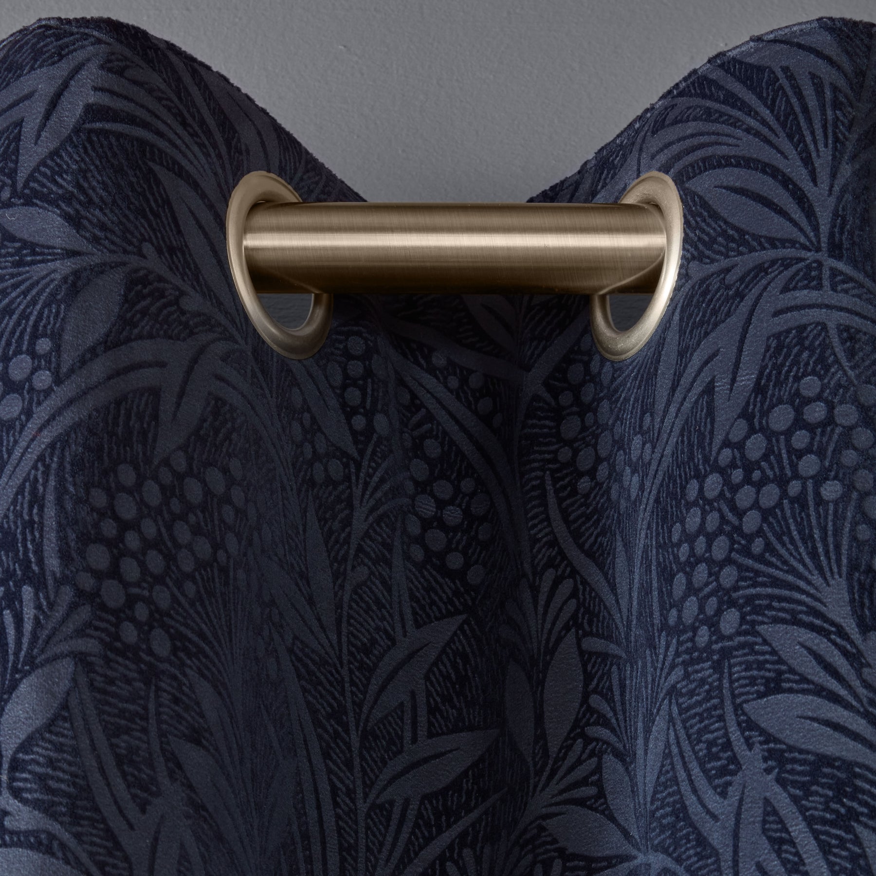 Expertly add a touch of elegance to your living space with the lavish Barley curtain. Delicately embossed onto opulent velvet, this design features intricate foliage and sprigs. In a deep Midnight Blue shade with an eye-catching eyelet header.