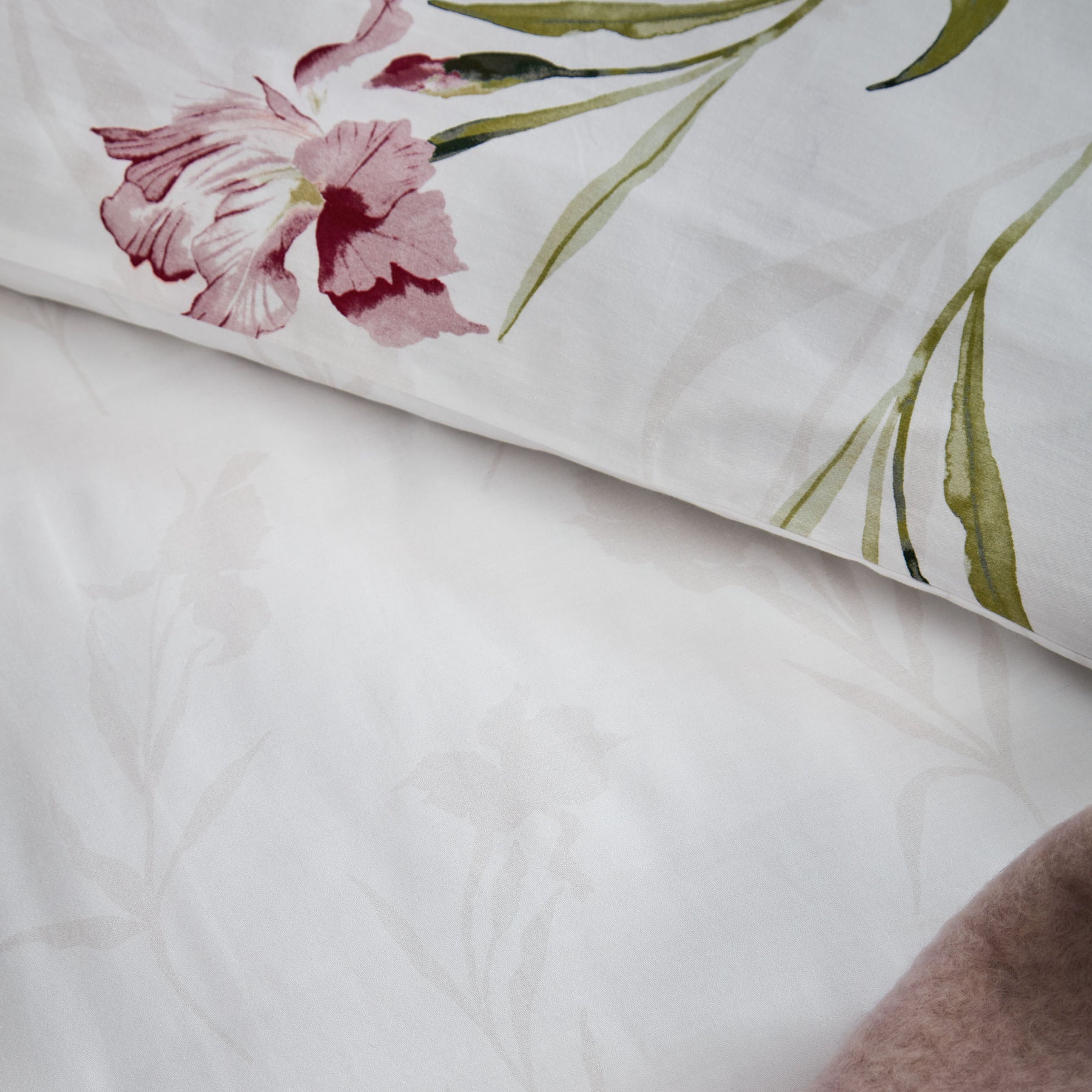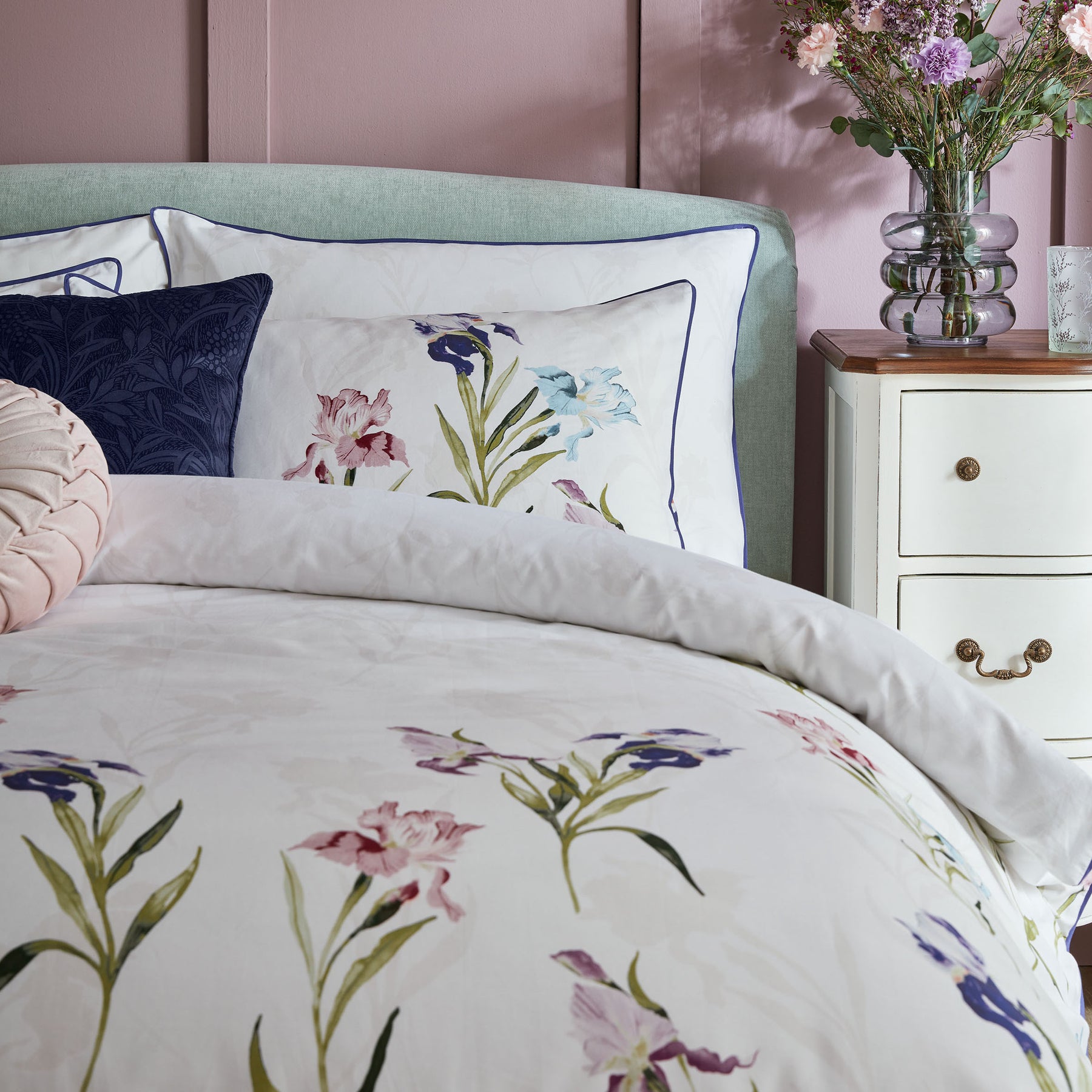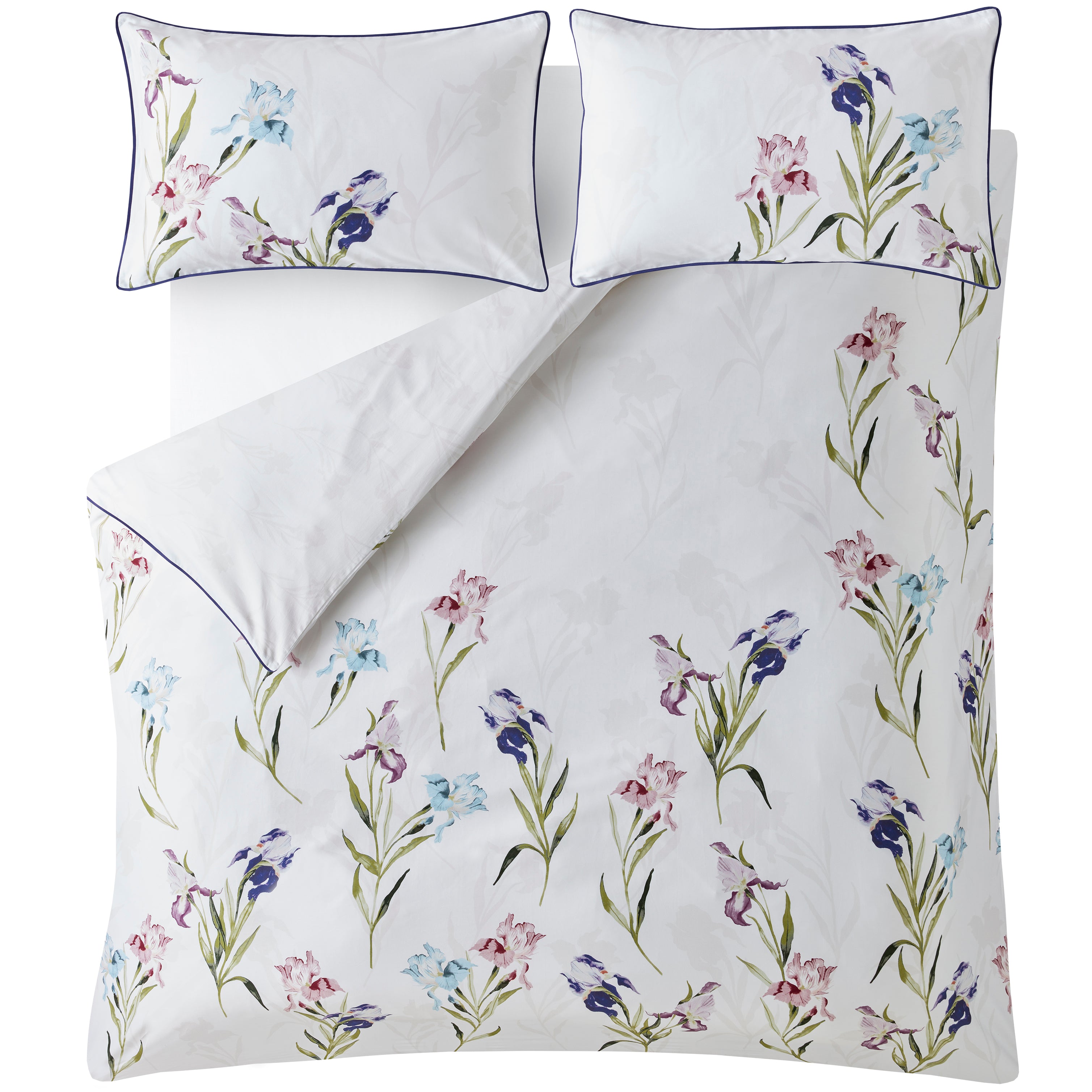 This luxurious 220TC cotton sateen bedding features trailing iris stems in rich jewel tones. The reverse showcases a delicate floral silhouette, complemented by a deep purple flat piped trim for a refined finish. This elegant set creates a bold floral accent in your bedroom and is offered in single, double, king, and super king sizes. Each set contains a duvet cover and two pillowcases (one pillowcase with the single set). Additional pillowcases can be purchased separately.