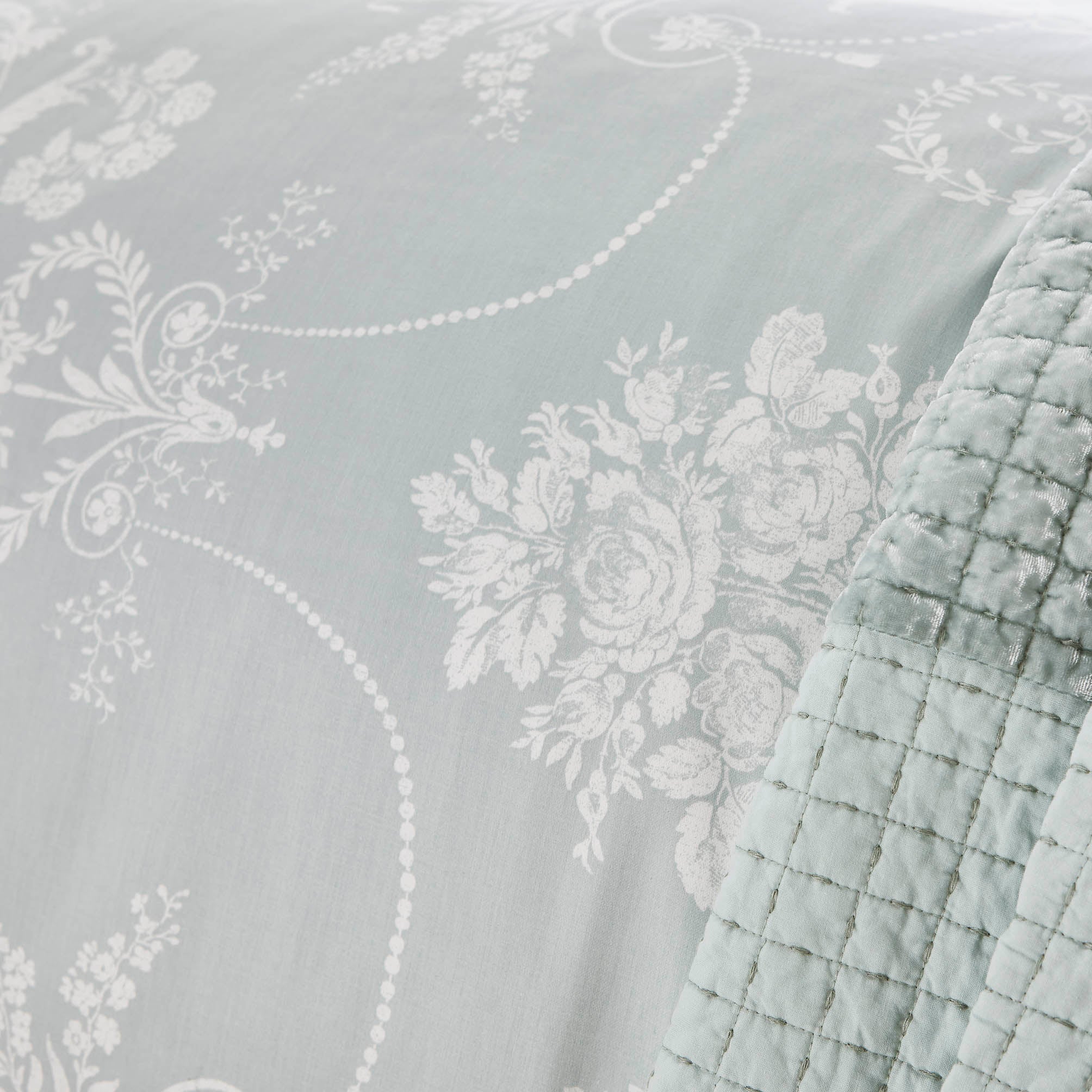 Inspired by 18th-century French design, the Laura Ashley Josette duvet cover set in Duck Egg features delicate curlicue florals printed on soft, 200 thread count pure cotton sateen. This reversible bedding adds refined chateau charm to your bedroom and includes matching pillowcases—one for single sets, two for larger sizes. Additional pillowcases can be purchased separately. Available in single, double, king, and super king sizes, the set offers versatile styling with quality craftsmanship.
