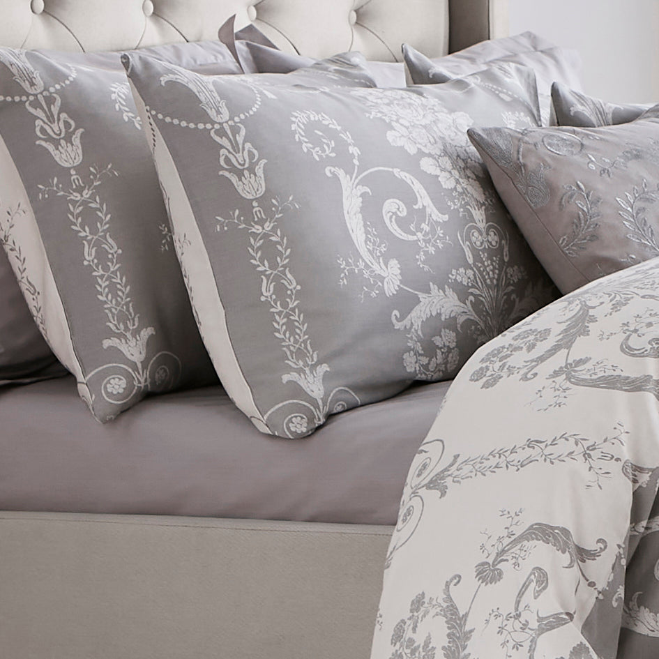 These Josette pillowcases in Steel feature delicate curlicue floral patterns inspired by 18th-century French design, adding refined chateau charm to your bedroom. Made from pure cotton, they are reversible, offering two styling options for versatile elegance.