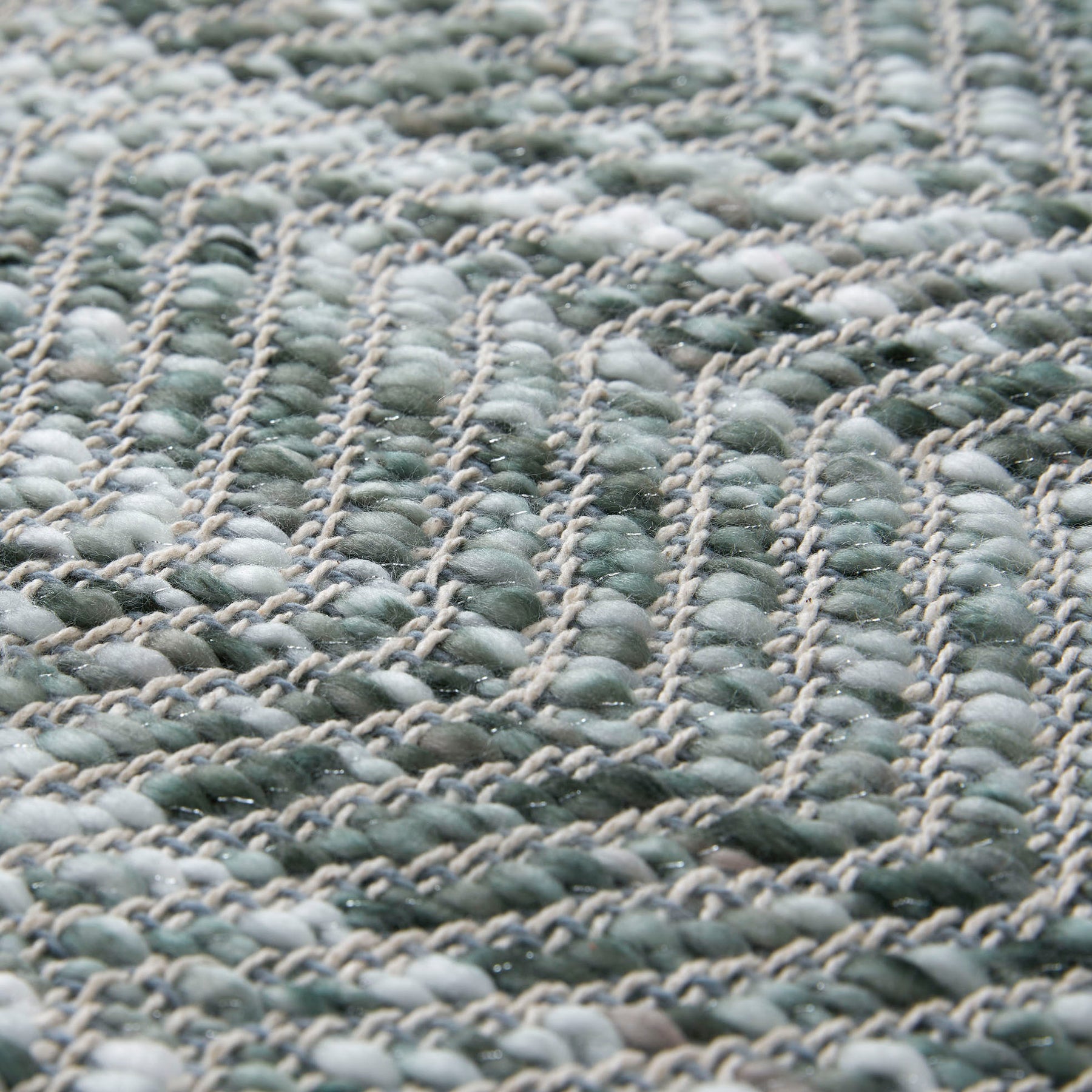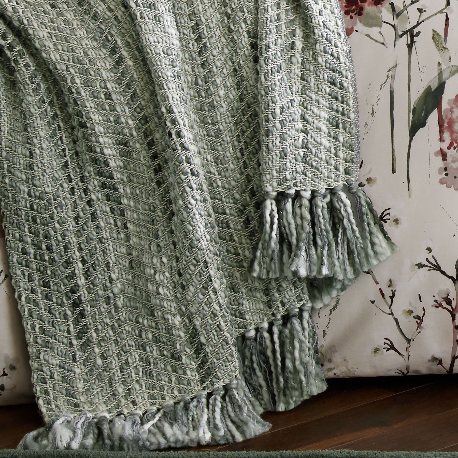 This elegant throw features a harmonious blend of soft sage green shades, enhanced by subtle metallic yarn and delicate tonal fringes. It promises to bring a refined and luxurious ambiance to your home.