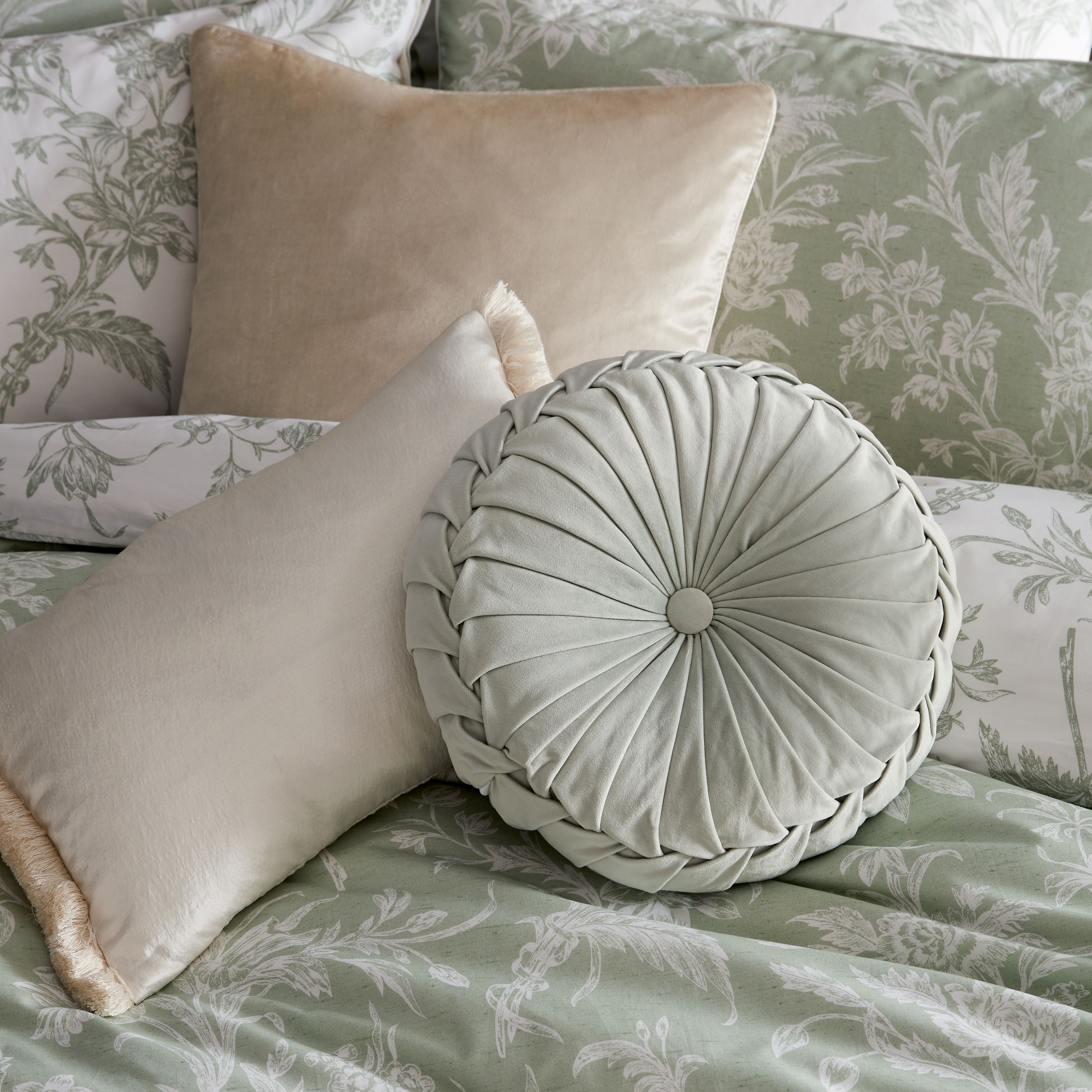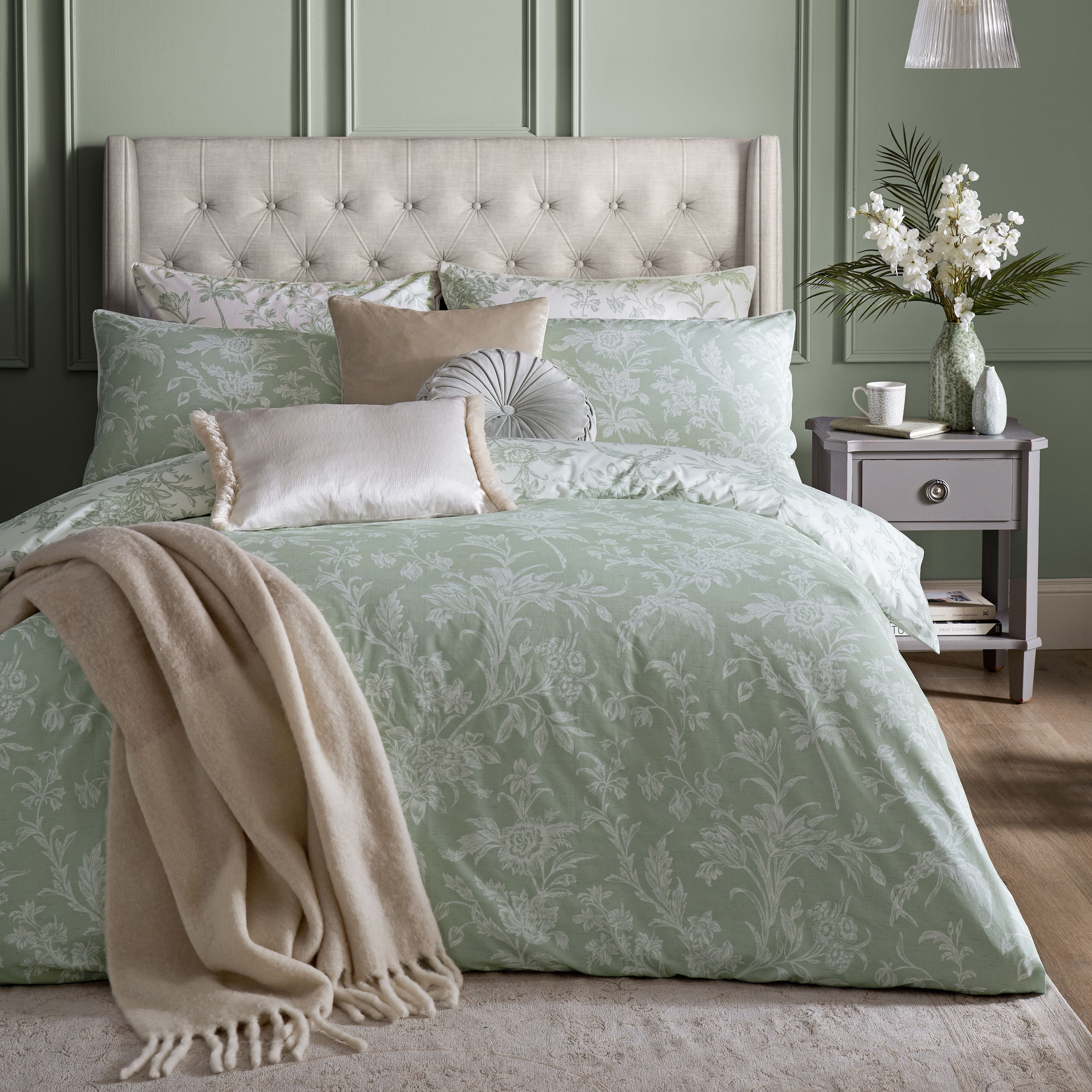 This Lloyd bedding set exudes timeless elegance with its printed floral pattern showcasing delicately curved stems of tulips, primulas, and potentillas. The finely detailed, hand-drawn design is printed on a 100% cotton percale fabric with a 200 thread count, featuring a soft, natural color scheme against a soothing Sage green background. It brings a fresh and tranquil ambiance to any bedroom, ideal for a refined and sophisticated look. Available in single, double, king, and super king sizes, each set includes a duvet cover and two pillowcases (one pillowcase with the single set). Pillowcases can also be purchased separately.