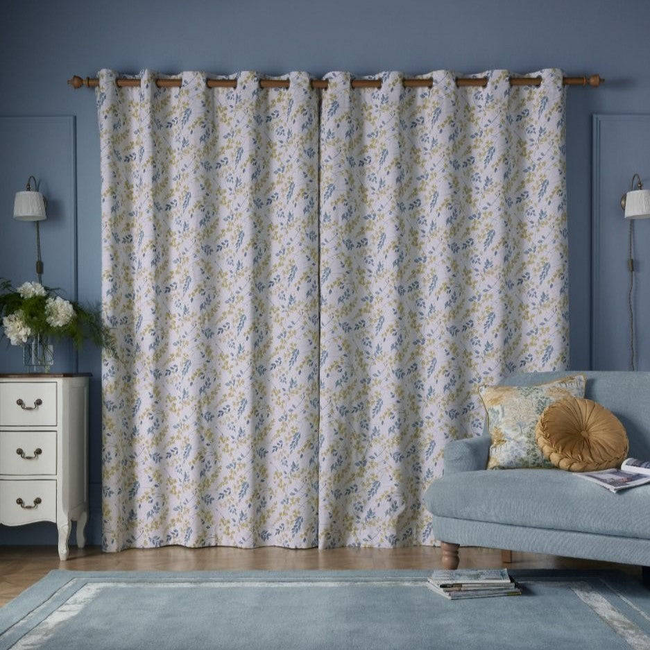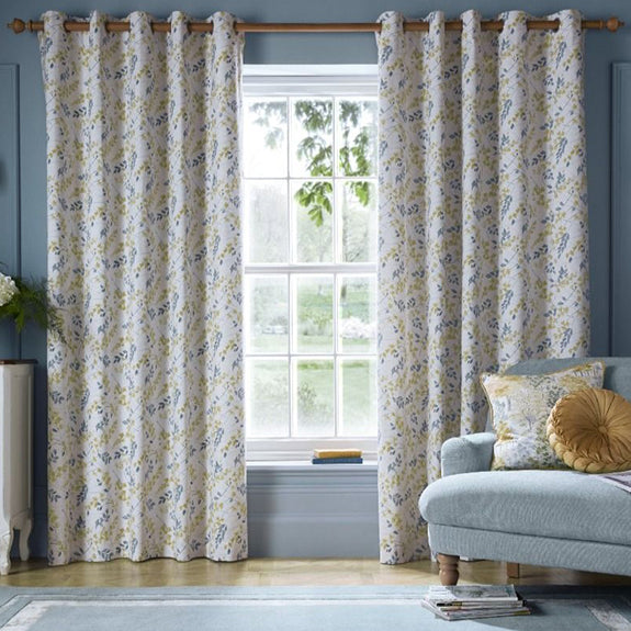 Upgrade your living area with the Laura Ashley Longston Sprig Ready Made Eyelet Curtains, made from 100% high-quality cotton. The design, inspired by an original paper artwork found in the Laura Ashley archives, showcases delicate watercolour flowers in shades of yellow and blue, intricately intertwined with trailing stems.