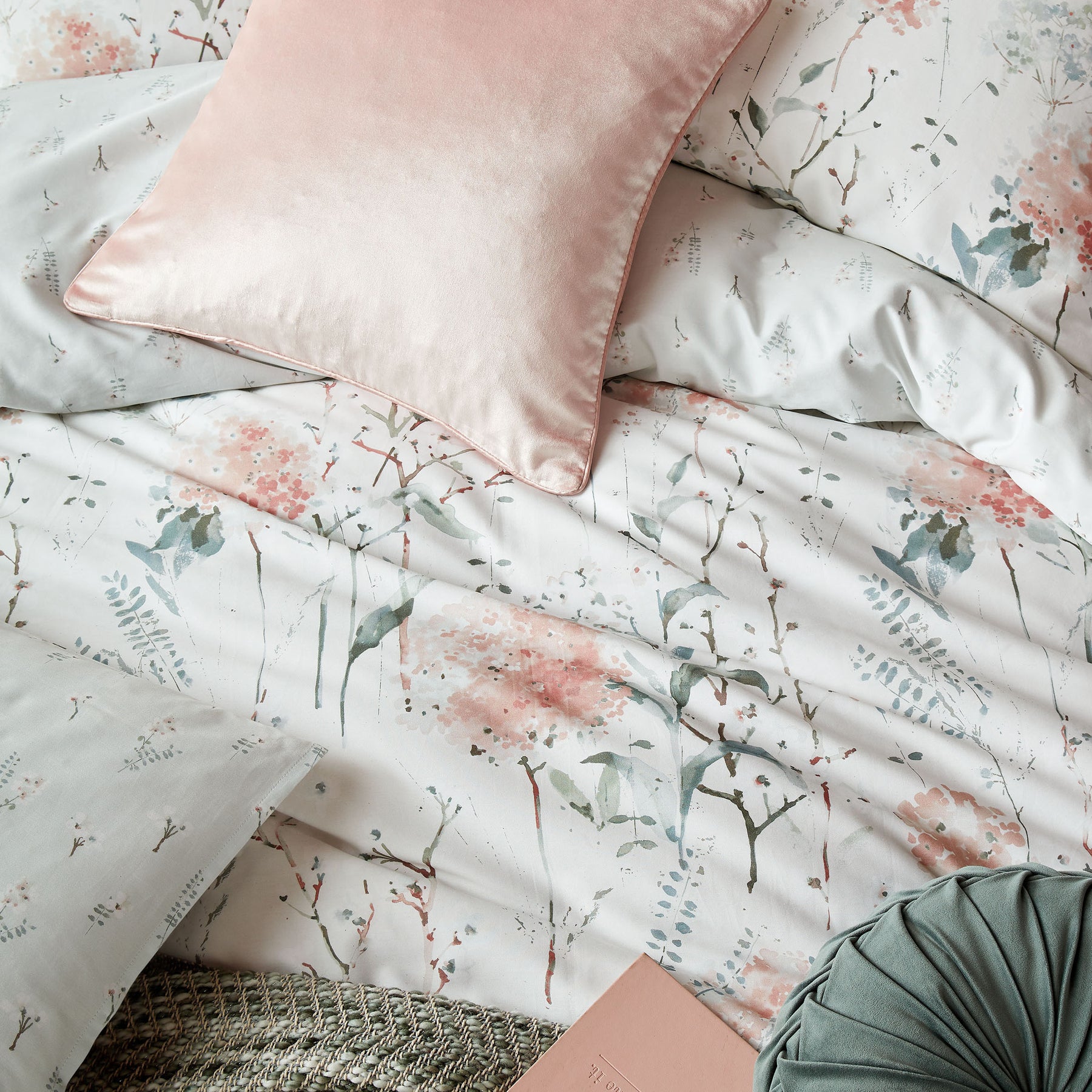 The Pallington Bloom bedding set combines elegance with modern design, showcasing delicate alliums and blossom branches rendered in a watercolor effect on premium 220TC cotton sateen. The reverse side features subtle, painterly sprigs and leaves in soft plaster pink and sage green hues. Offered in single, double, king, and super king sizes, each set includes a duvet cover and two pillowcases (one pillowcase with the single set). Additional pillowcases can be bought separately.