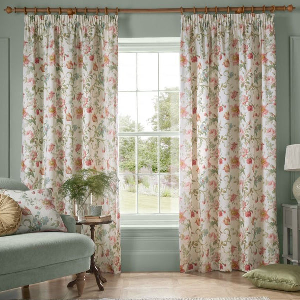Rosalind is a stunningly beautiful large-scale floral pattern printed on a cotton linen curtain with a stylish pencil pleat header. This design, found in the Laura Ashley archive, showcases blooming flower buds and elegant scrolling leaves, bringing the charm of an English country garden into your home.