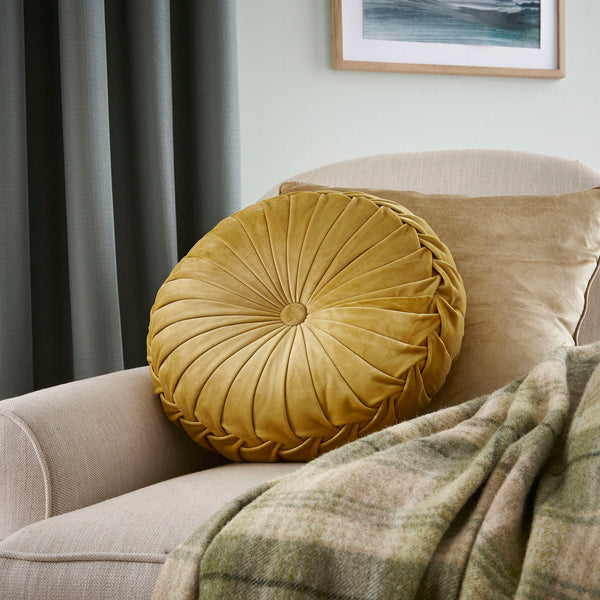 The Rosanna cushion, crafted from rich velvet, displays graceful pleats that form an eye-catching round shape. It is offered in a chic colour selection including Fern, Almond, Amber, Sage, Dark Seaspray, Blush, Steel, and Terracotta, making it a stylish addition to any room.