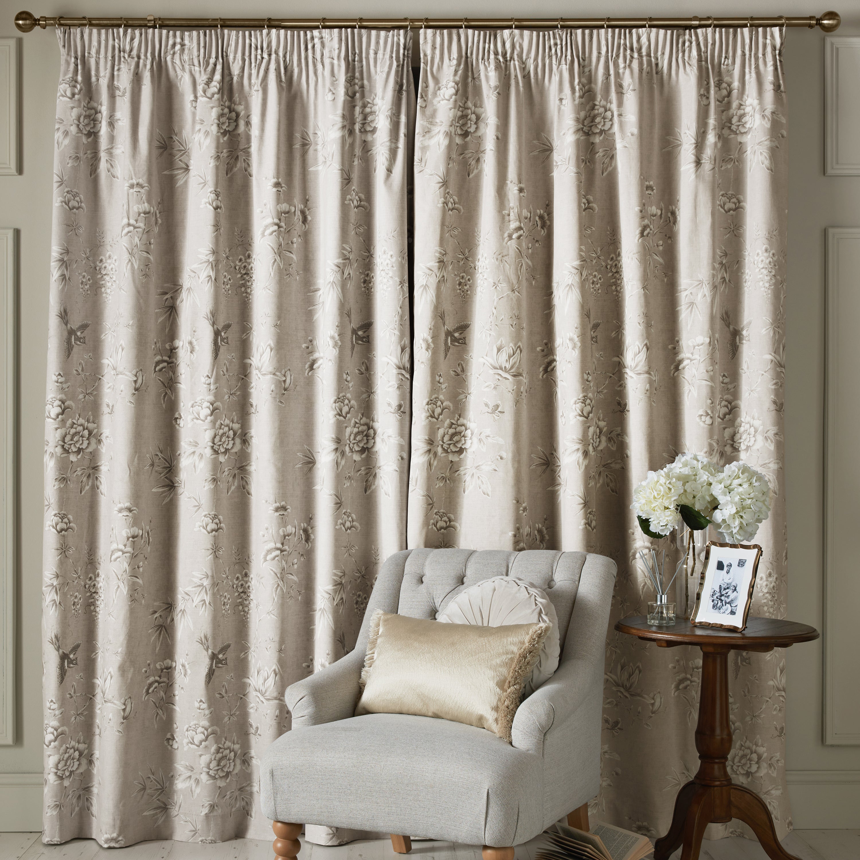 Experience the beauty and sophistication of the Rowsham Garden Ready Made Blackout Curtains. Featuring a charming design of Wisteria, Peonies, and Magnolias in a timeless and elegant Chinoiserie style, these curtains are sure to impress. The warm natural tones and crisp white accents are complemented by a slub textured ground, and the pencil pleat header and blackout lining enhance the overall functionality of the curtains.