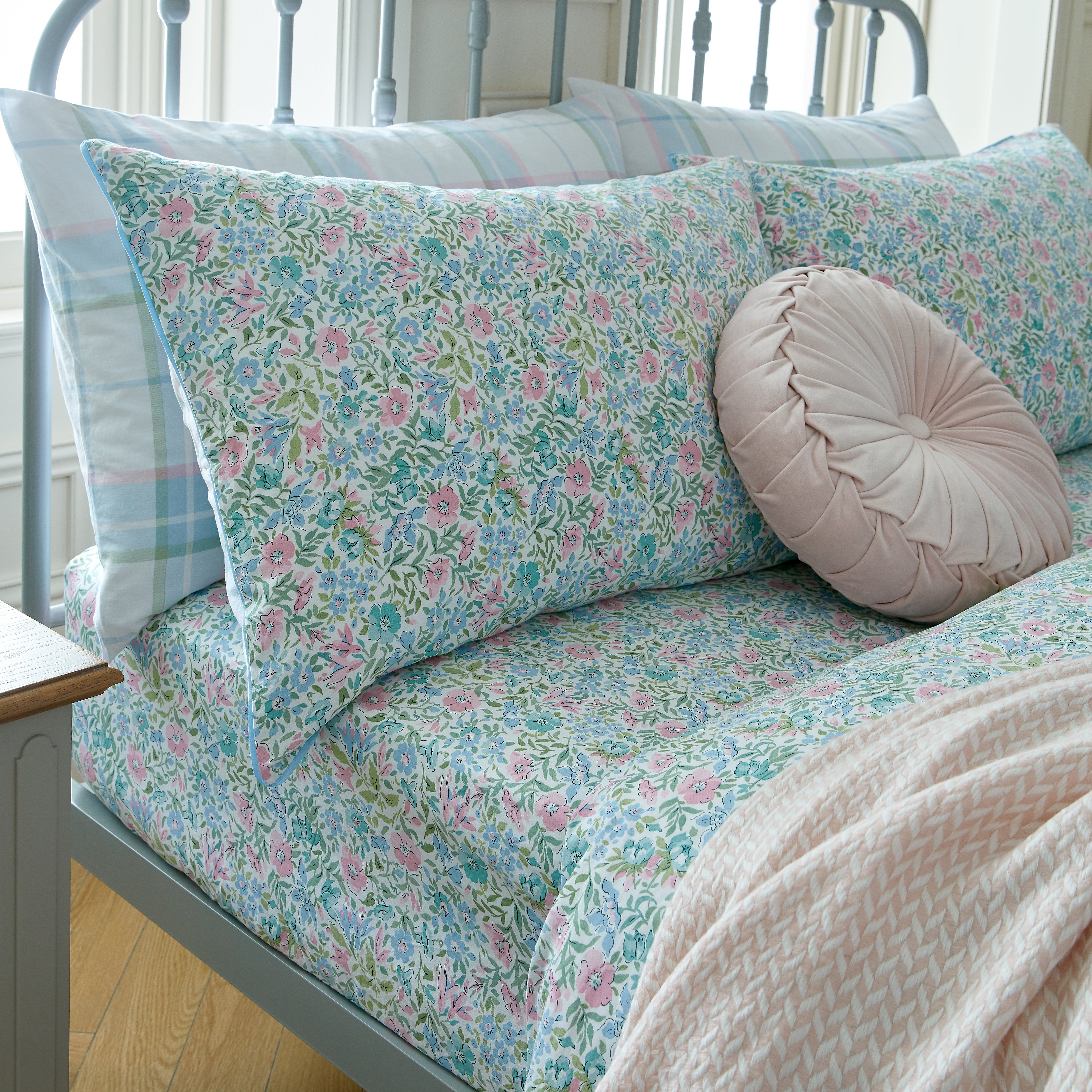 The Sherston pattern features an elegant and detailed floral motif inspired by poppies and fuchsia-like flowers. This gouache-style print, part of the Laura Ashley archive, displays gentle shades of pink, blue, and green on a fitted sheet made from 100% washed cotton. Available in single, double, king, and super king sizes, it combines timeless elegance with superior quality.