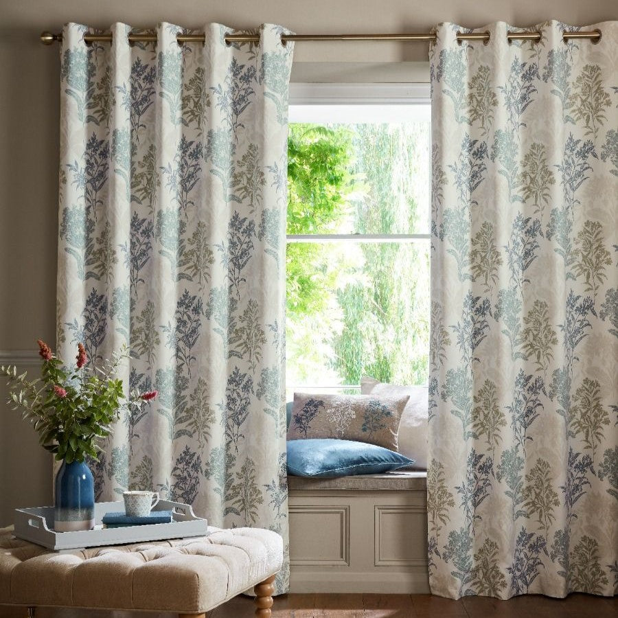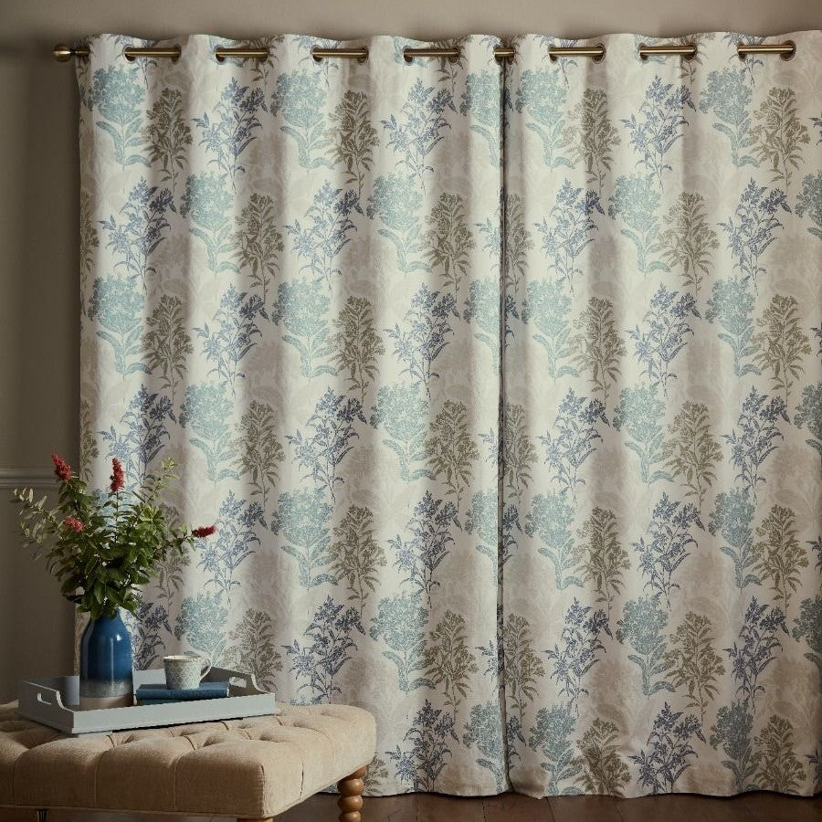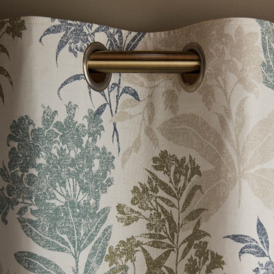 As a product expert, I must highlight the stunning design and top-quality material of Laura Ashley Tenby Ready Made Eyelet Blackout Curtains. This exquisite curtain boasts a large-scale print of silhouette flower and berry sprays, sourced straight from the Laura Ashley archive. Made from 100% cotton and featuring an eyelet header, this timeless print in beautiful Seaspray tones adds a touch of striking yet natural charm to any home.