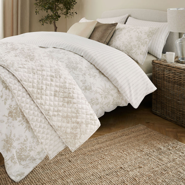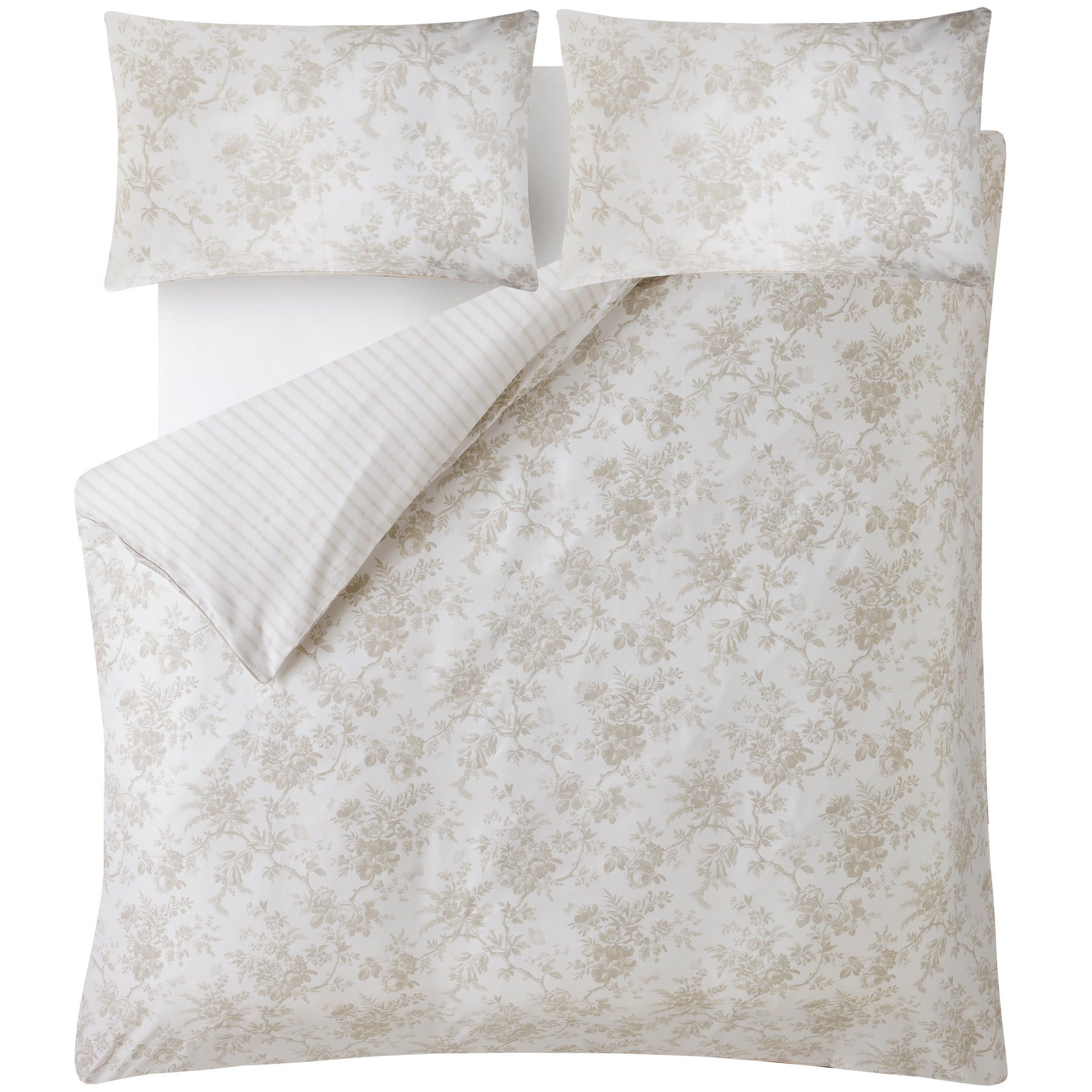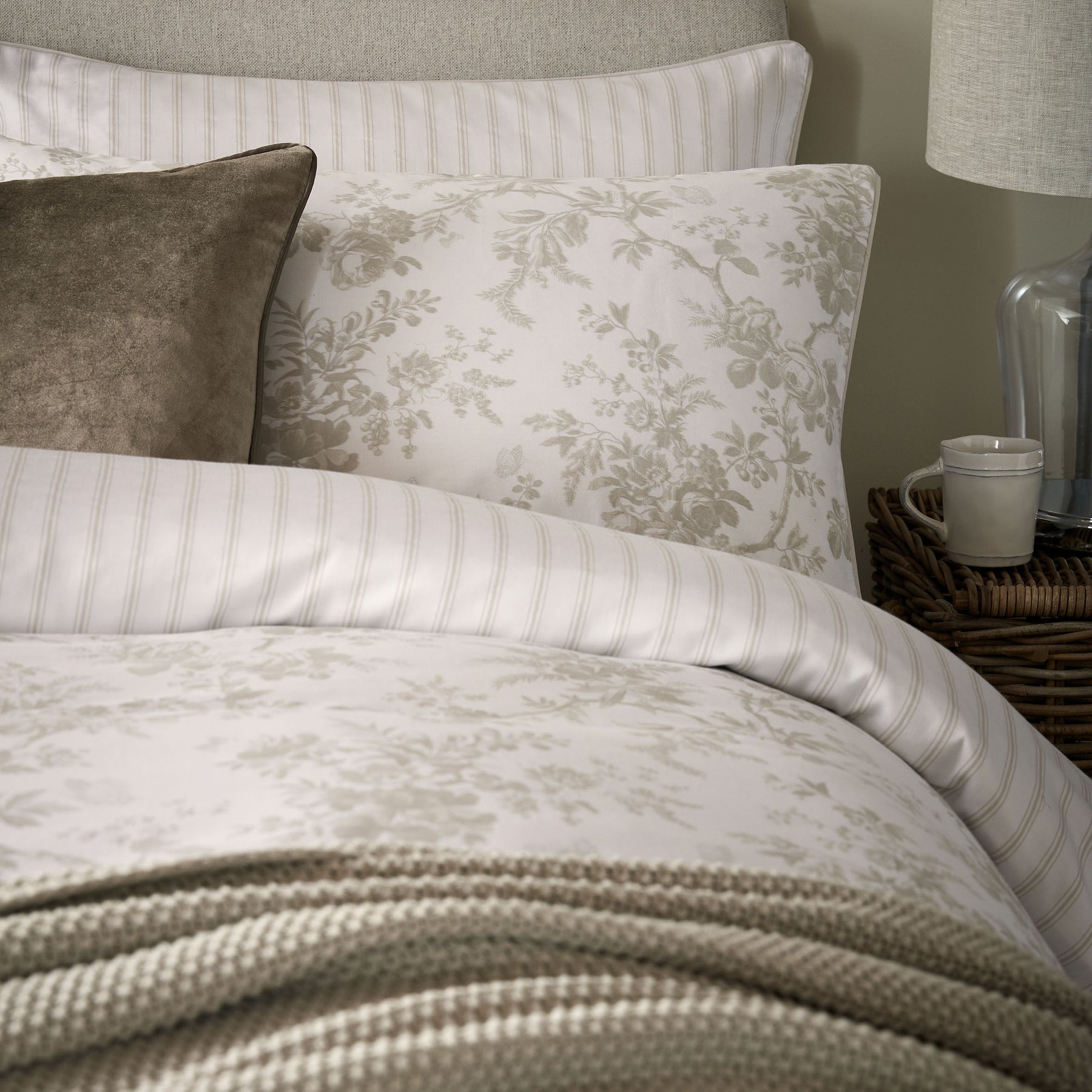 This elegant 200TC cotton sateen bedding set showcases a refined floral toile design with blooming roses, berries, and graceful butterflies in flight. The reverse features a classic tailored stripe, complemented by coordinated flat piped edging for a timeless finish. Available in single, double, king, and super king sizes, each set includes a duvet cover and two pillowcases (one pillowcase with the single set). Additional pillowcases can be purchased separately.