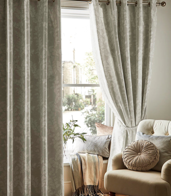 This elegant eyelet curtain features a subtle leaf pattern in warm, natural tones on a soft cotton ground. The gentle dove grey background adds to its charm and complements the overall soothing atmosphere.