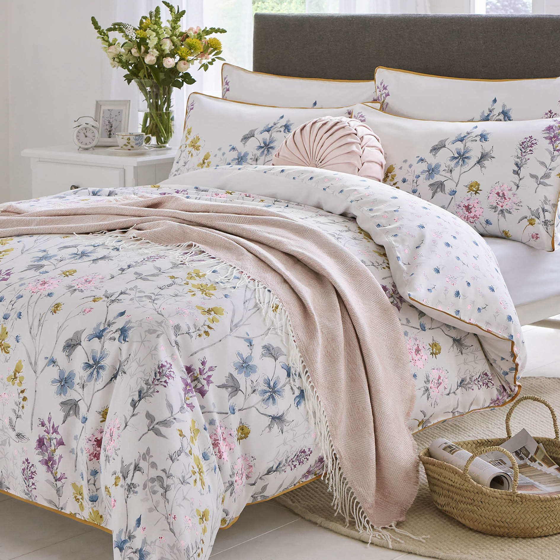 Refresh your bedroom with the Laura Ashley Wild Meadow Duvet Cover, crafted from 200-thread-count pure cotton for comfort and durability. The front showcases delicate watercolor blossoms in soft blues, yellows, and pinks, offering versatile styling options. The reverse side features a smaller-scale version of the print, maintaining the elegant design when the duvet is folded back. Available in single, double, king, and super king sizes, each set includes a duvet cover and two pillowcases (one pillowcase with the single set). Additional pillowcases can be purchased separately.