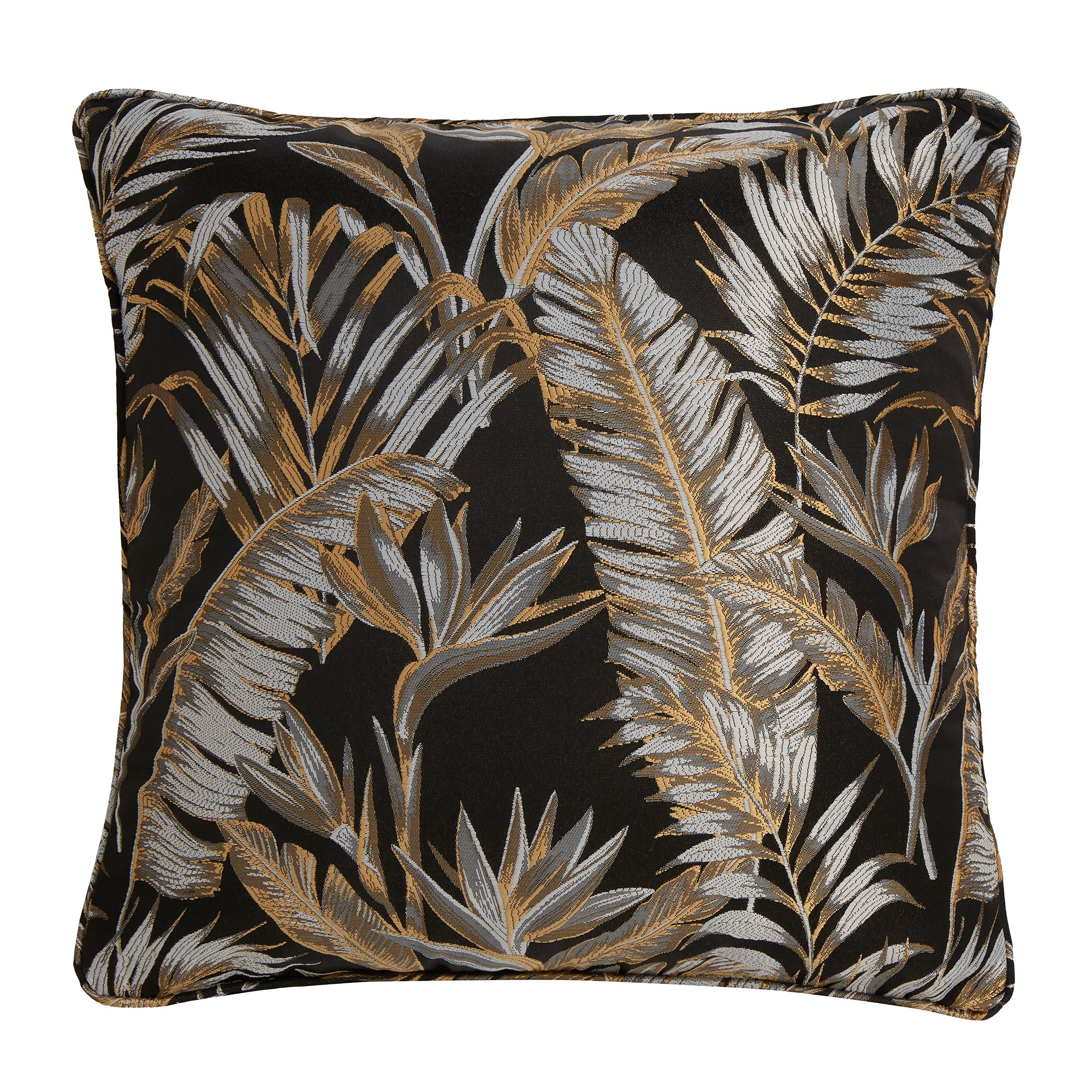 This cushion exudes prestige and exceptional craftsmanship, featuring gold jacquard palm leaves on a black background and elegant piped edges. Experience the ultimate opulence with this stunning addition to your decor.