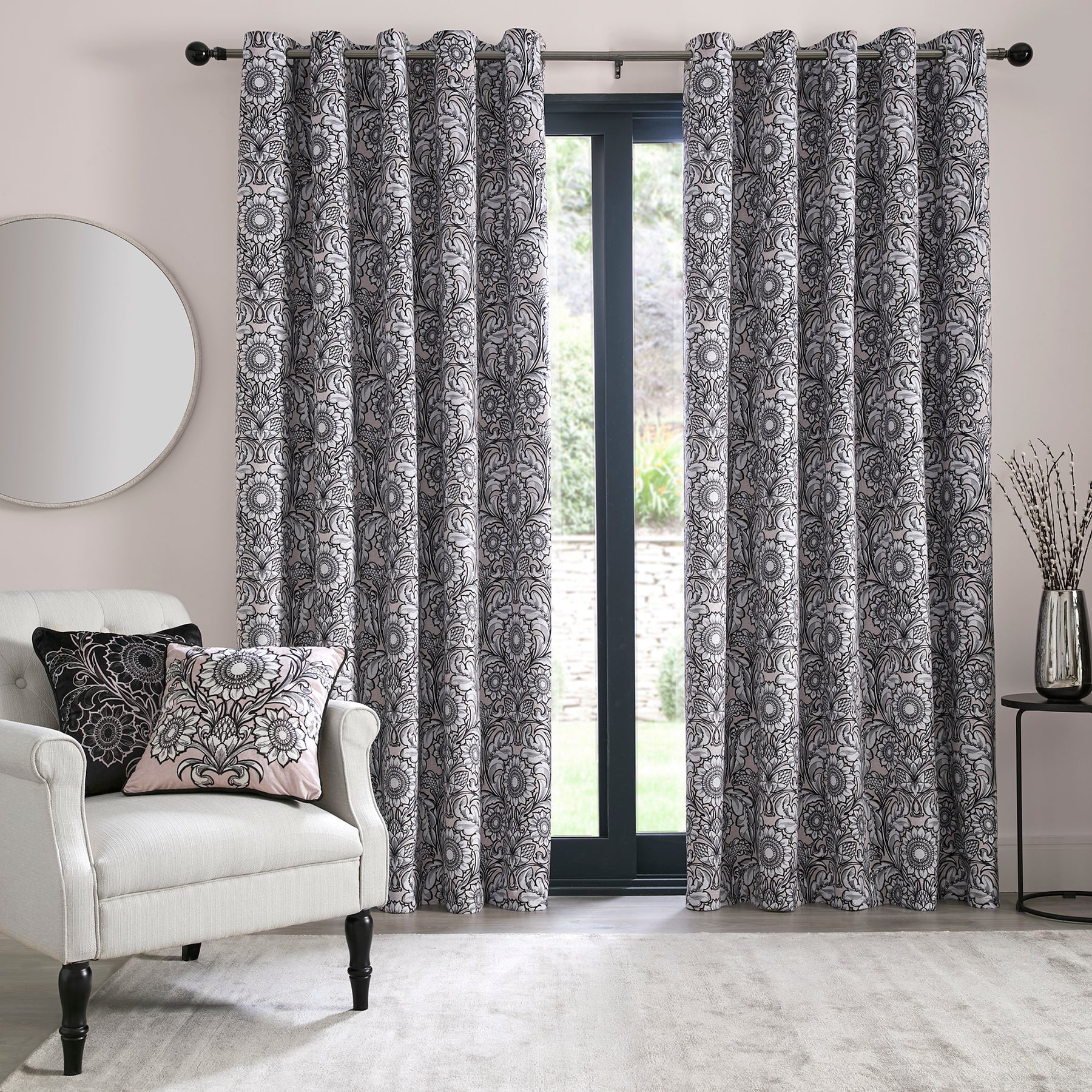 Elevate your space to new levels of elegance with the opulent and exclusive symmetrical floral motif design of these curtains on a velvet background. The blackout lining ensures tranquillity, making these curtains a perfect addition for creating a peaceful haven in your home. Indulge in sophistication with Romilly, the perfect choice for adding a touch of luxury to your interior.