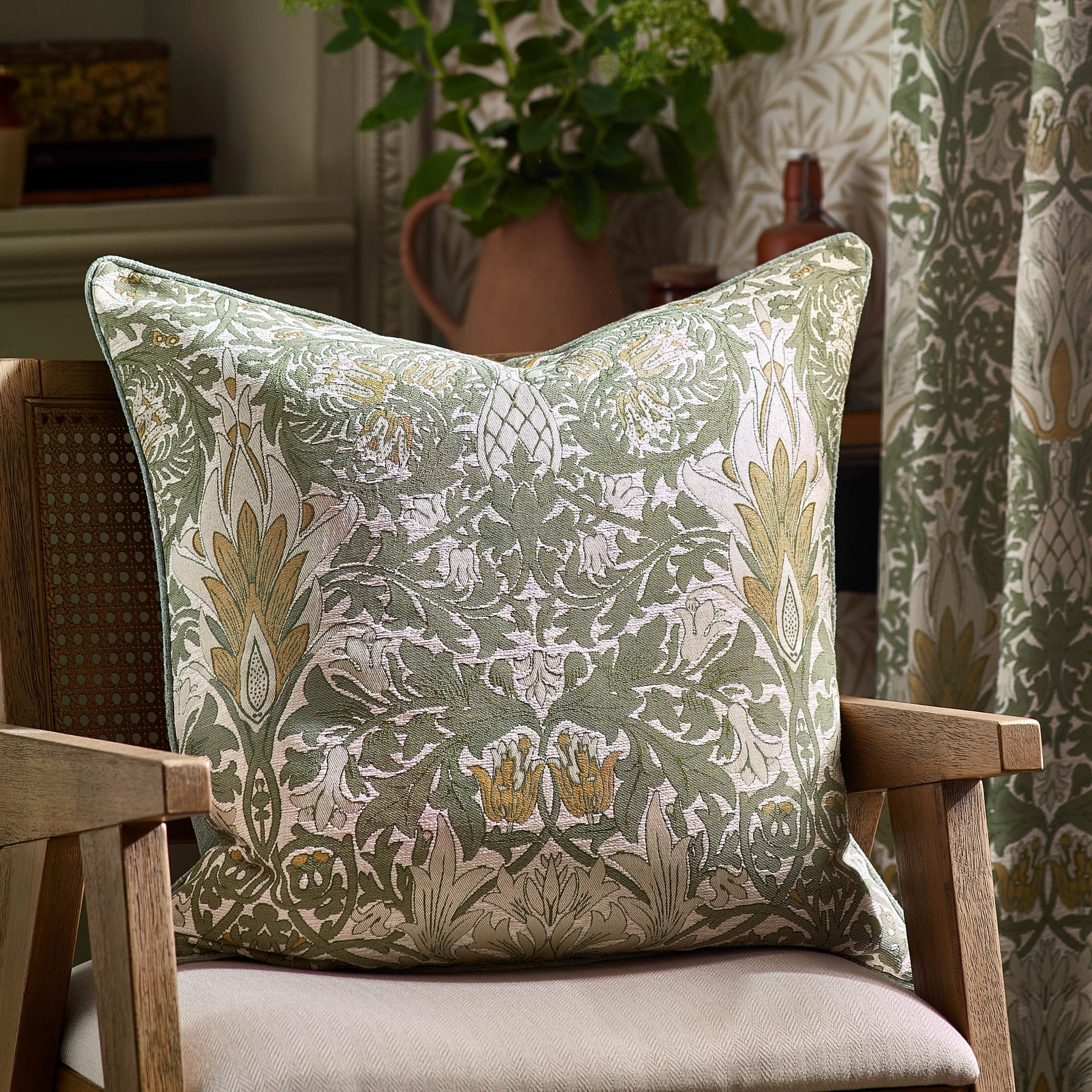 First created in 1876 by William Morris, Snakeshead features a striking flame-like design with spiky clusters of foliage, suspended by delicate scrolling tendrils in the background. This pattern was inspired by Indian textiles and was a personal favorite of Morris, named after the nodding blooms of the snakehead fritillary.