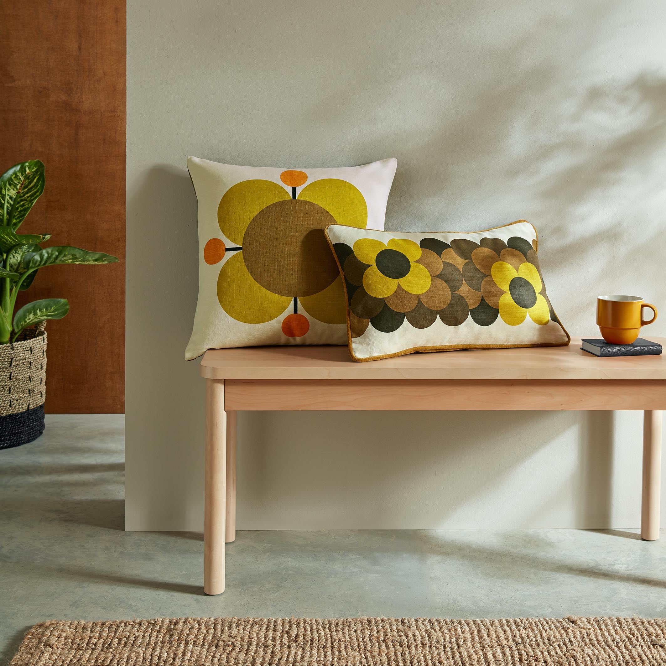 Featuring a vibrant mix of yellow and orange tones, the Atomic Flower cushion is an ideal way to infuse your home with a bold, vintage vibe. On the reverse, Orla Kiely's iconic Linear Stem design adds a touch of signature style.
