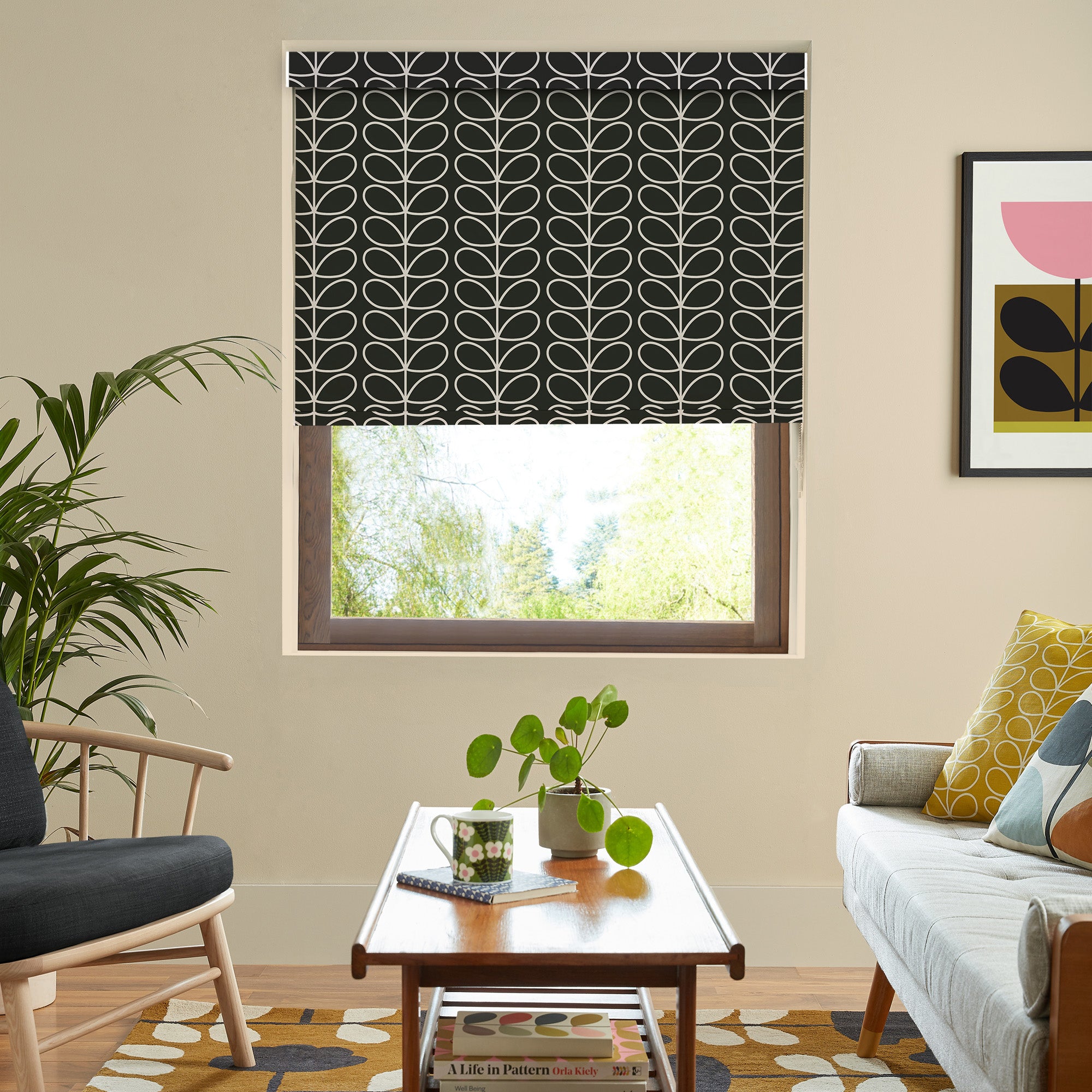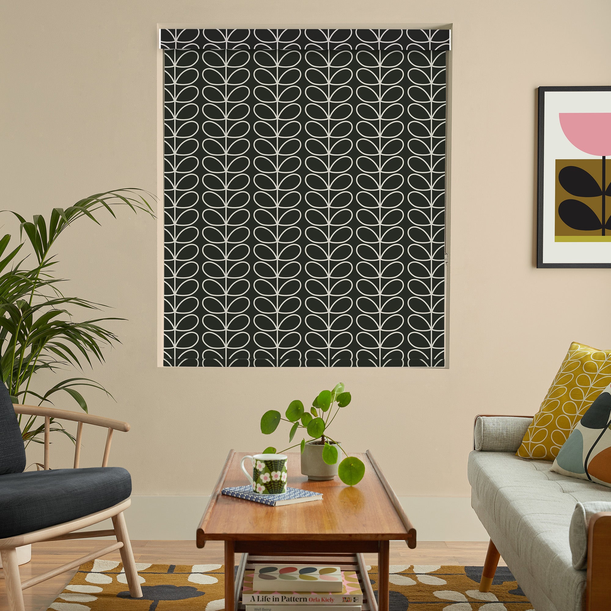 A fresh design for the Orla Kiely range. A wide variety of vibrant, feel-good colours are available in wonderful new geometric vintage floral motifs that are sure to brighten any room in the house. This custom made to measure blackout roller blind helps to block out light, making it a great choice for bedrooms. With the option to complete the design with a matching pelmet top, this attractive blind will fit nicely within or outside your window area.