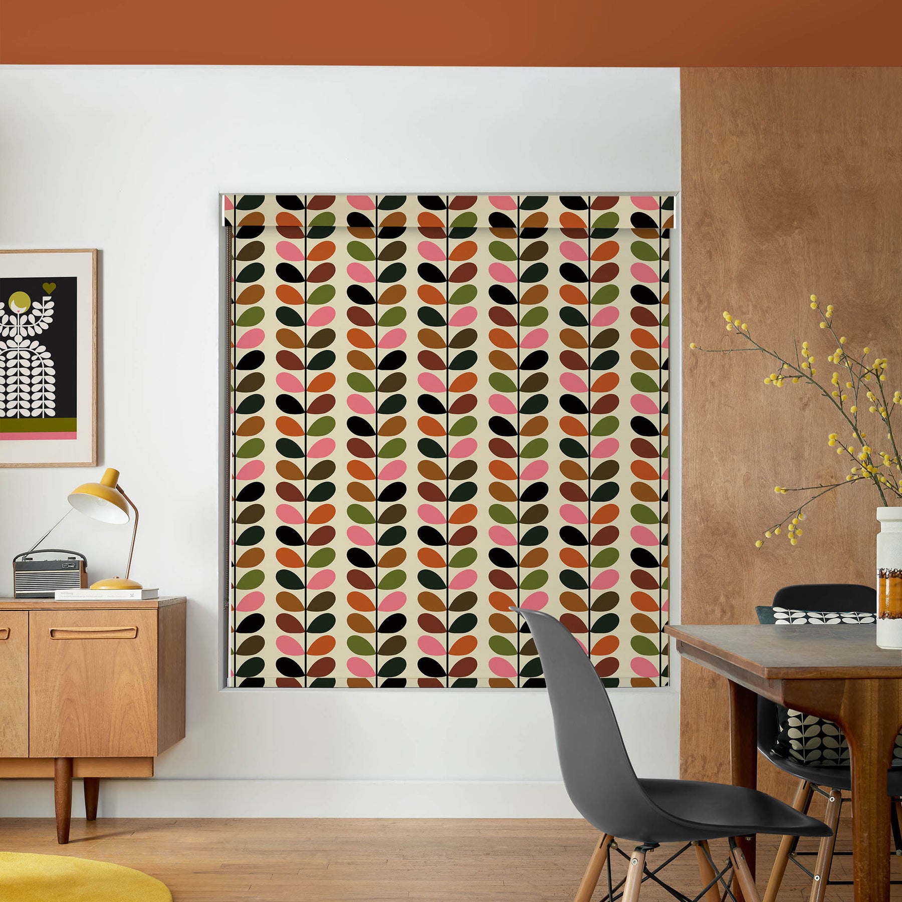 A fresh design for the Orla Kiely range. A wide variety of vibrant, feel-good colours are available in wonderful new geometric vintage floral motifs that are sure to brighten any room in the house. This custom made to measure blackout roller blind helps to block out light, making it a great choice for bedrooms. With the option to complete the design with a matching pelmet top, this attractive blind will fit nicely within or outside your window area.
