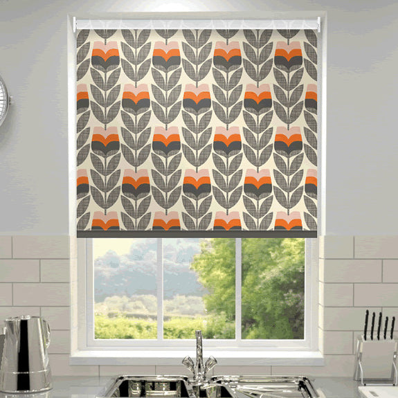 The Rose Bud design features a geometric rose style pattern that is filled in with sketchy style lines and blocks of colour. This stylish design is from the Orla Kiely light diffusing roller blind collection, the neutral background of this blind is enhanced with a coloured bottom bar. This made to measure designer roller blind features a 100% polyester blackout fabric which is white on its reverse. This type of blind is ideal for blocking light from entering through the fabric.