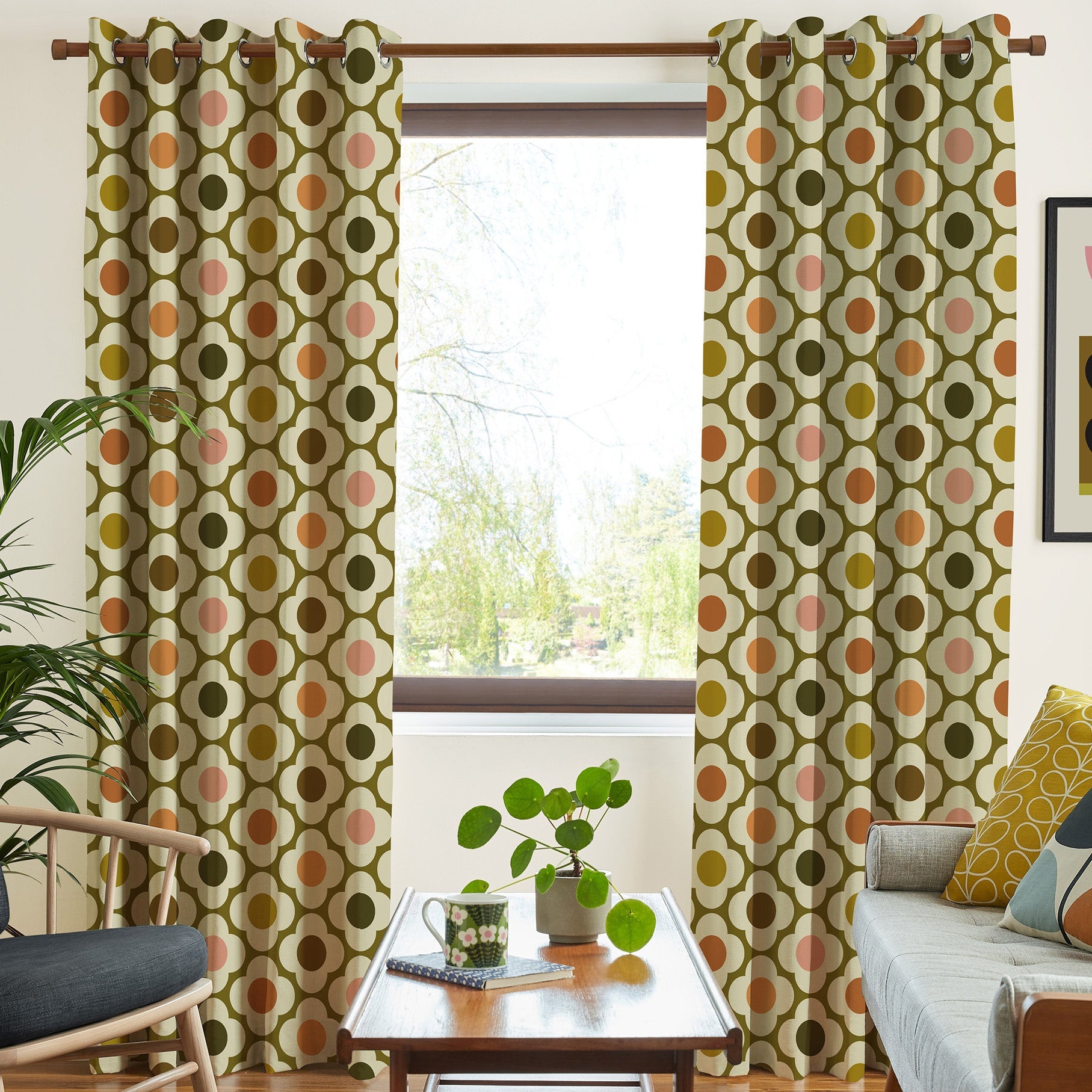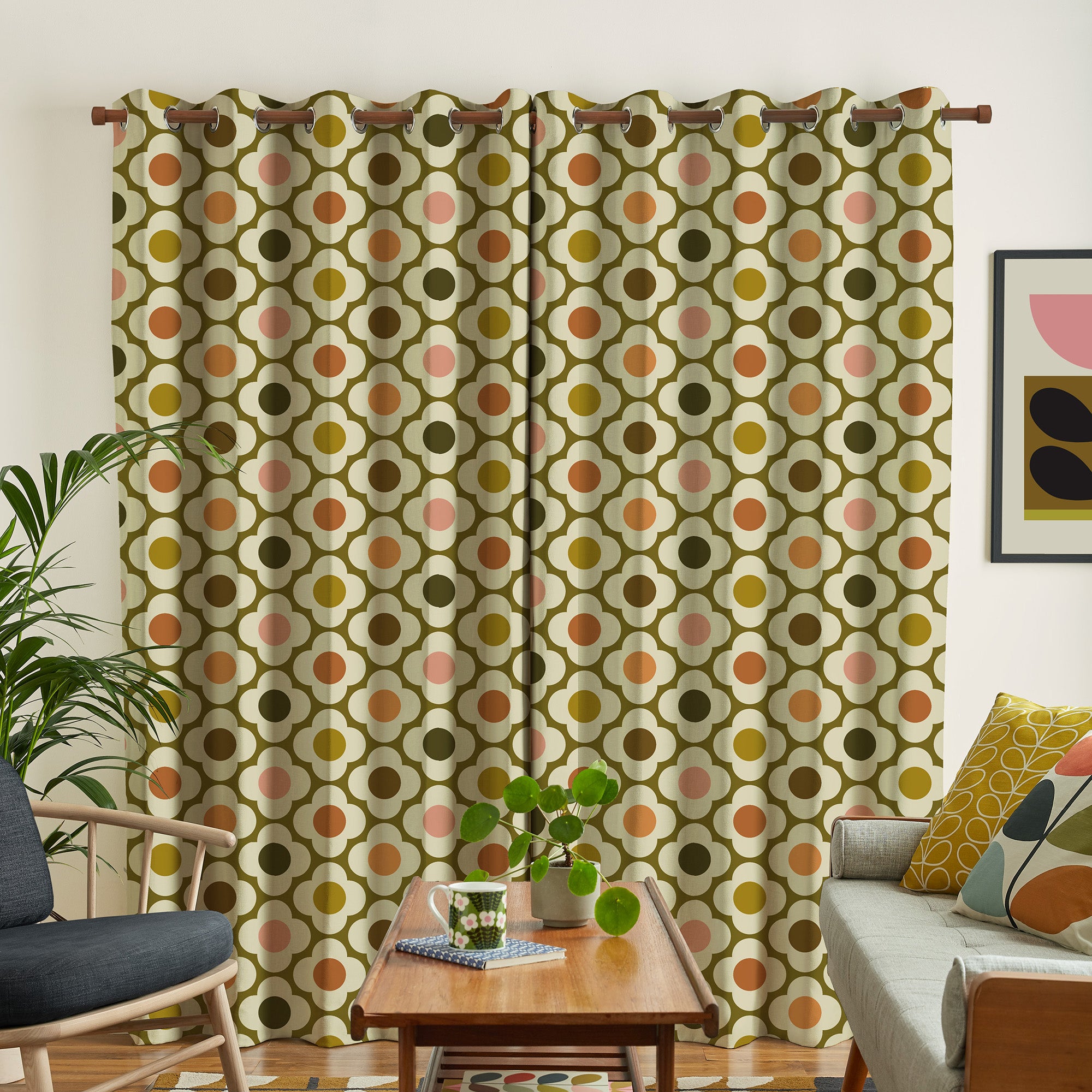Elevate your living space with this pair of made to measure curtains featuring Orla Kiely’s iconic Spot Flower design. The timeless four-petal flower pattern is presented in a structured, orderly repeat, creating a harmonious and stylish look. Rendered in a bold autumnal palette, rich brown and vibrant orange hues are beautifully complemented by subtle pops of green and pink, adding depth and character to your décor. Perfect for those seeking a retro-inspired yet sophisticated aesthetic, these curtains not only enhance your windows but also bring a natural, warm ambiance indoors with precision tailoring to fit your space seamlessly.
